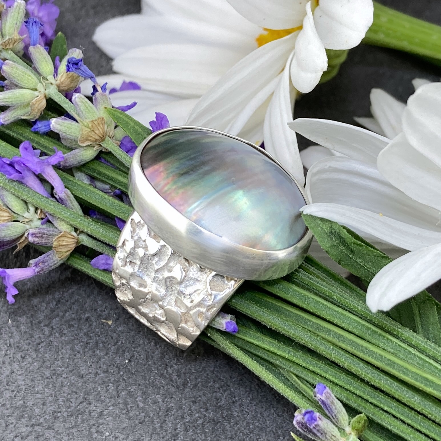 The Tahitian Pearl Ring Size 6.75 Argentium Silver Lunar Band blends gentle curvature with luminous depth. The pearl’s surface shifts between silver-grey, violet, and green — a soft reflection of moonlight across water. Its form feels calm yet full of quiet movement.