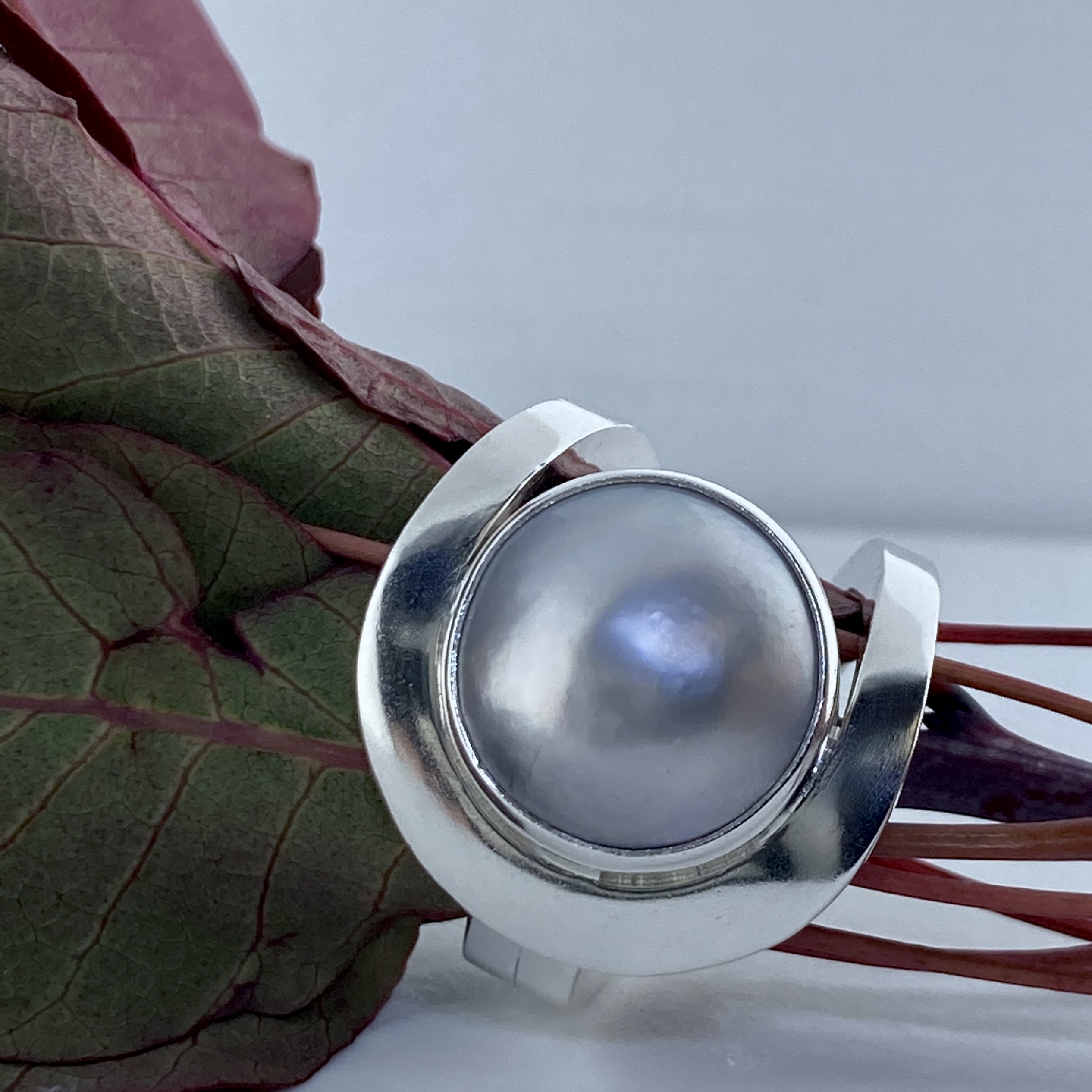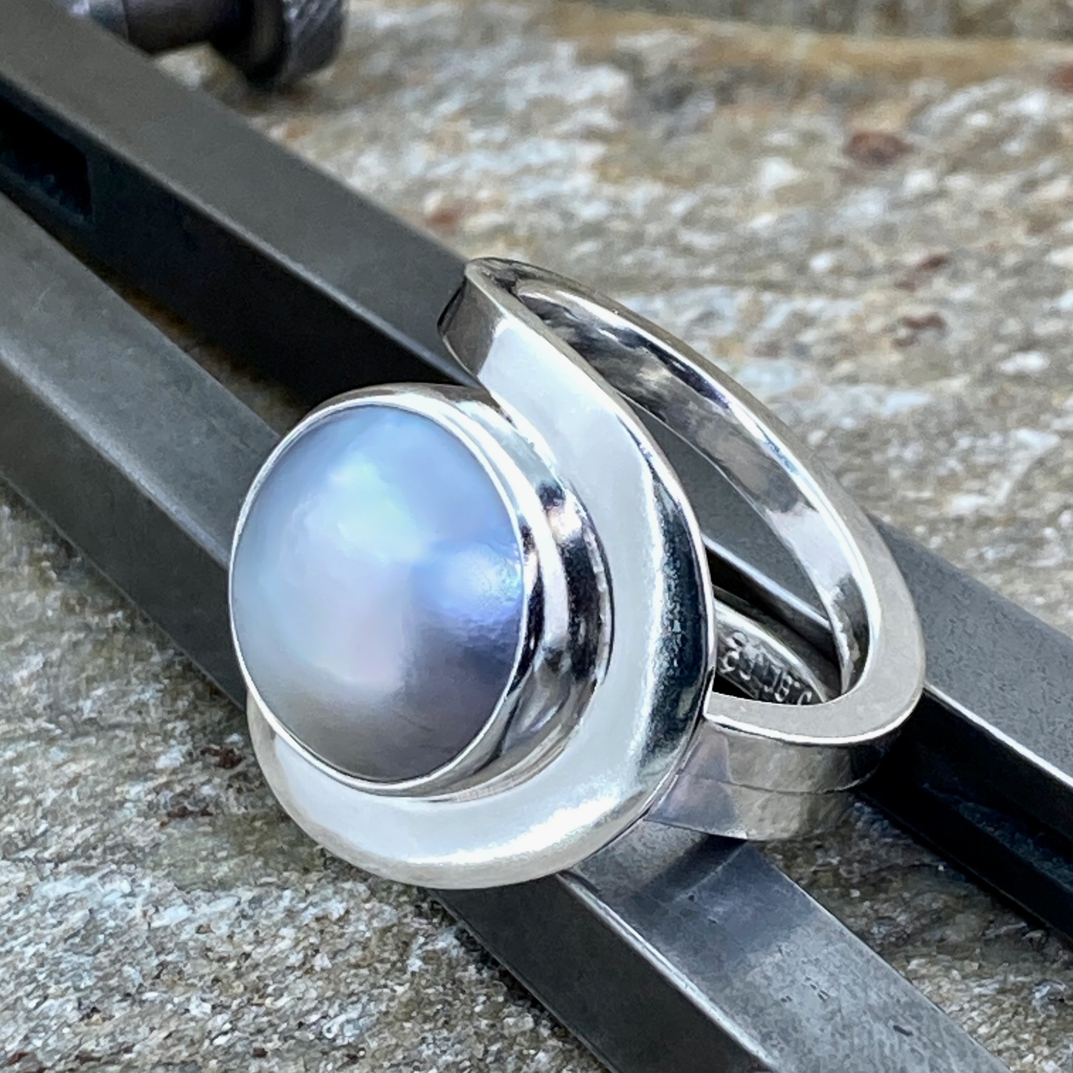 Each Buttonhole ring is handcrafted from solid Argentium 940 silver. I shape the band to form an open loop, then refine it to create a smooth, balanced curve. The result is a sculptural ring that feels both solid and light. The open form frames the pearl naturally while giving the design its signature structure.