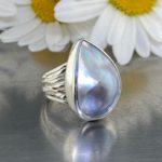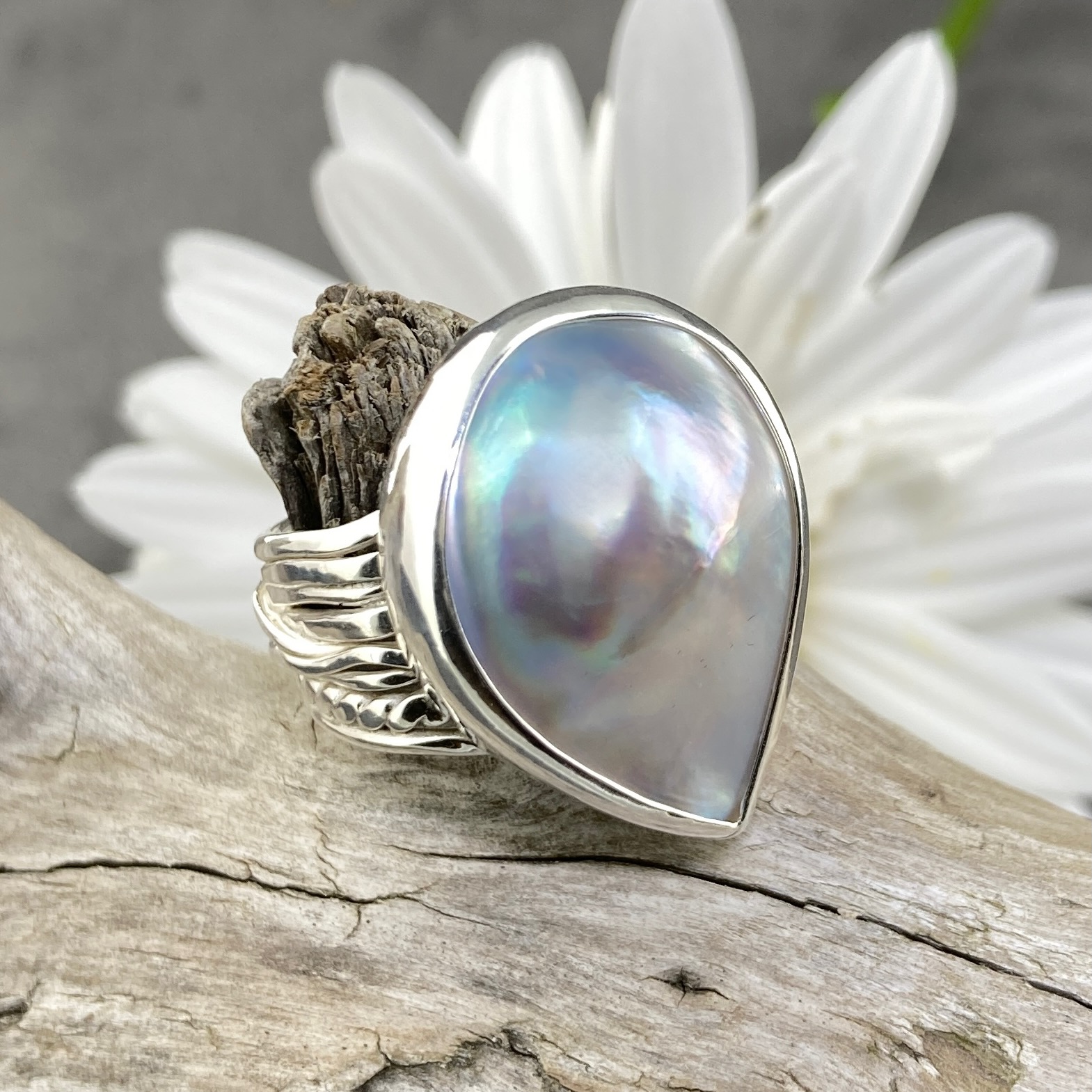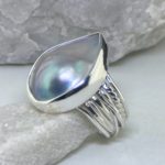 The Tahitian Pearl Argentium Silver Ring Size 7.75 captures movement and growth in the Twig design. The pearl’s blue-grey luminescence contrasts with the silver, reflecting both softness and strength.