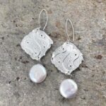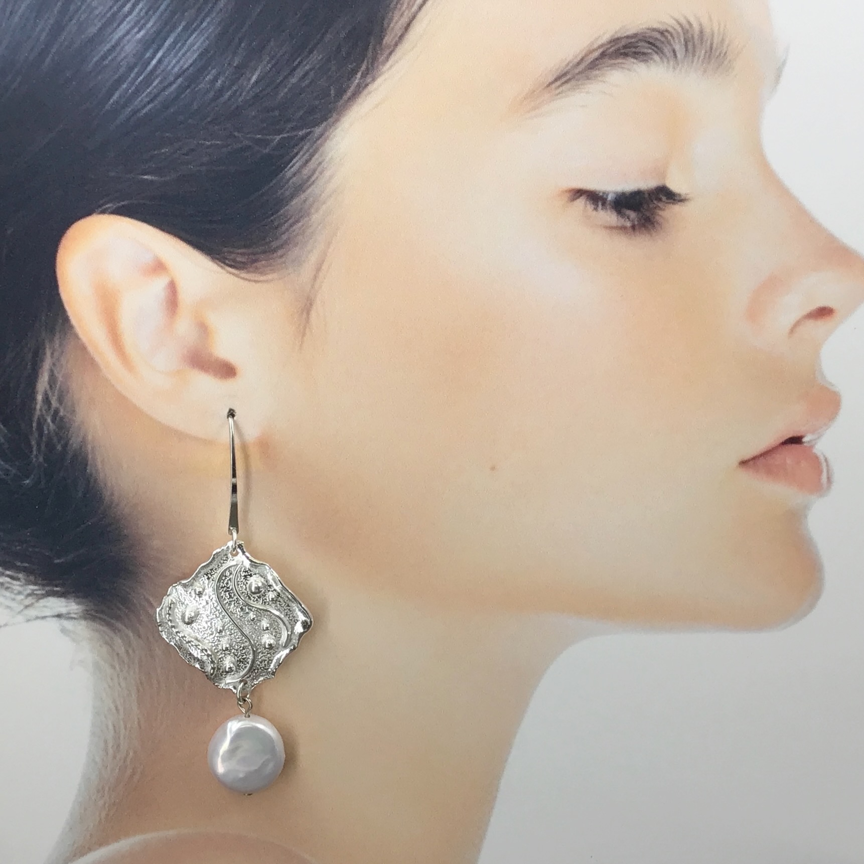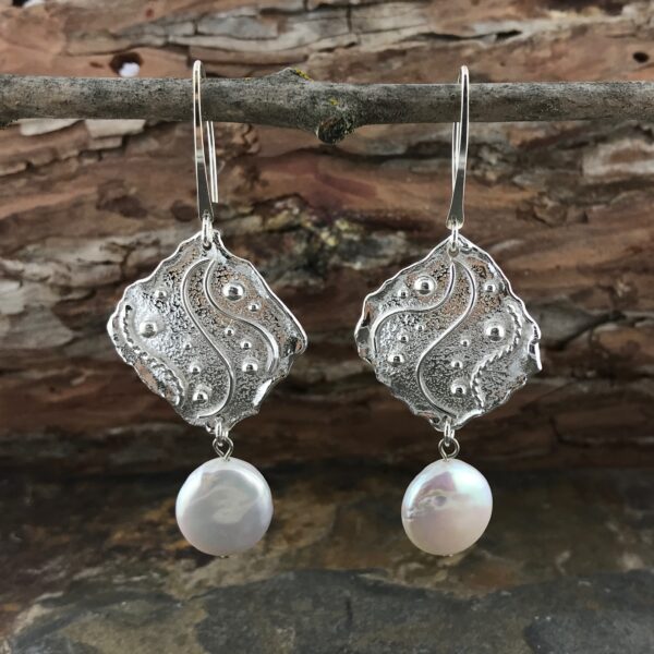 A beautiful natural coin shaped pearl accents these water design earrings. Solid Argentium silver hand made in the water design – melted edges with waves and granules fused on.