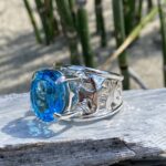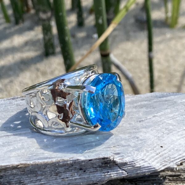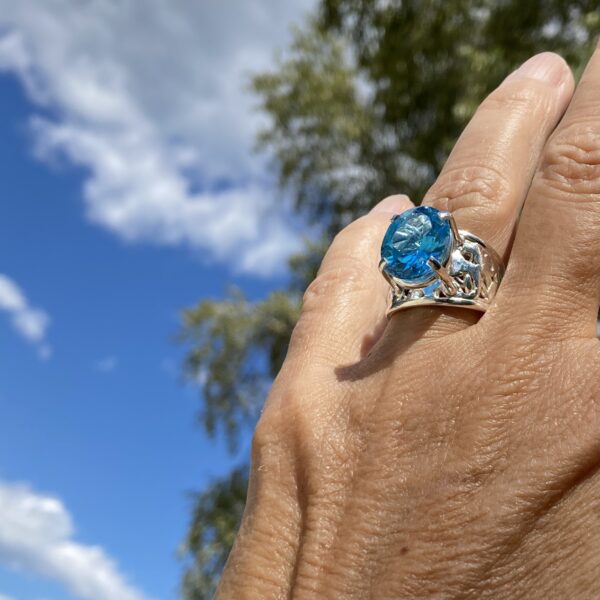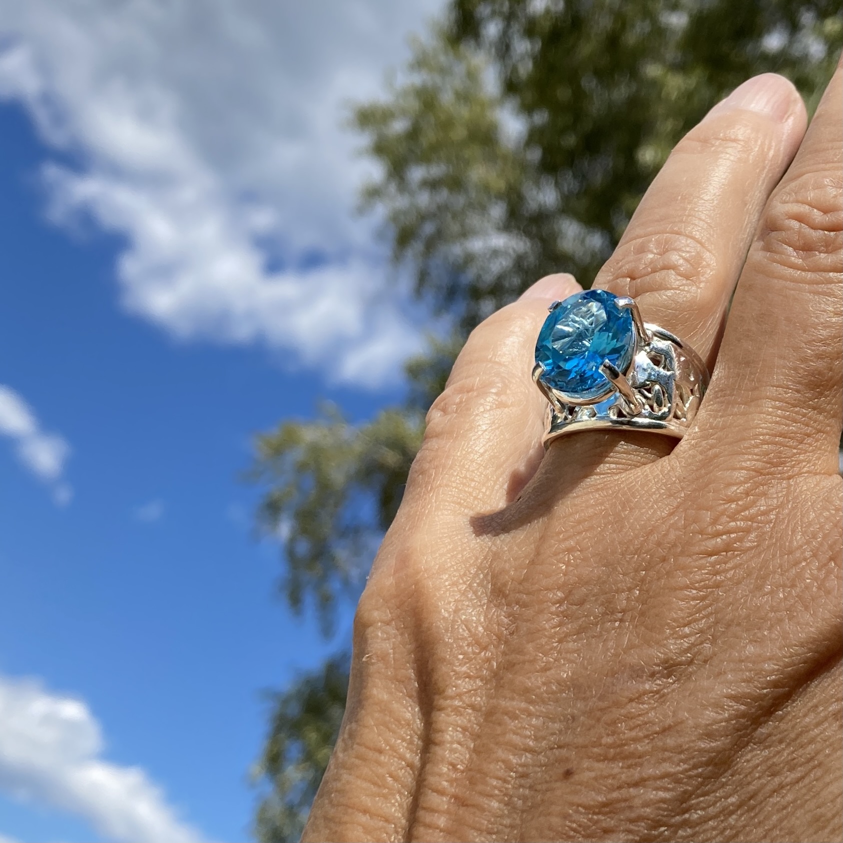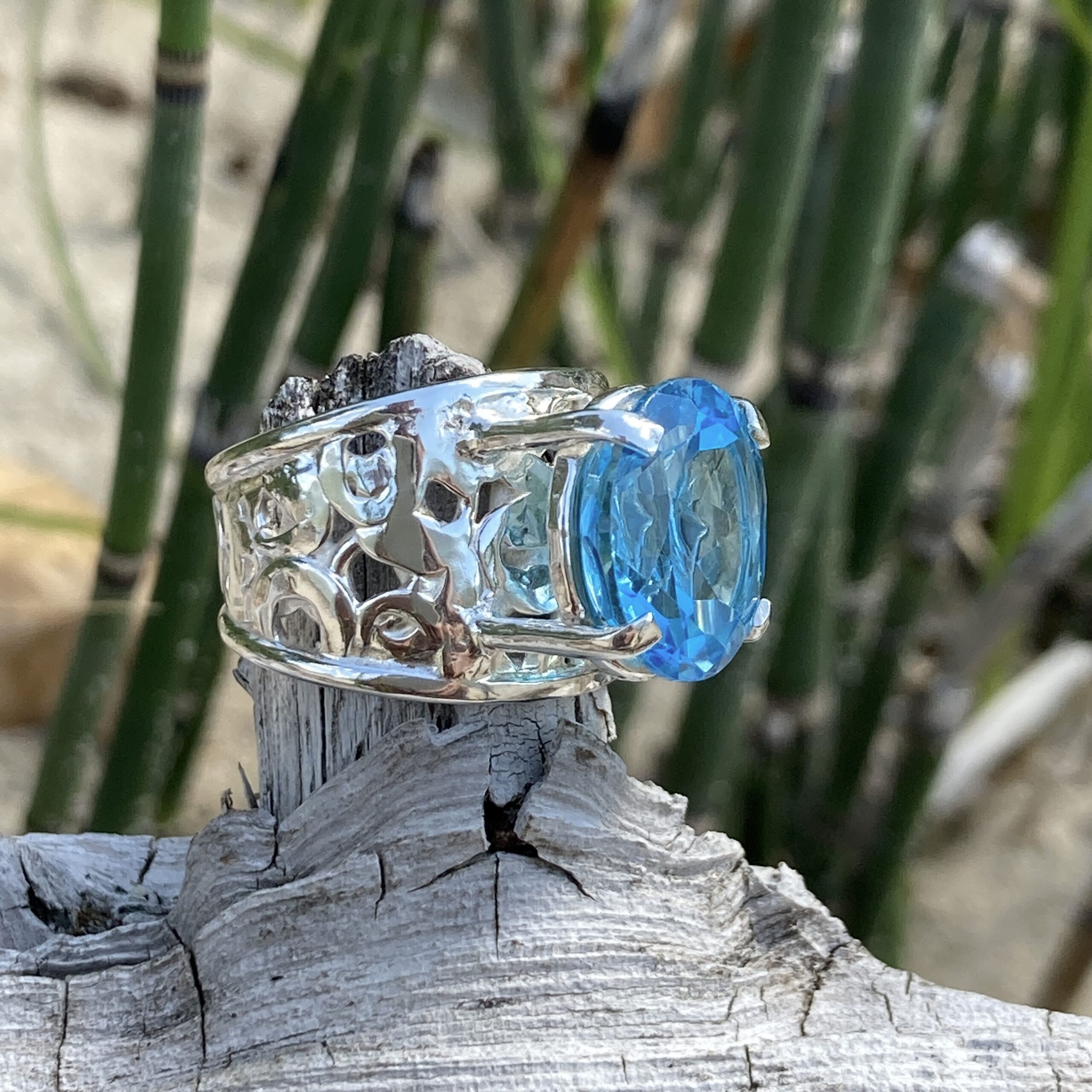 The Swiss Blue Topaz Ring Size 7 Argentium Silver Pebbles Band captures the steady rhythm of Kootenay Lake. A 9.5 carat oval Swiss Blue Topaz rests in a prong setting above a textured band. Its vivid blue colour glows like water moving over smooth stone.
