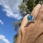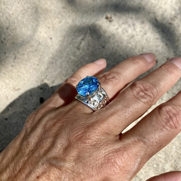 This 9.5 carat Swiss Blue Topaz shows clear ocean tones and bright reflections. The oval cut captures light from every angle, which gives it a bright and steady sparkle. As light moves across the silver texture, the gemstone’s colour deepens, adding calm energy to the design.