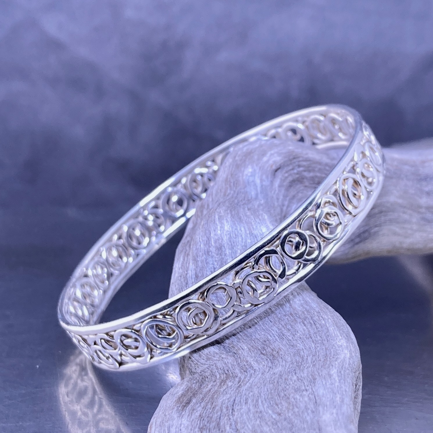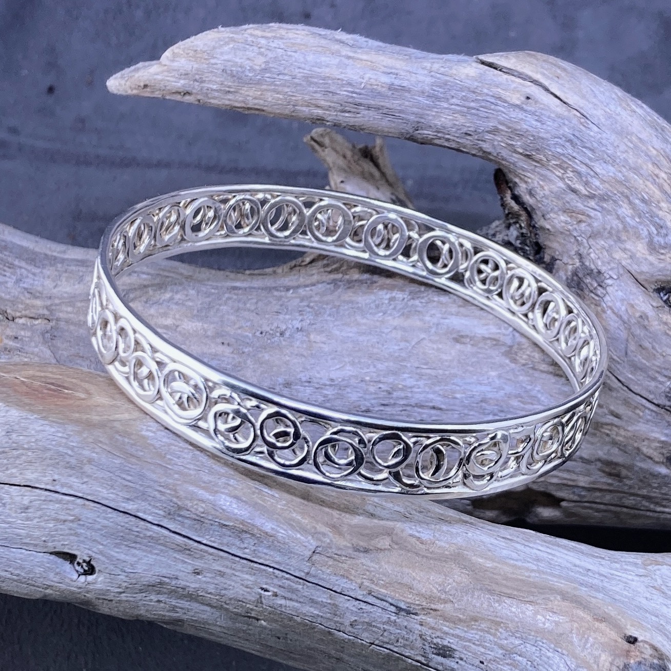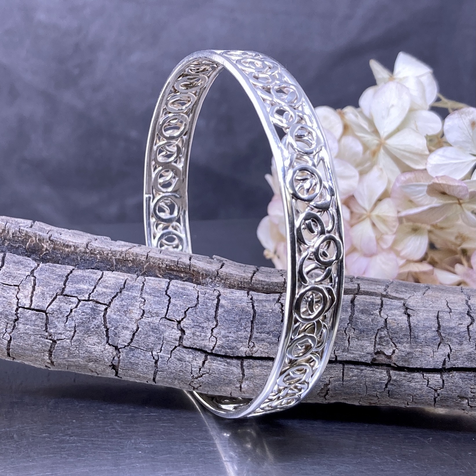 First, we cut and forge Argentium wire to create the base form. Then, we use hammer and heat to shape the soft “pebble” surface. After refining the edges, we harden the silver for strength and polish it to a clean, natural shine. Each step adds character, so every bangle has its own subtle pattern and feel.