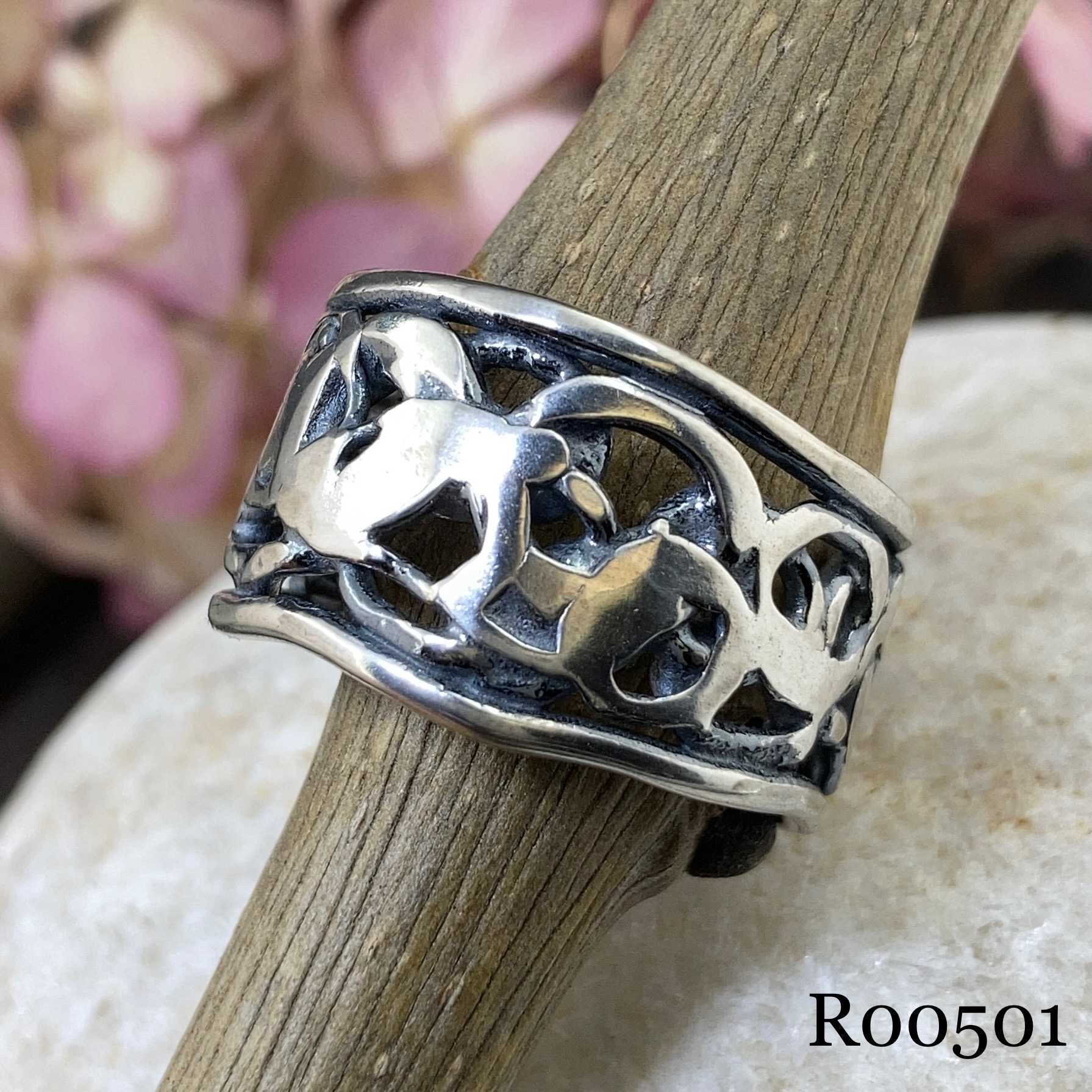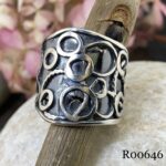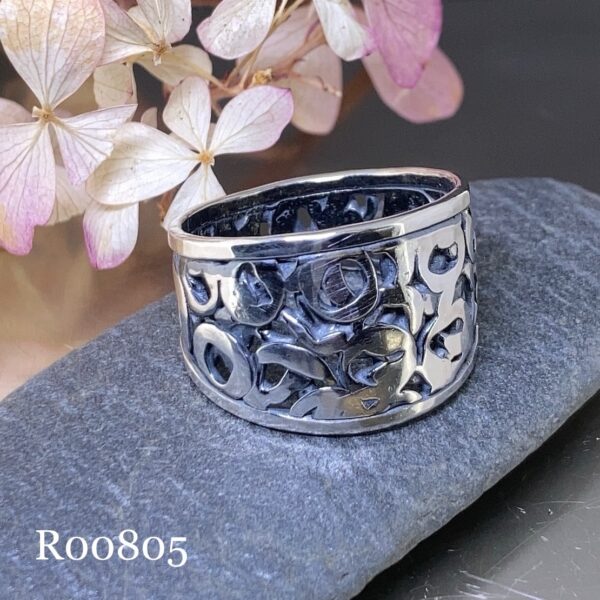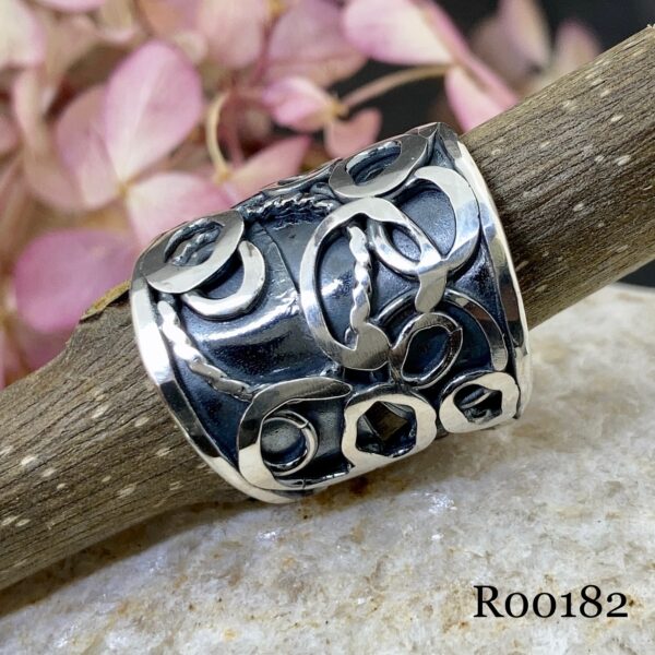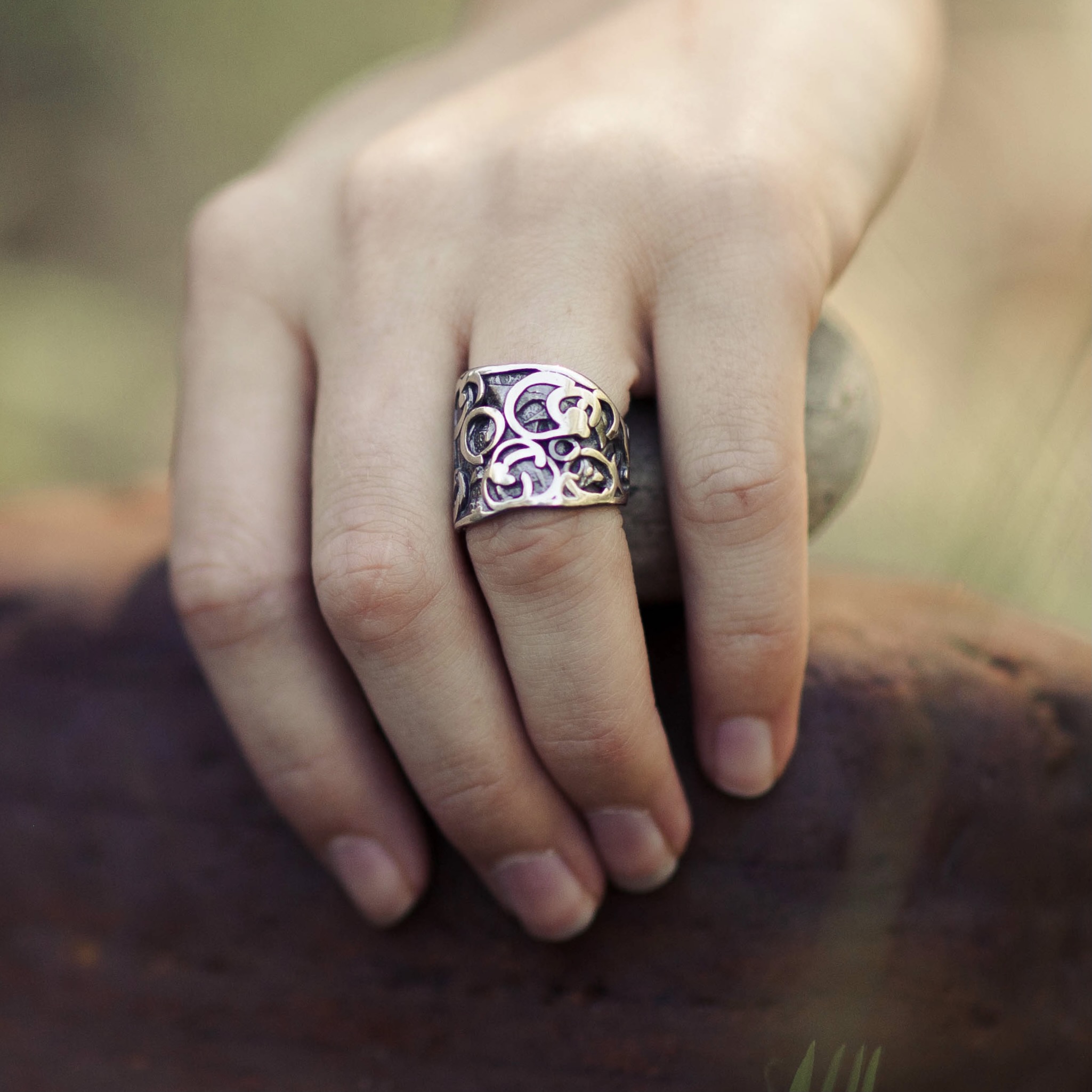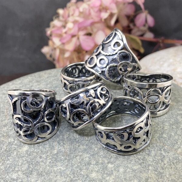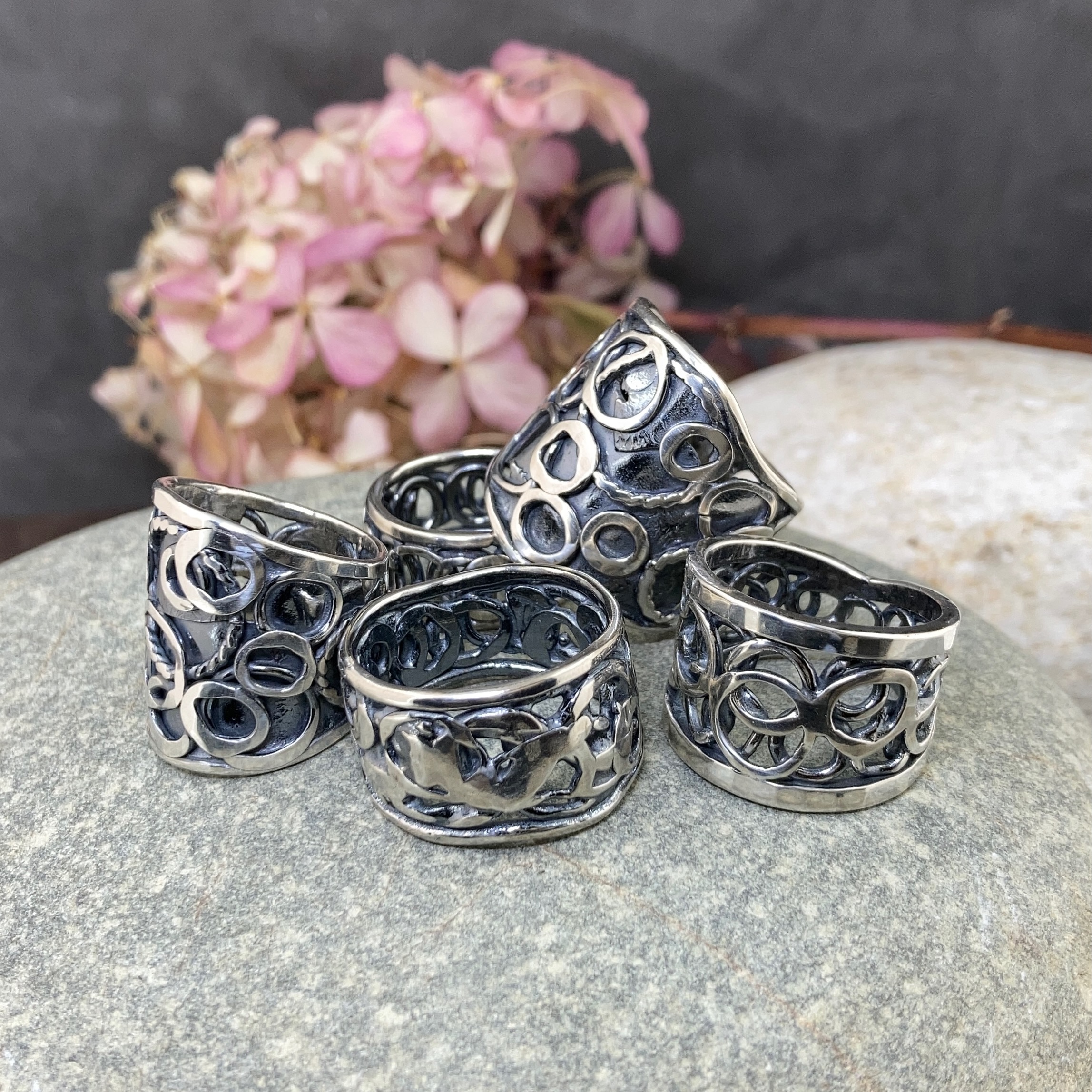 I build the Pebbles texture by fusing small pieces of Argentium into layered shapes. As the pattern forms, I add a finished edge to give the ring a clear border. Then I shape the band, smooth the inside, and strengthen the silver with heat. The antique finish brings out the depth and detail in the surface.