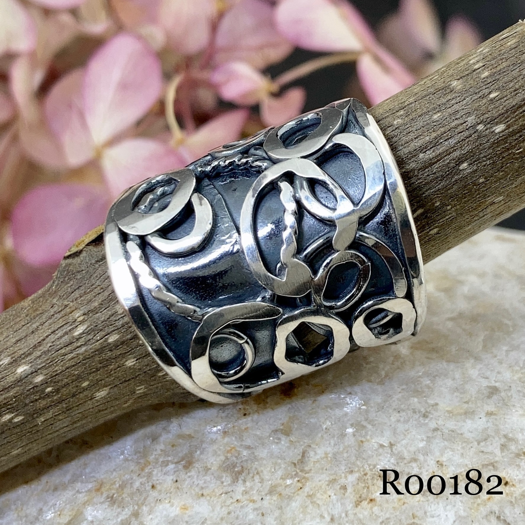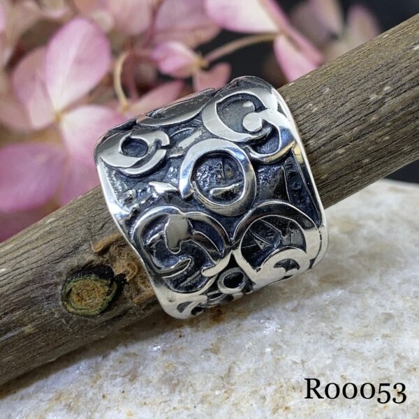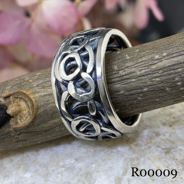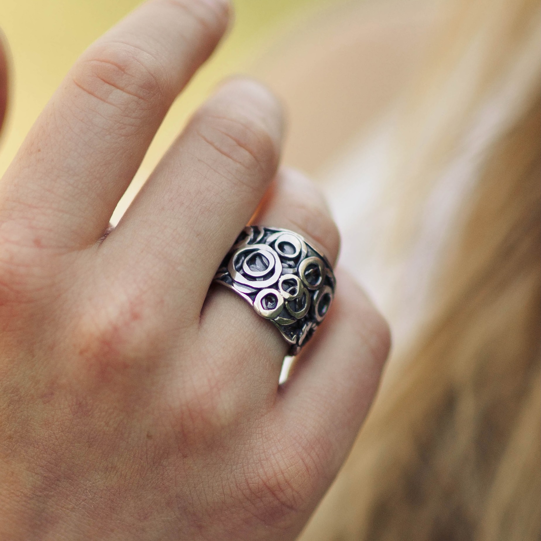This ring has a grounded, natural look. The Pebbles surface forms in layers, so each ring grows into its own pattern. The finished edge gives a clear outer line, and the antique tone adds depth to the design.