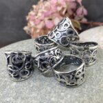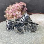 Because these rings use Argentium silver, I heat-treat each one to activate the germanium oxide layer. This step increases hardness and slows tarnish. After the heat work, I apply the antique finish and polish the raised texture.