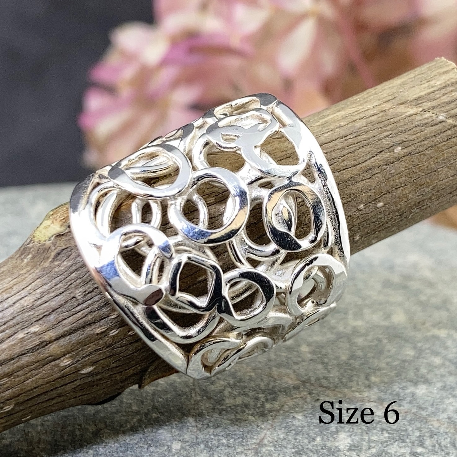 This ring has a natural, grounded feel. The Pebbles surface is made from layers of small silver pebbles fused together. The finished edge gives the design a smooth outline and keeps the form balanced and clean.