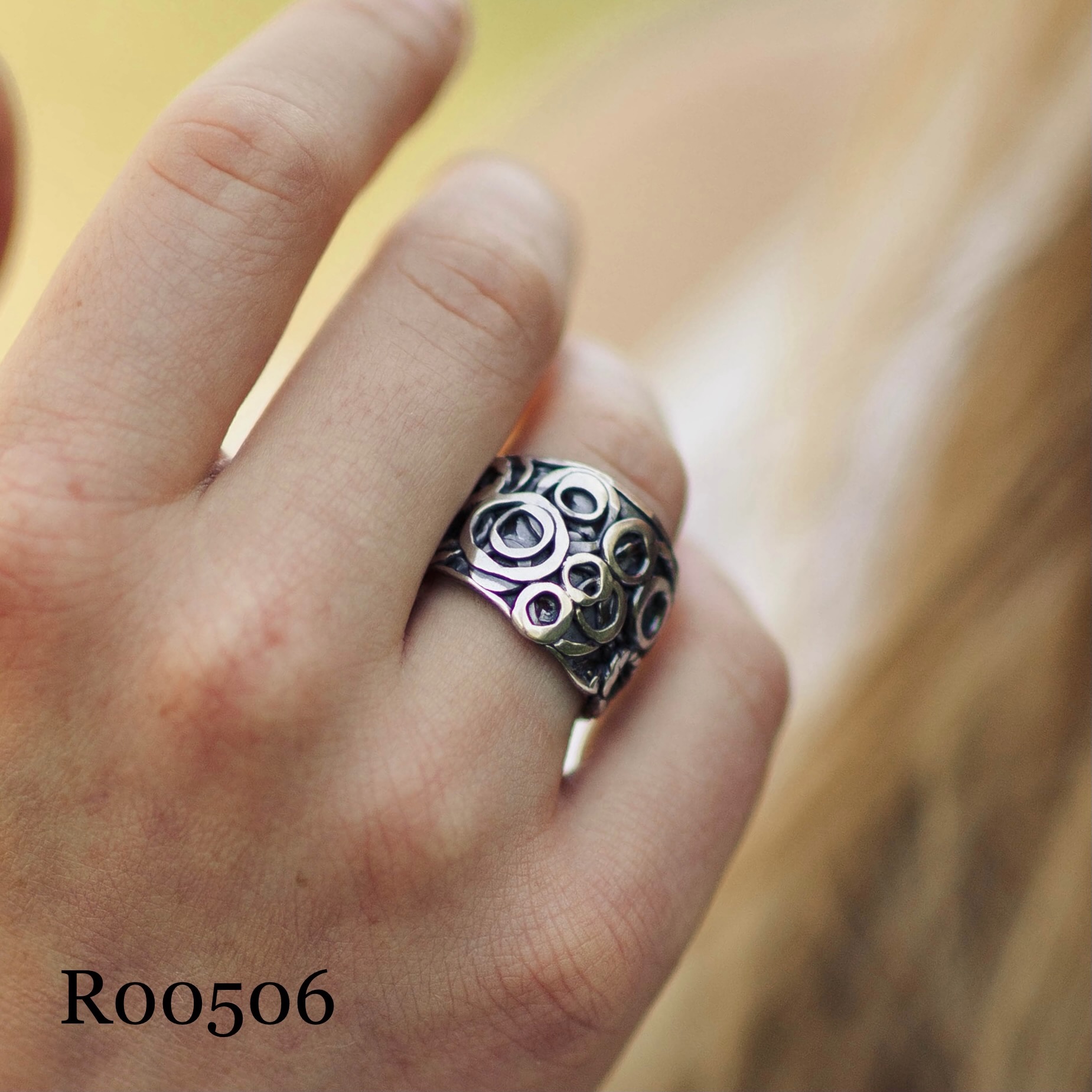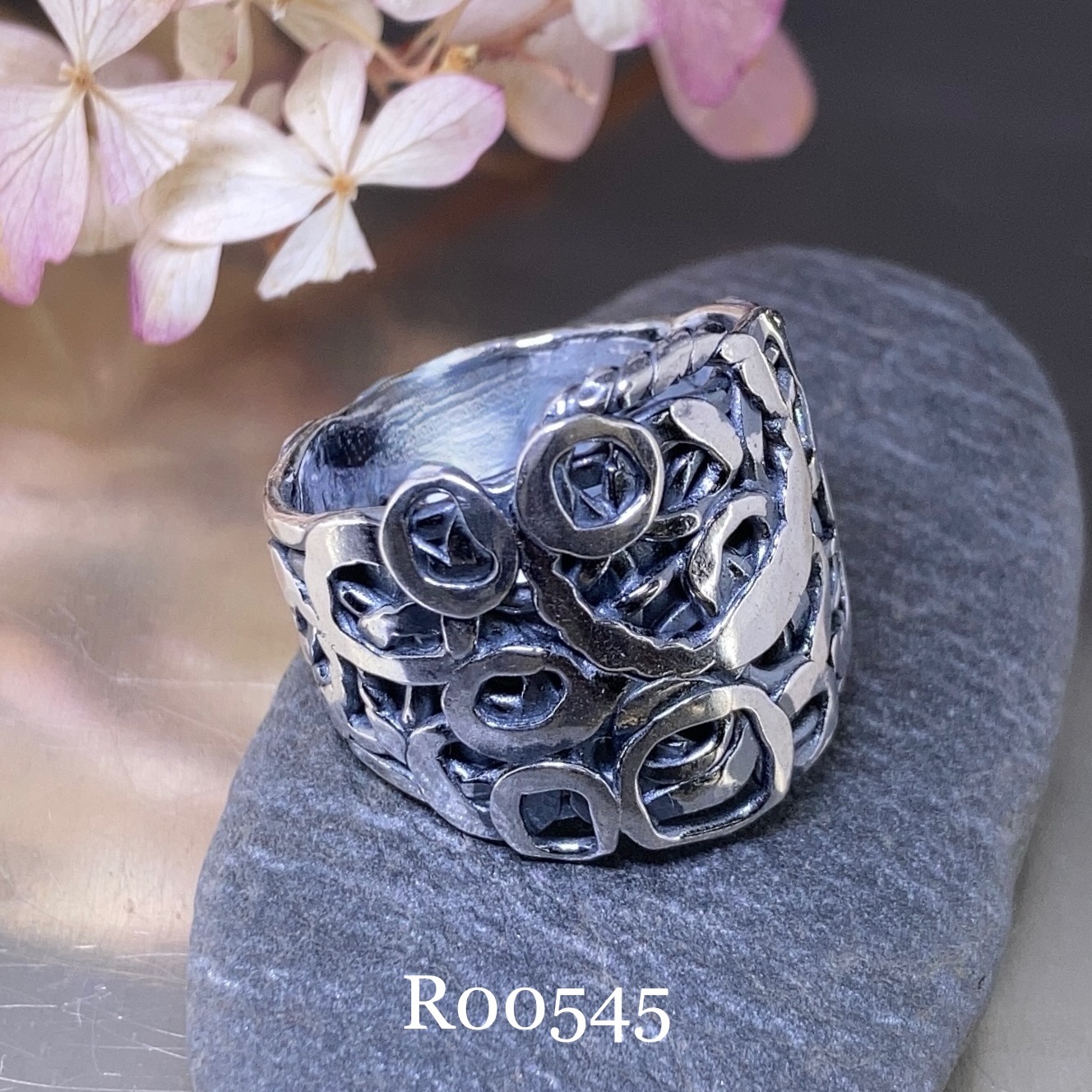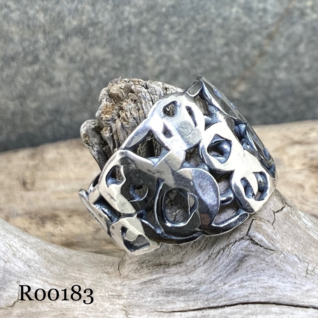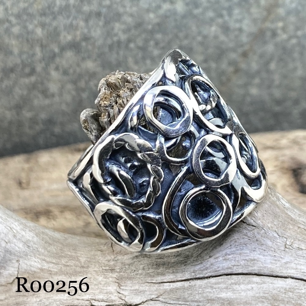 These rings I have made the pebbles design and left an irregular, natural edge.  Then I shape the band into a ring and fuse the ends. Followed by lots of shaping and hammering and polishing.