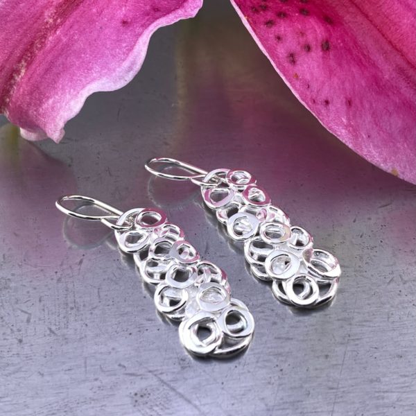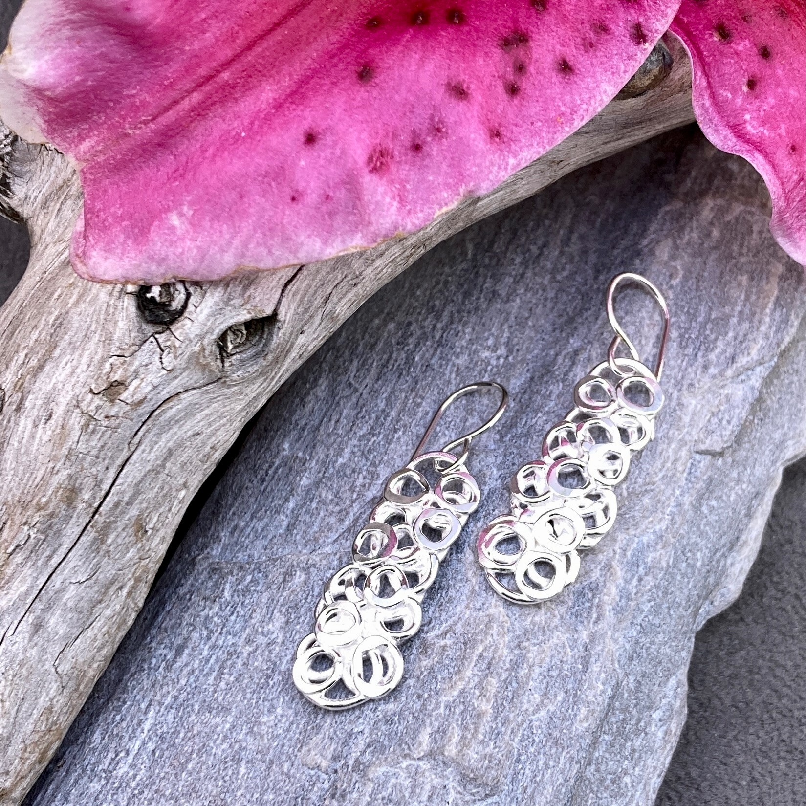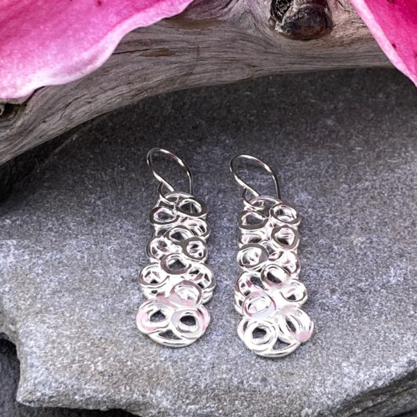 Layers of little hollow pebbles arranged in a rectangle and then fused. Â And then more pebbles added to get a nice balanced pattern. These earrings are a rectangle shaped pile of pebbles.