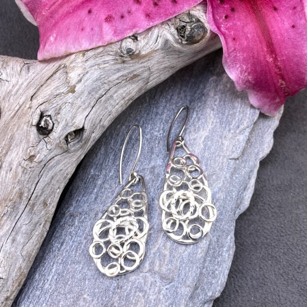 Layers of little hollow pebbles arranged in a rectangle and then fused. Â And then more pebbles added to get a nice balanced pattern. These earrings are a teardrop shape.