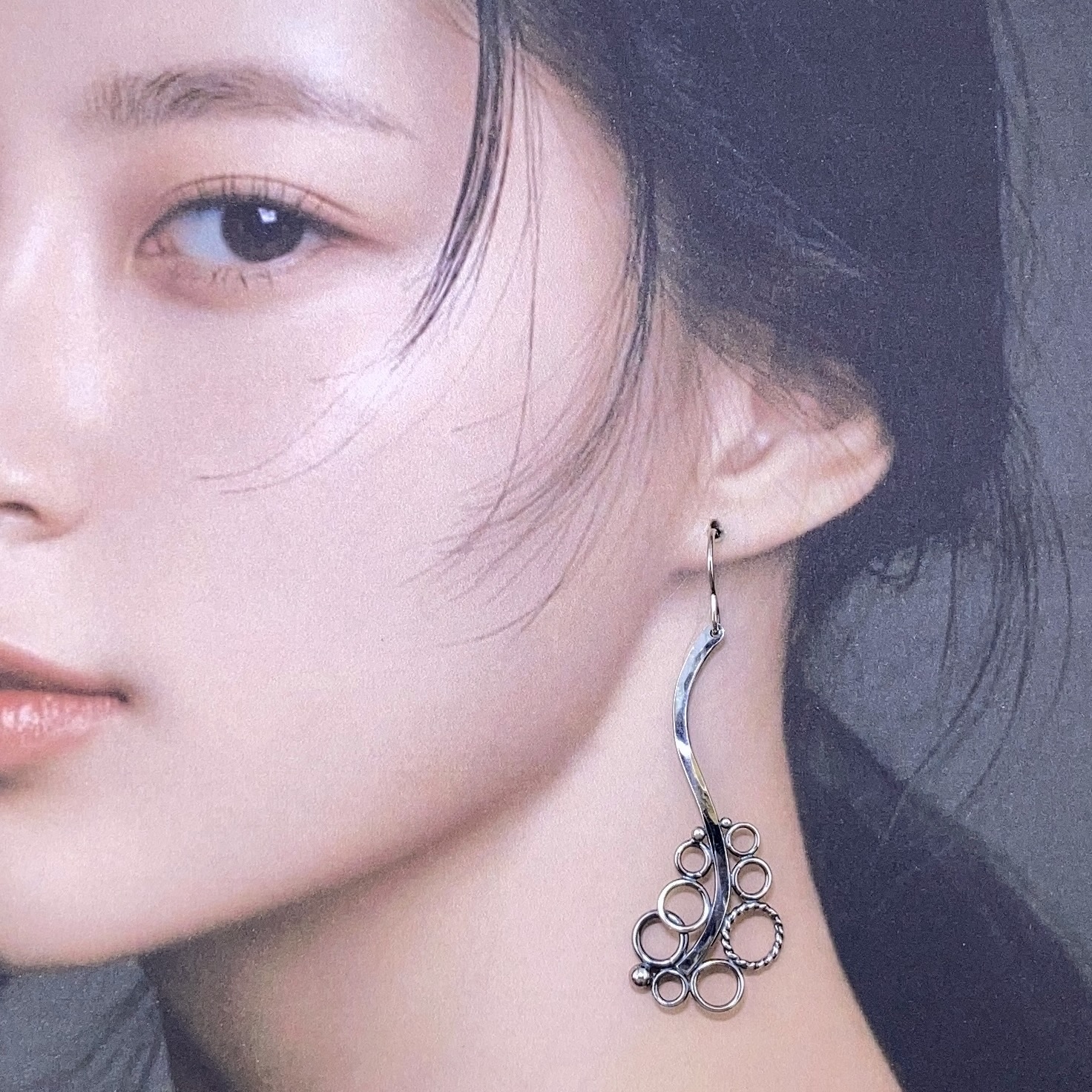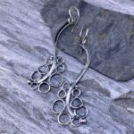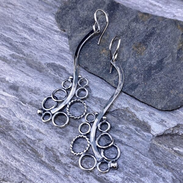 I lay small circles together to form a pattern – I call them ‘pebbles’. These silver Pebbles are laying comfortably along a textured silver branch. These earring are very light and comfortable for their size.