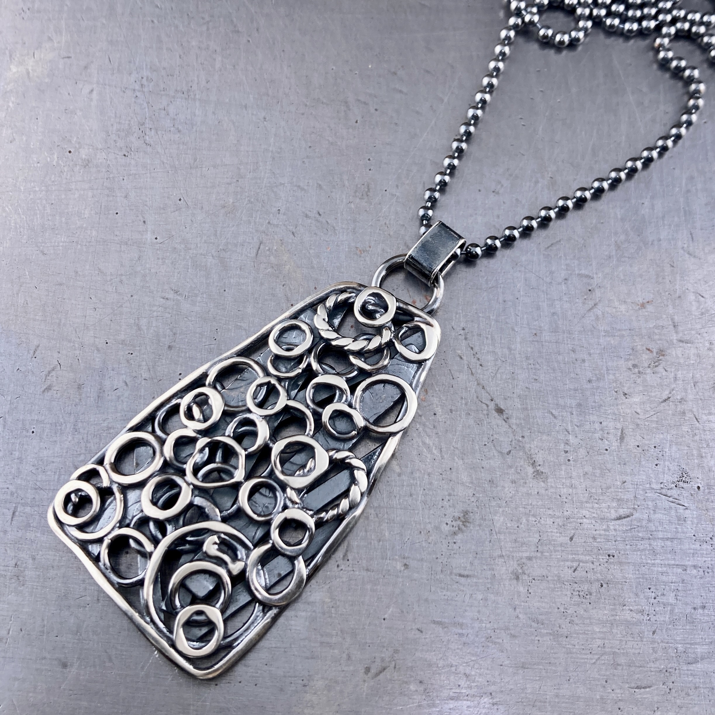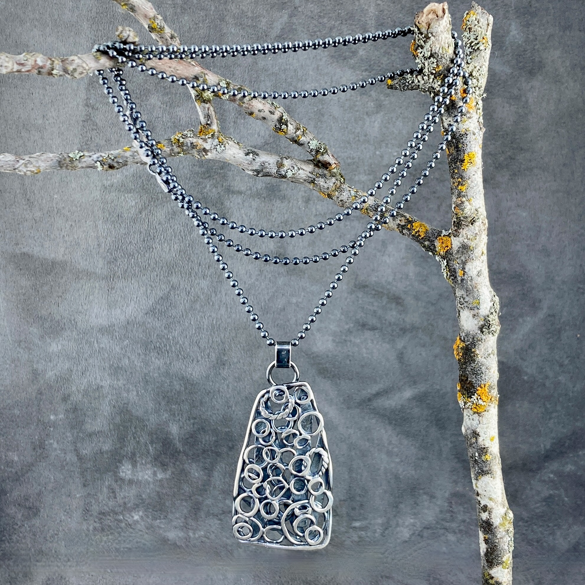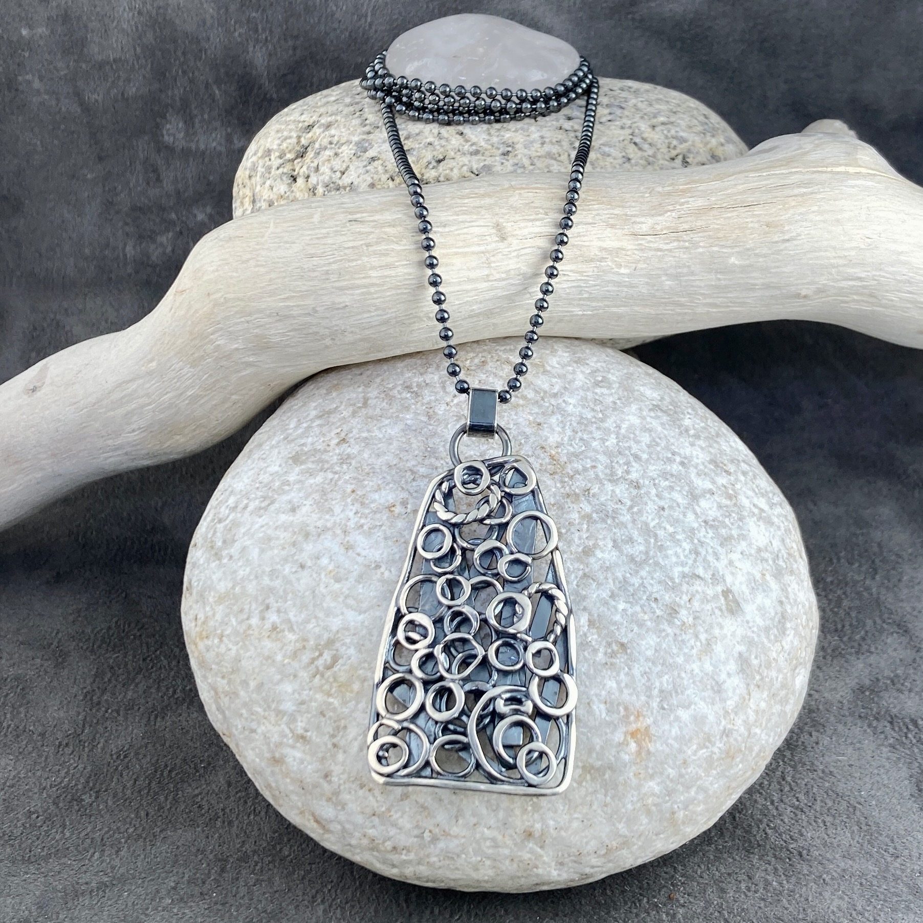 Pebbles pendant in antique tombstone.  Argentium rings all piled and then fused together.  Then more rings added and fused until a nice random balance is achieved.  The antique finish is permanent and it never needs polishing.