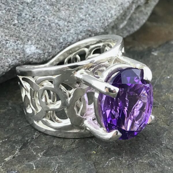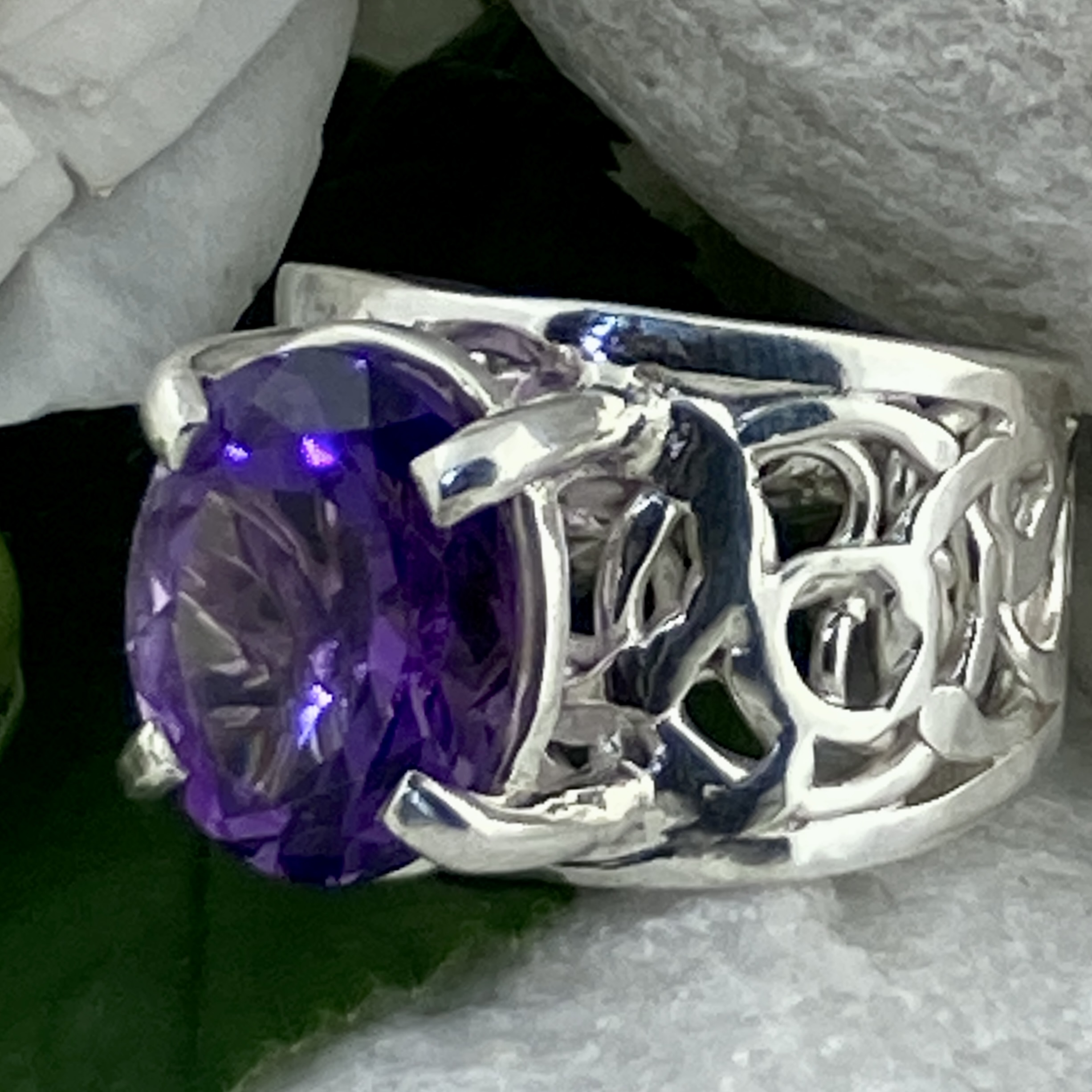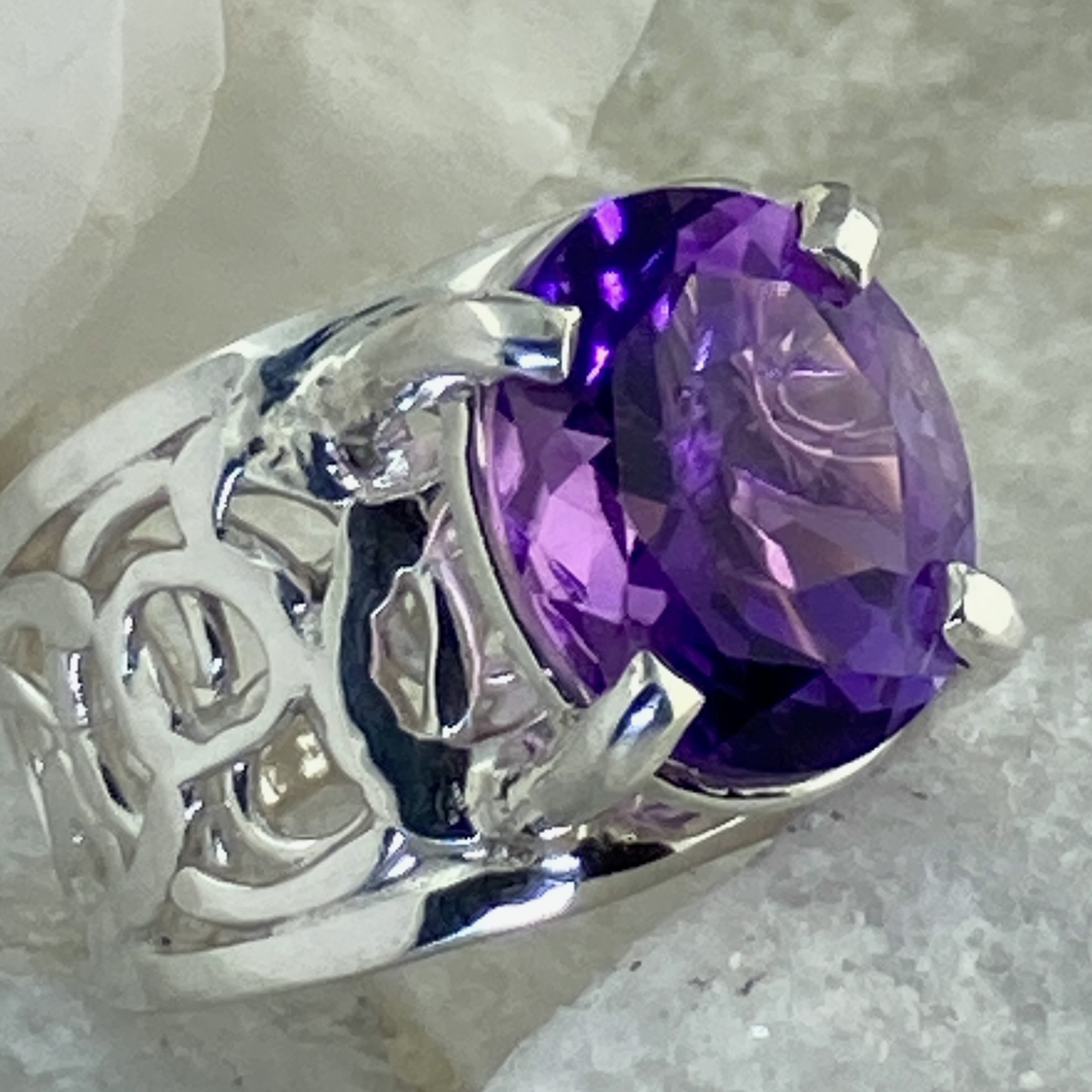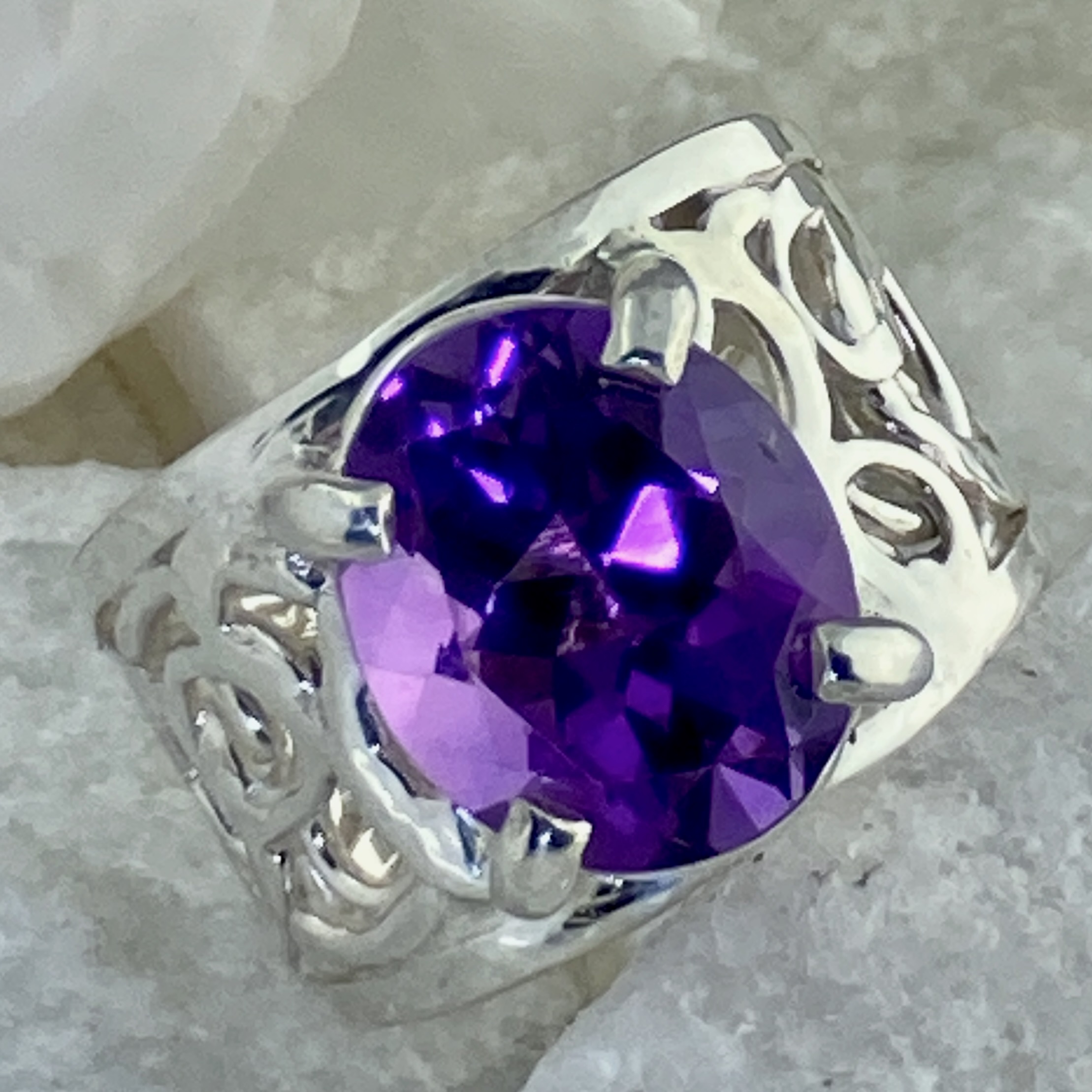 This 7-carat oval Amethyst shows rich violet tones with subtle flashes of blue and pink. The prong setting allows light to pass freely through the gemstone, revealing its inner facets and colour depth. Each facet reflects against the textured silver like sunlight glancing over stone.