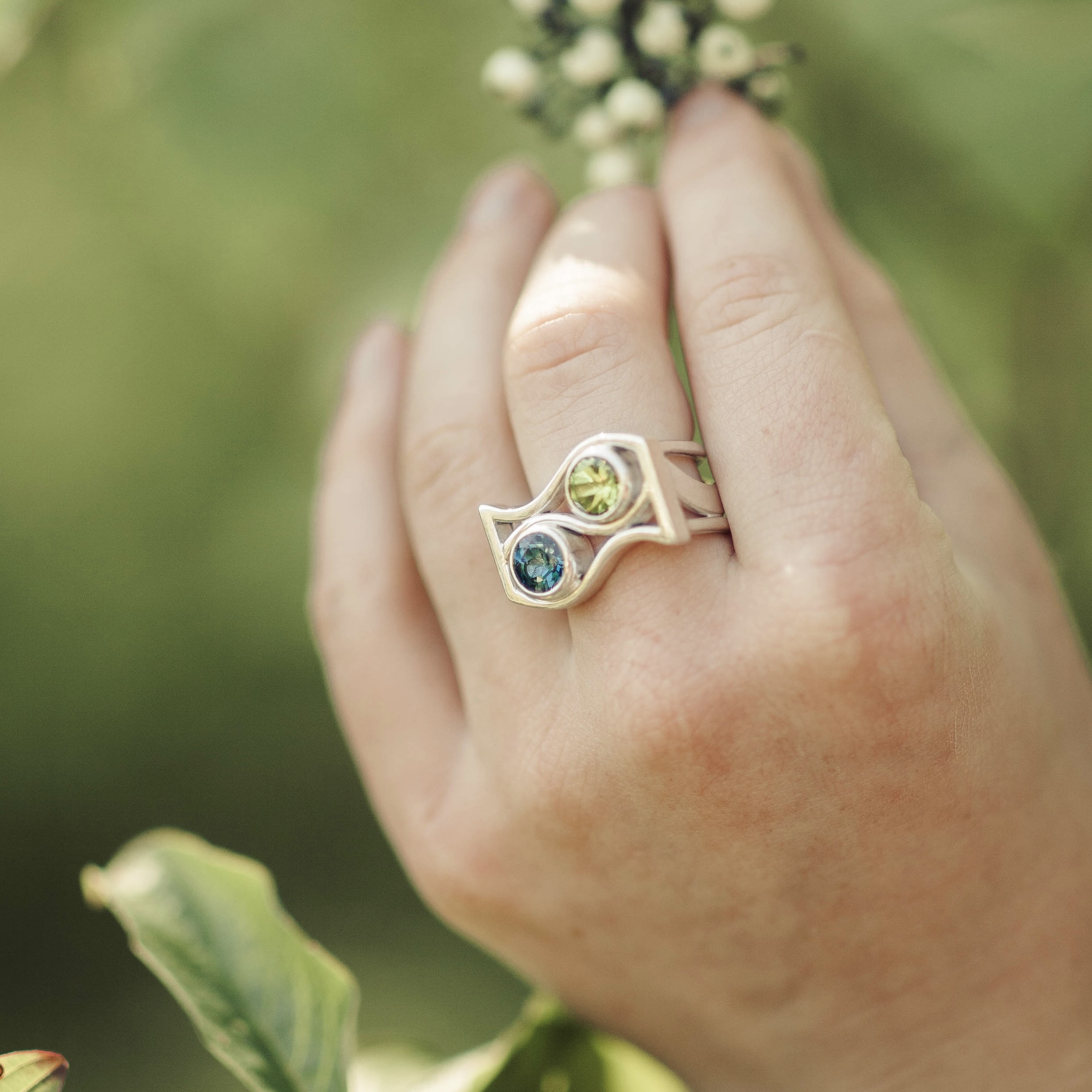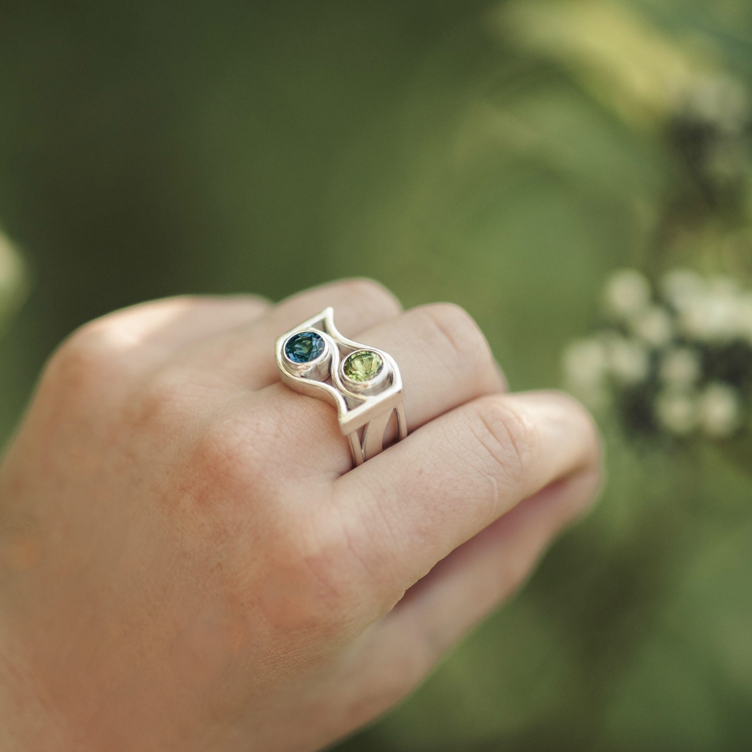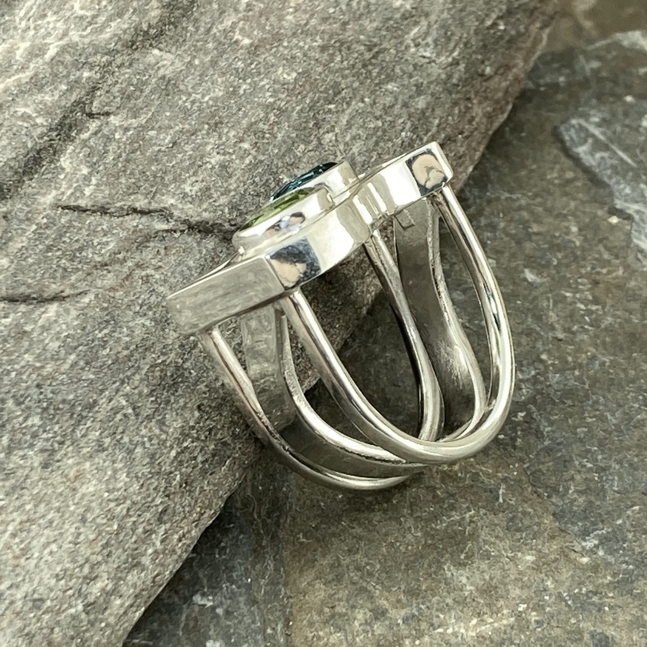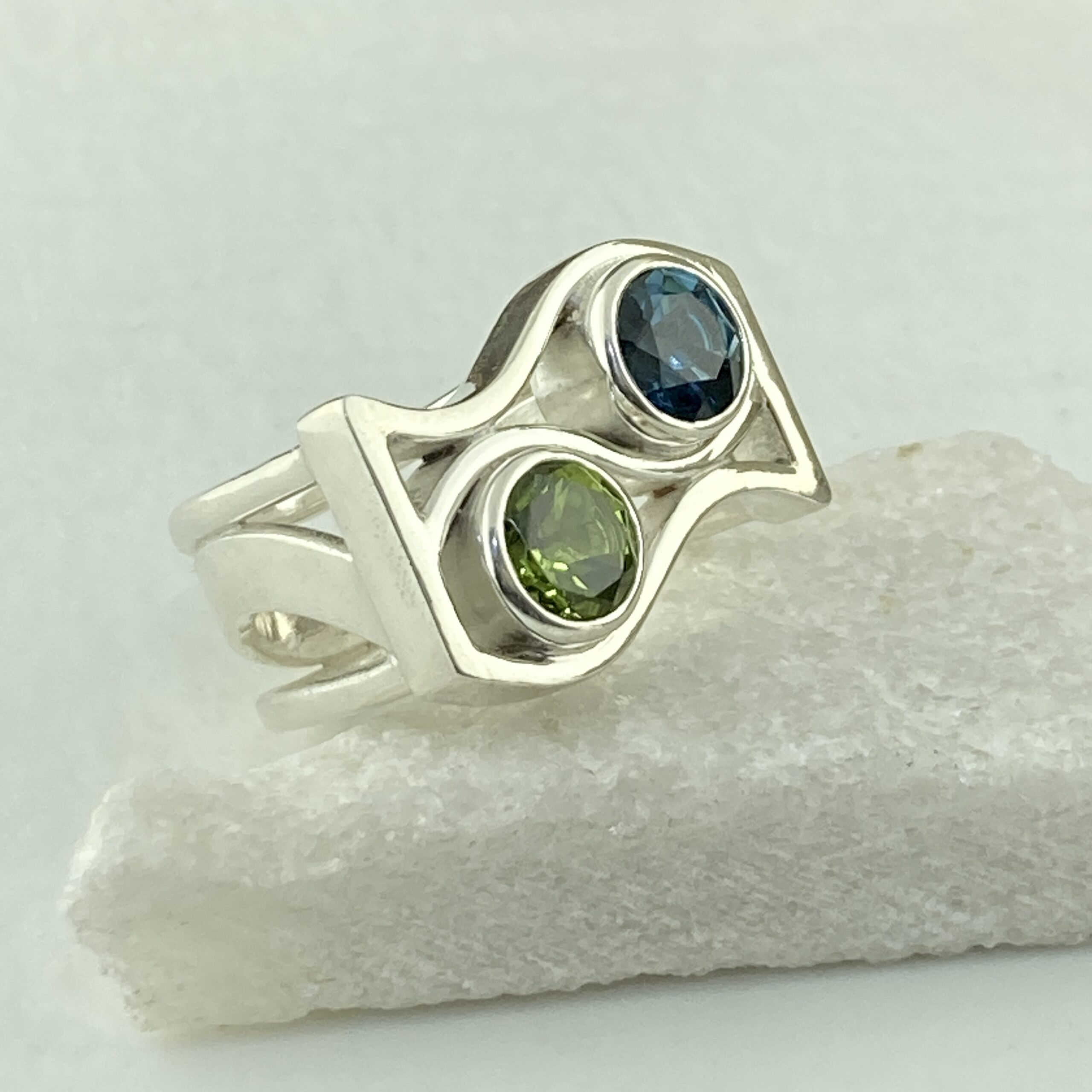 Peridot and London Blue Topaz Argentium Silver Ring Size 9.25 blends colour, contrast, and motion. The Flag design joins two vivid gemstones that shift together in light — a lively meeting of blue and green tones that feels bright, balanced, and bold.