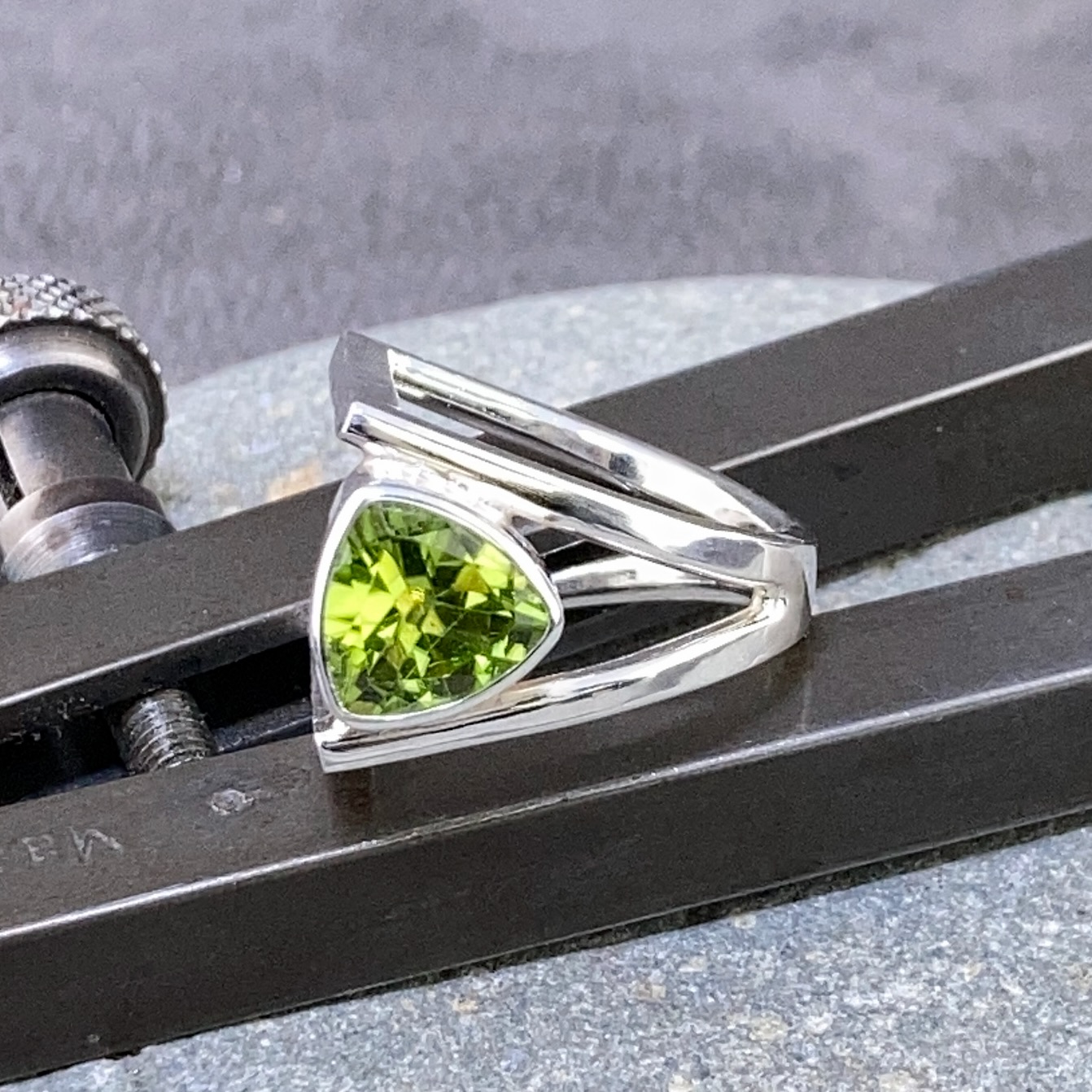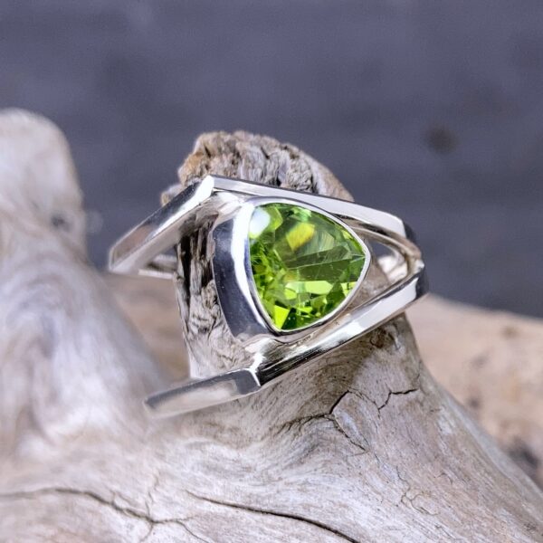 Argentium silver in a D shape, Book design ring. Featuring a 1.5 carat, trillion cut Peridot. Such a beautiful colour!