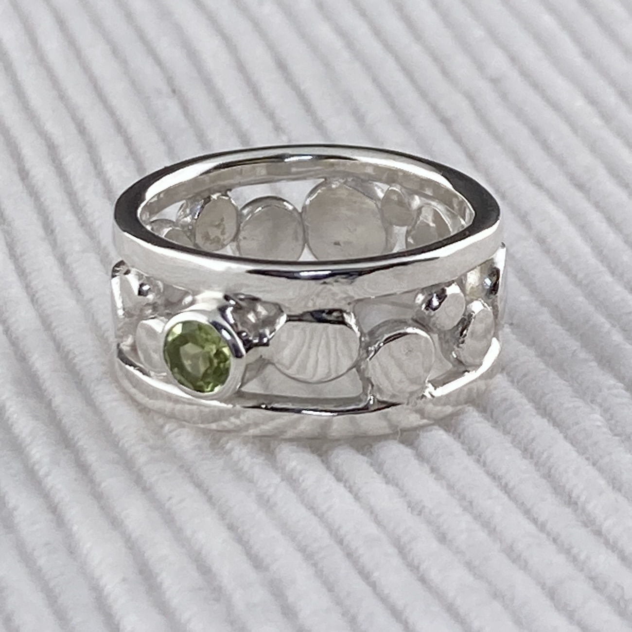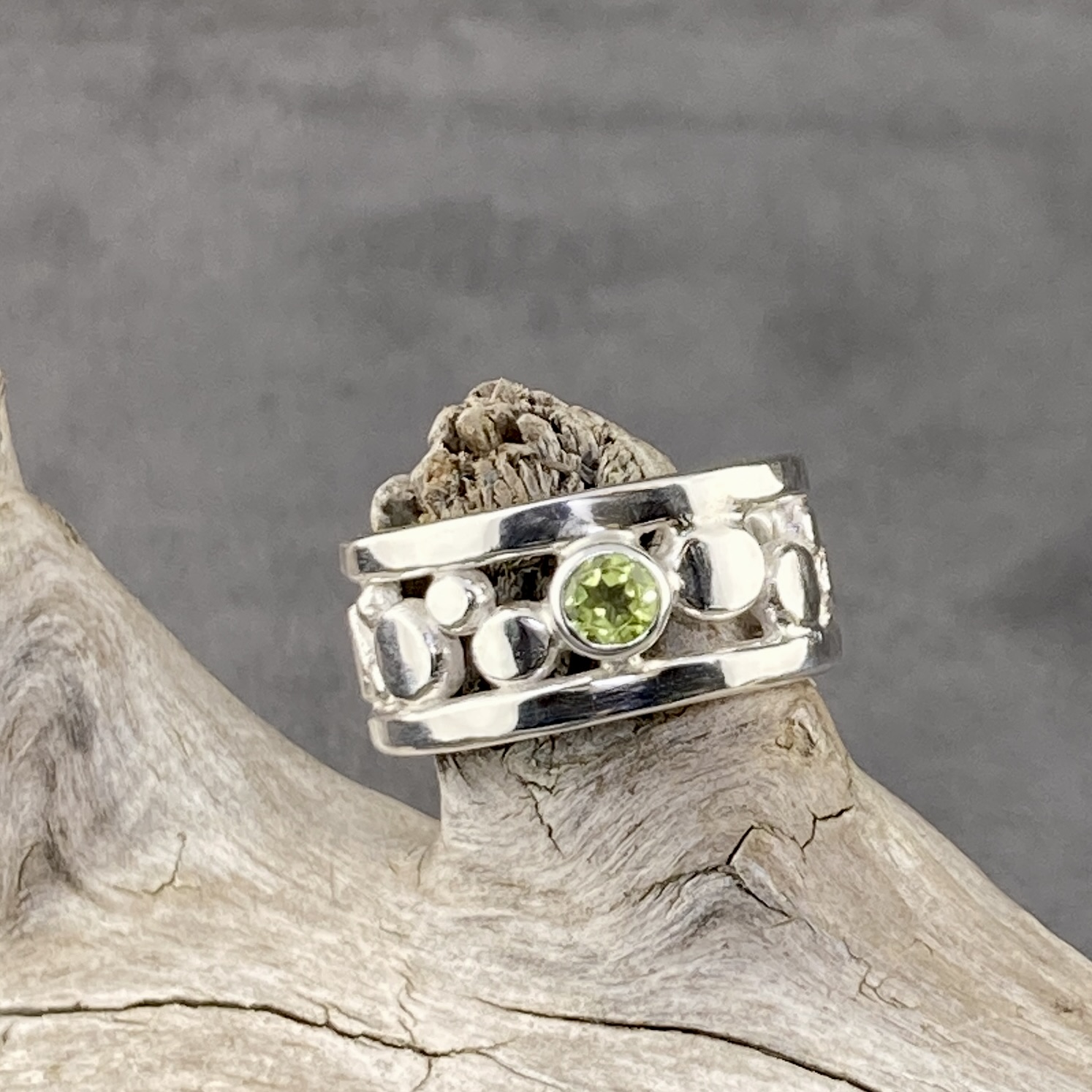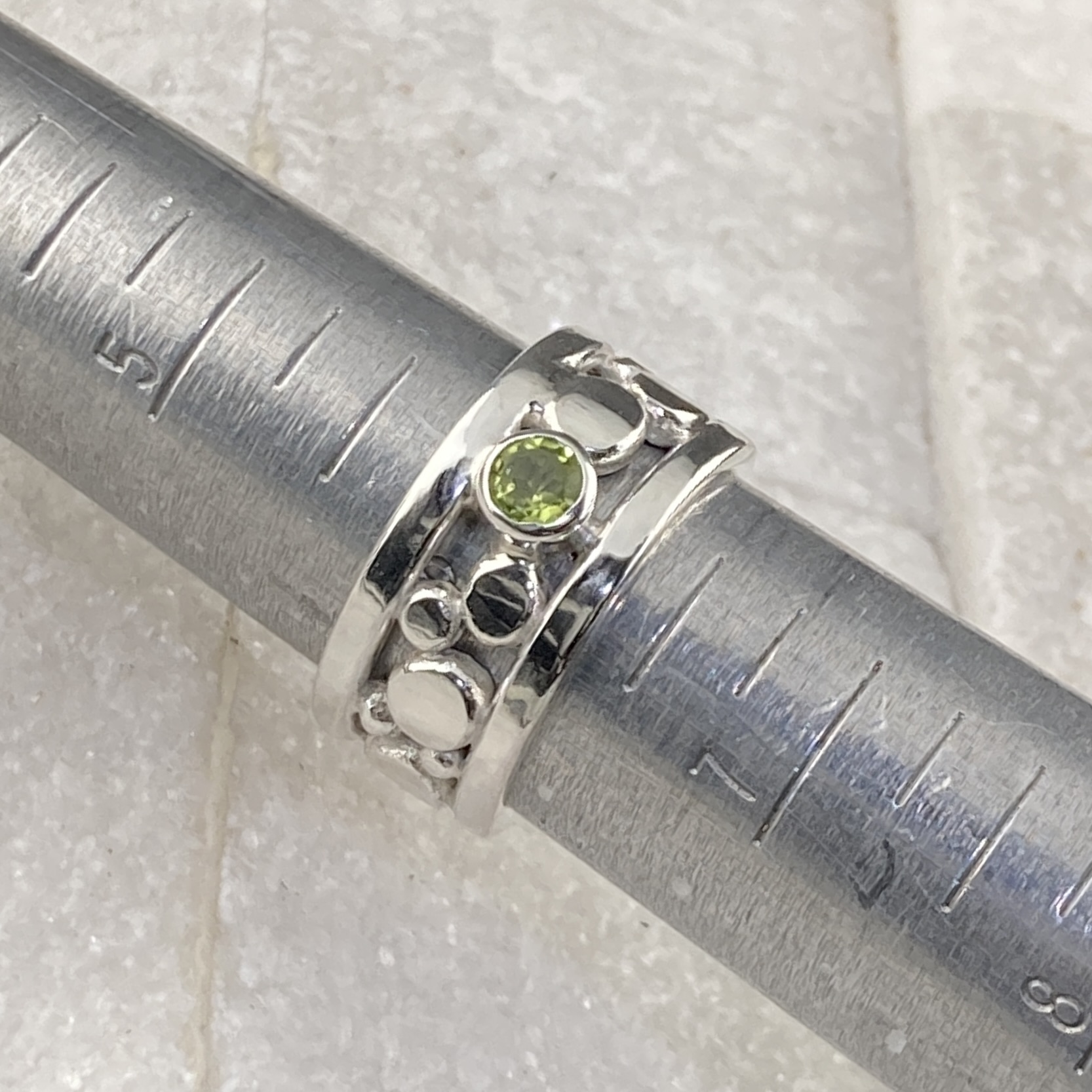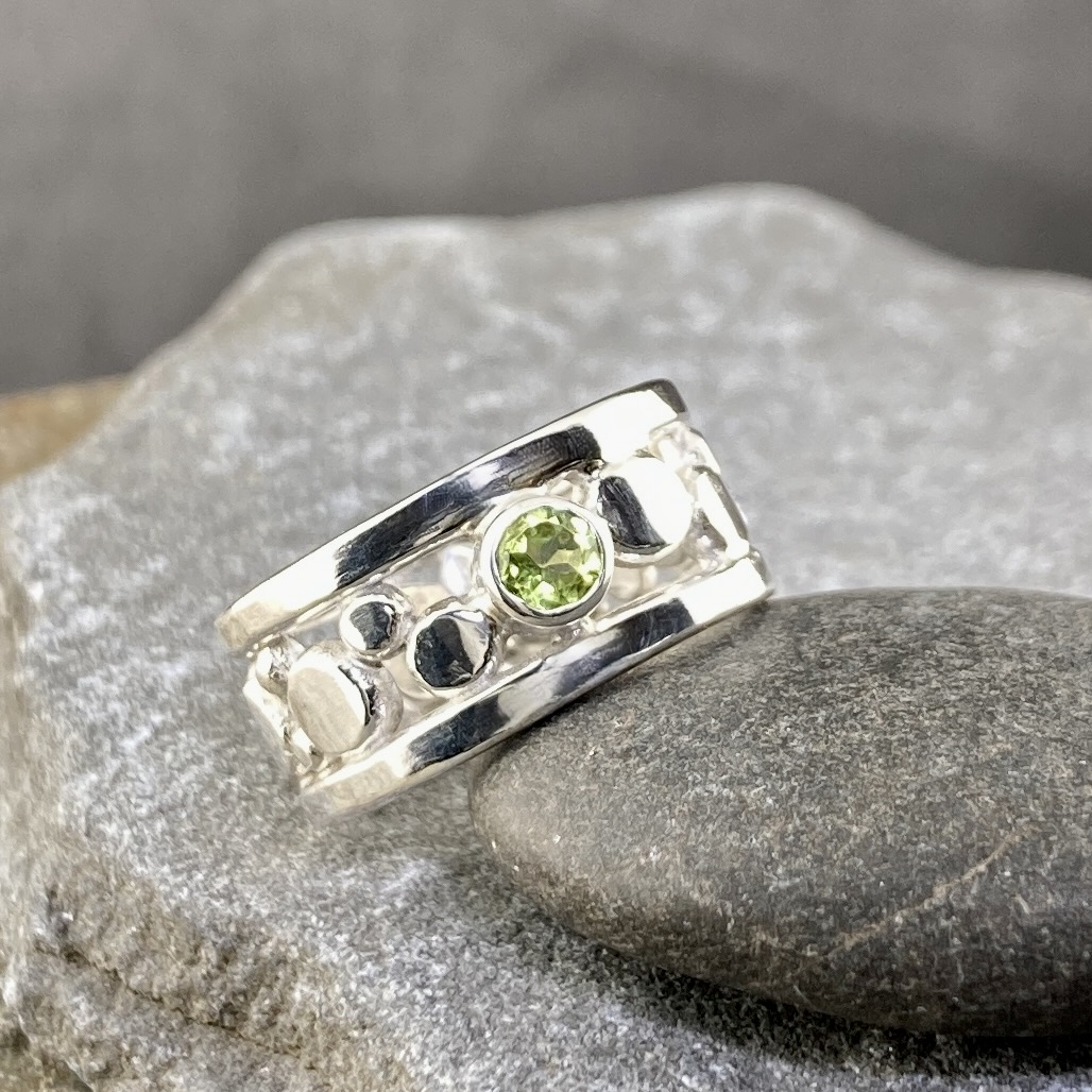 This handcrafted Peridot Ring Argentium Silver Flat Granules design embodies the grounded strength of the LAND Collection. The natural green Peridot gemstone rests within a sculpted Argentium silver band — bright, tactile, and shaped for everyday wear.
