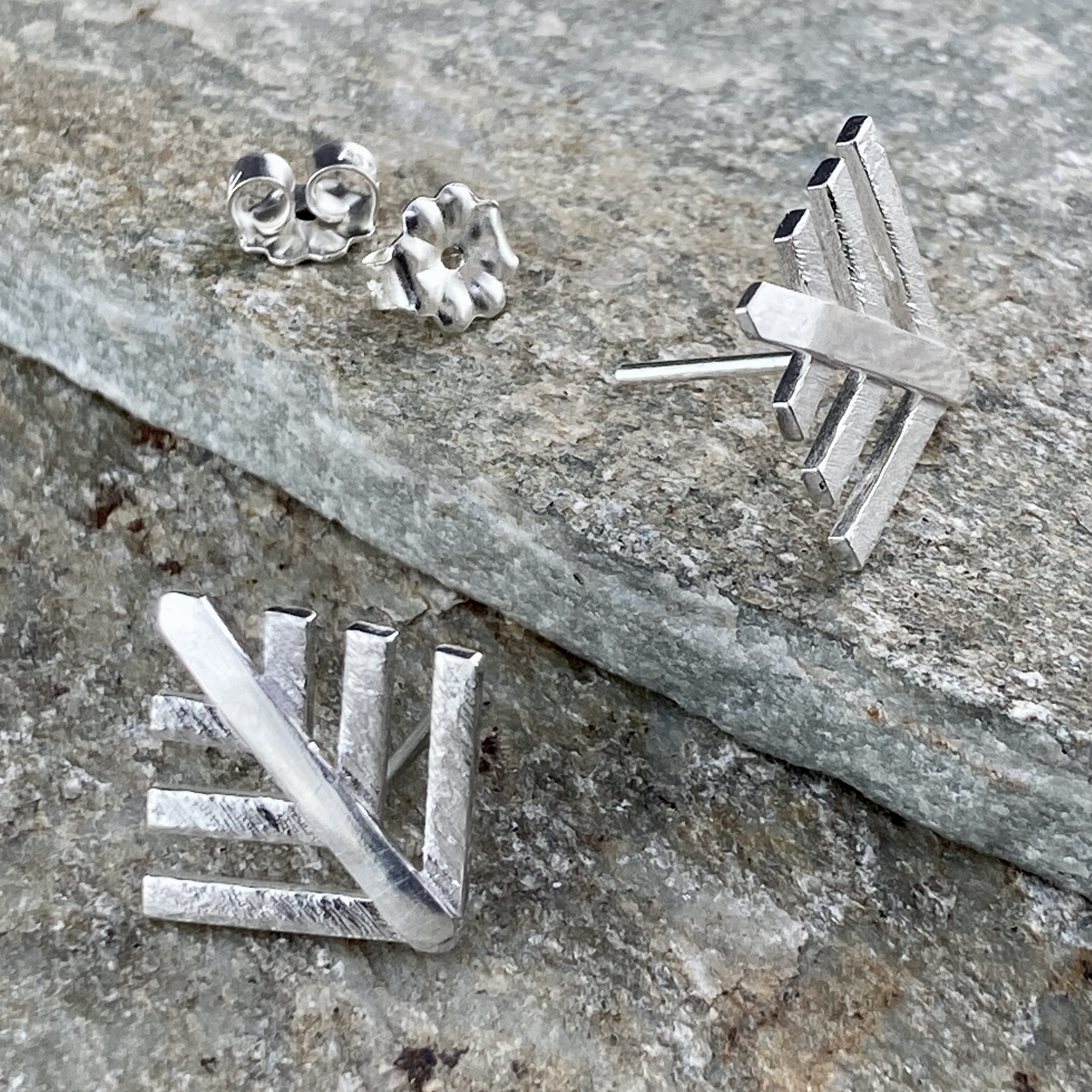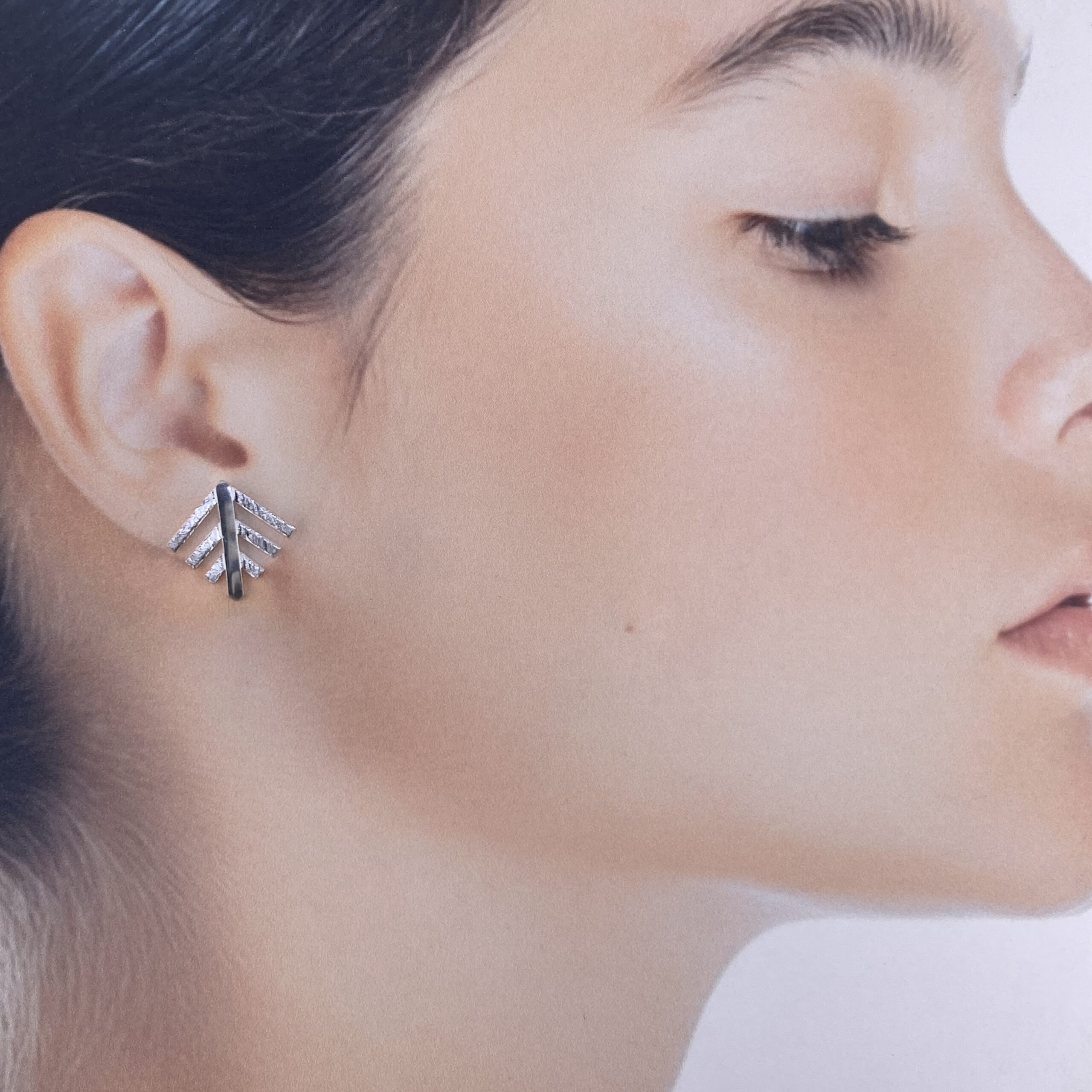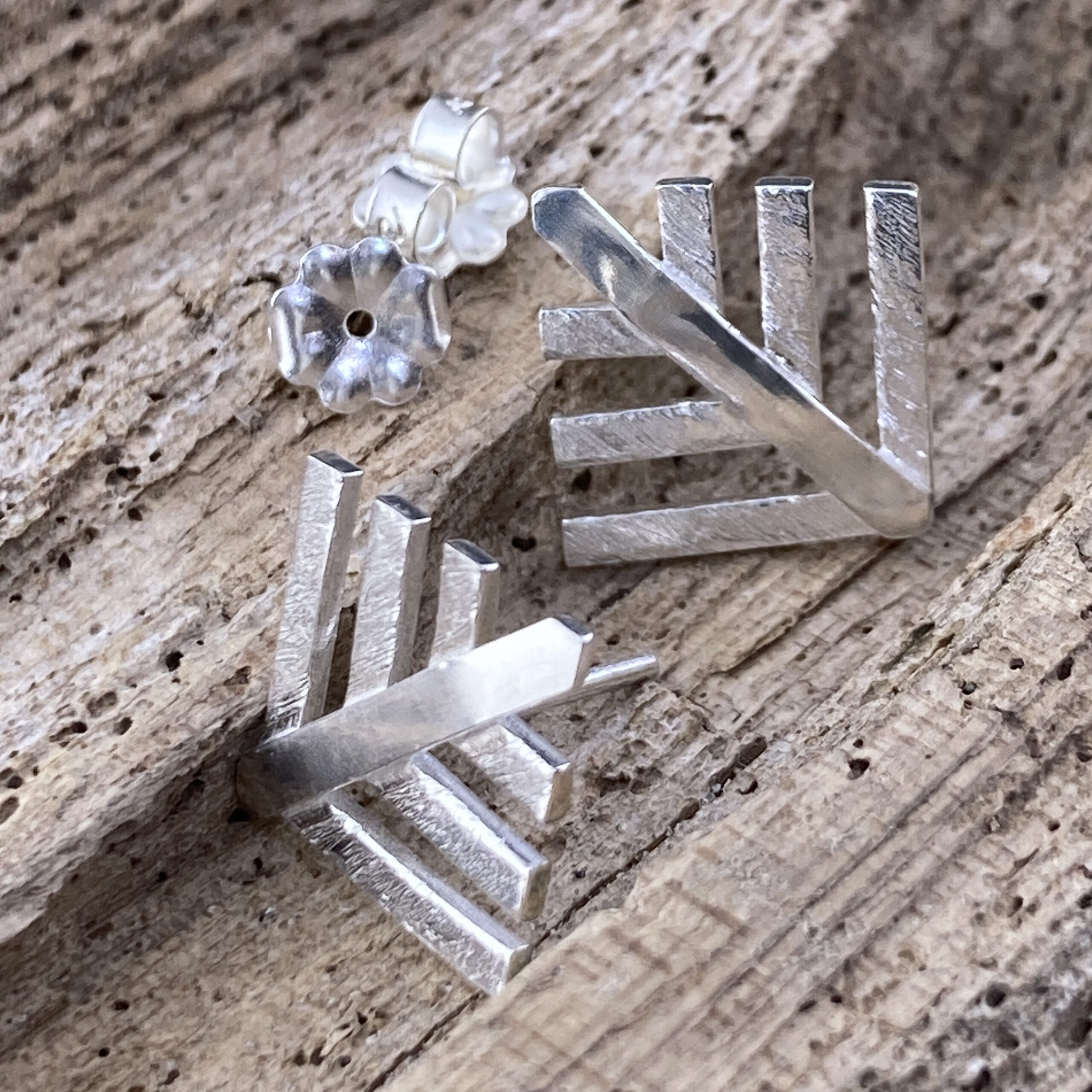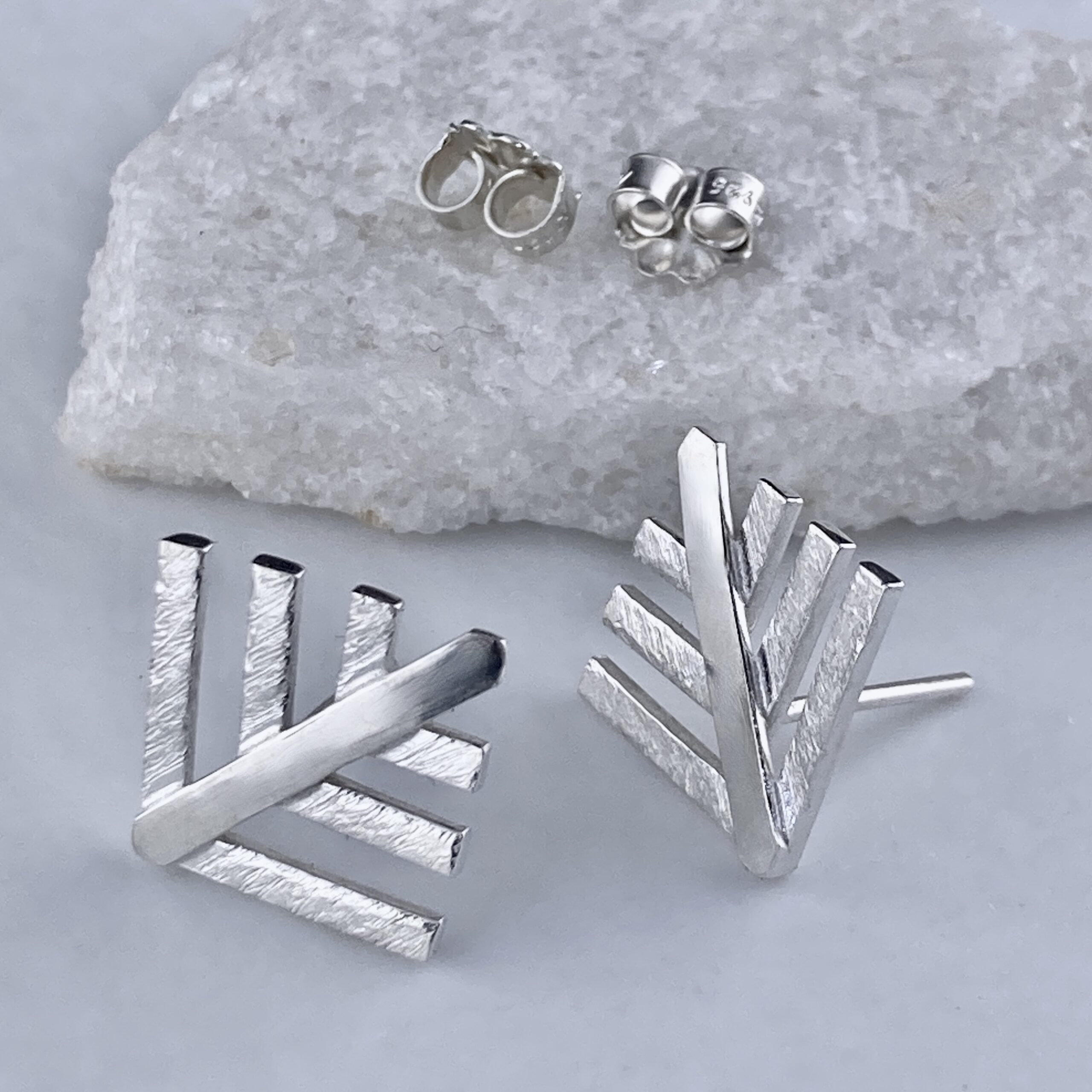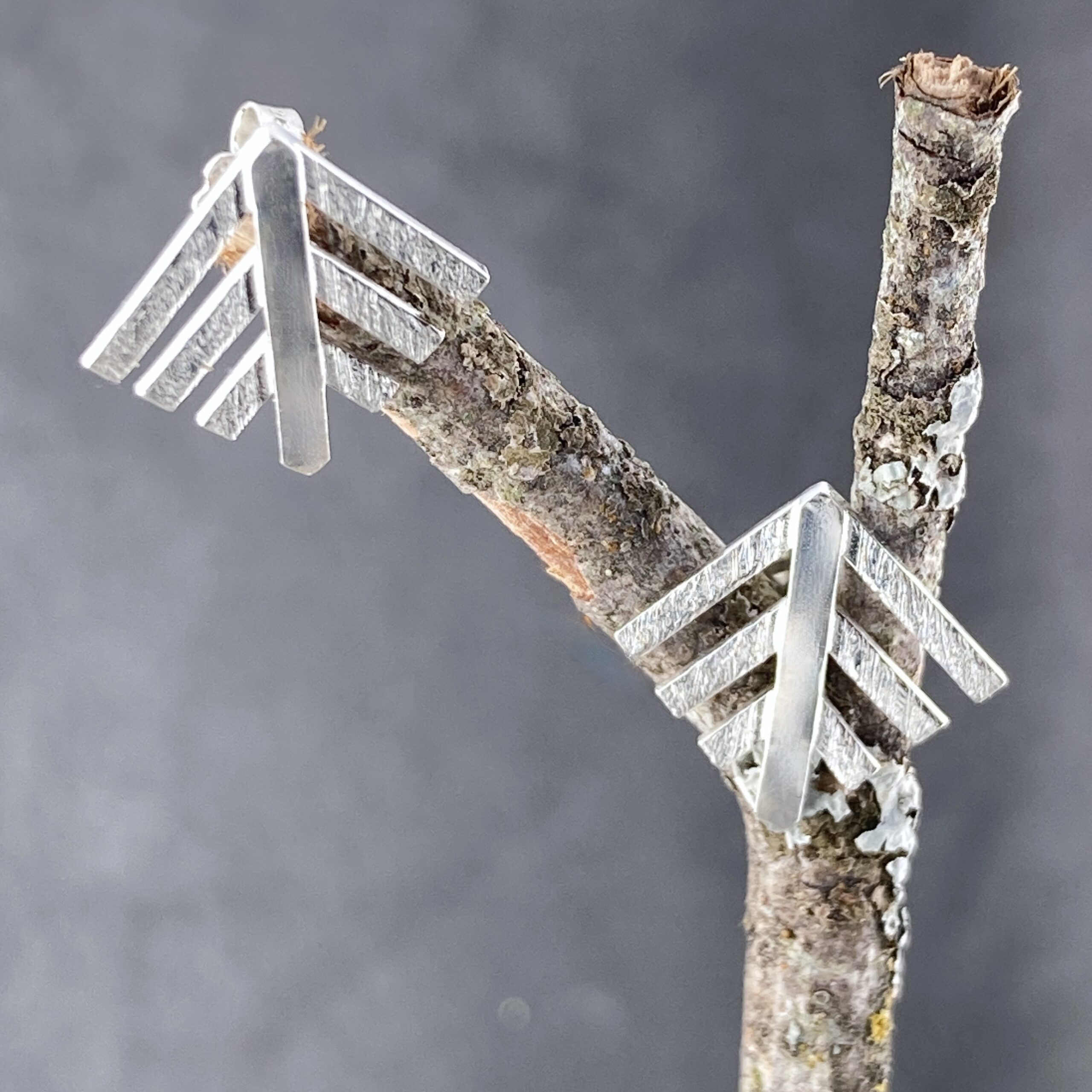 pine tree – geometric – post. Â Argentium silver pine-tree posts. Â Carefully laid out Argentium strips of silver, and then fused together. Â The branches have hand etched detail. Â The post is fused close to the base and the pine tree can be worn facing any direction.