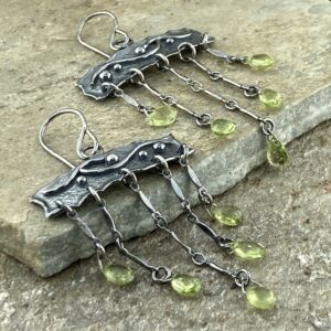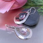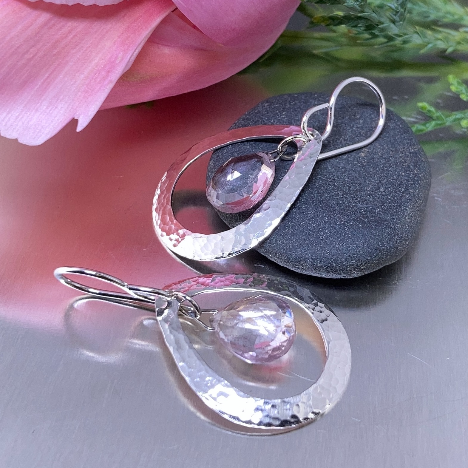 Argentium silver cut out in a teardrop shape, with a matching teardrop shape cut out of the centre.  These ones I have added a hand hammered texture – so much sparkle!  And then suspended a pink Topaz in the middle.