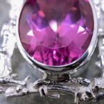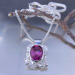 This Pink Topaz is set in the twig pendant with a bezel mounting.  I carefully measure the bezel for each Gemstone.  First I solder the walls of the bezel in a circle.  Which is then shaped to fit the Topaz. Then I attach the wall to the base, and solder again.  More cleaning and polishing and the bezel is ready to solder into the Twig design. Then I can set the gemstone into the bezel, creating this very unique pink topaz surrounded by twigs pendant.