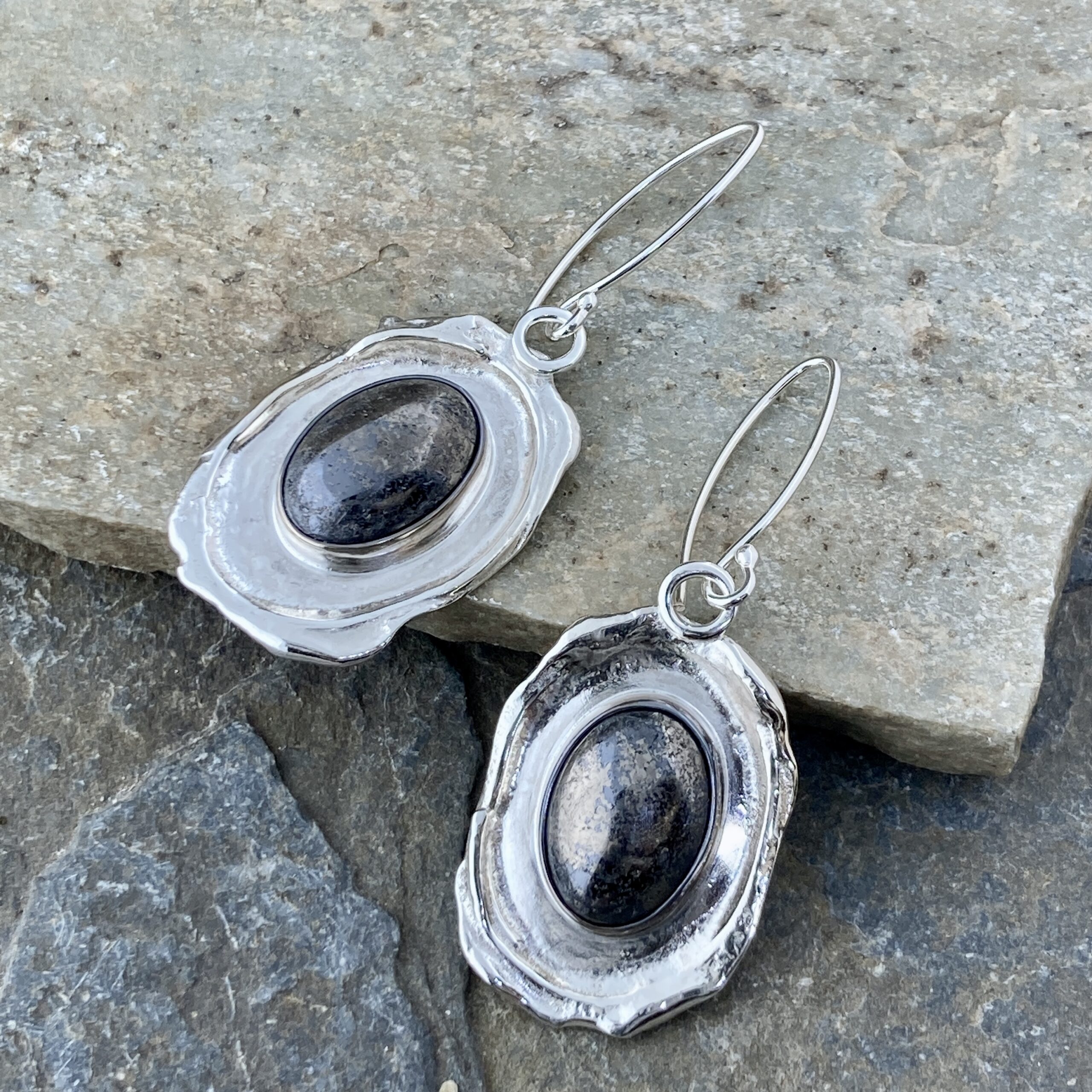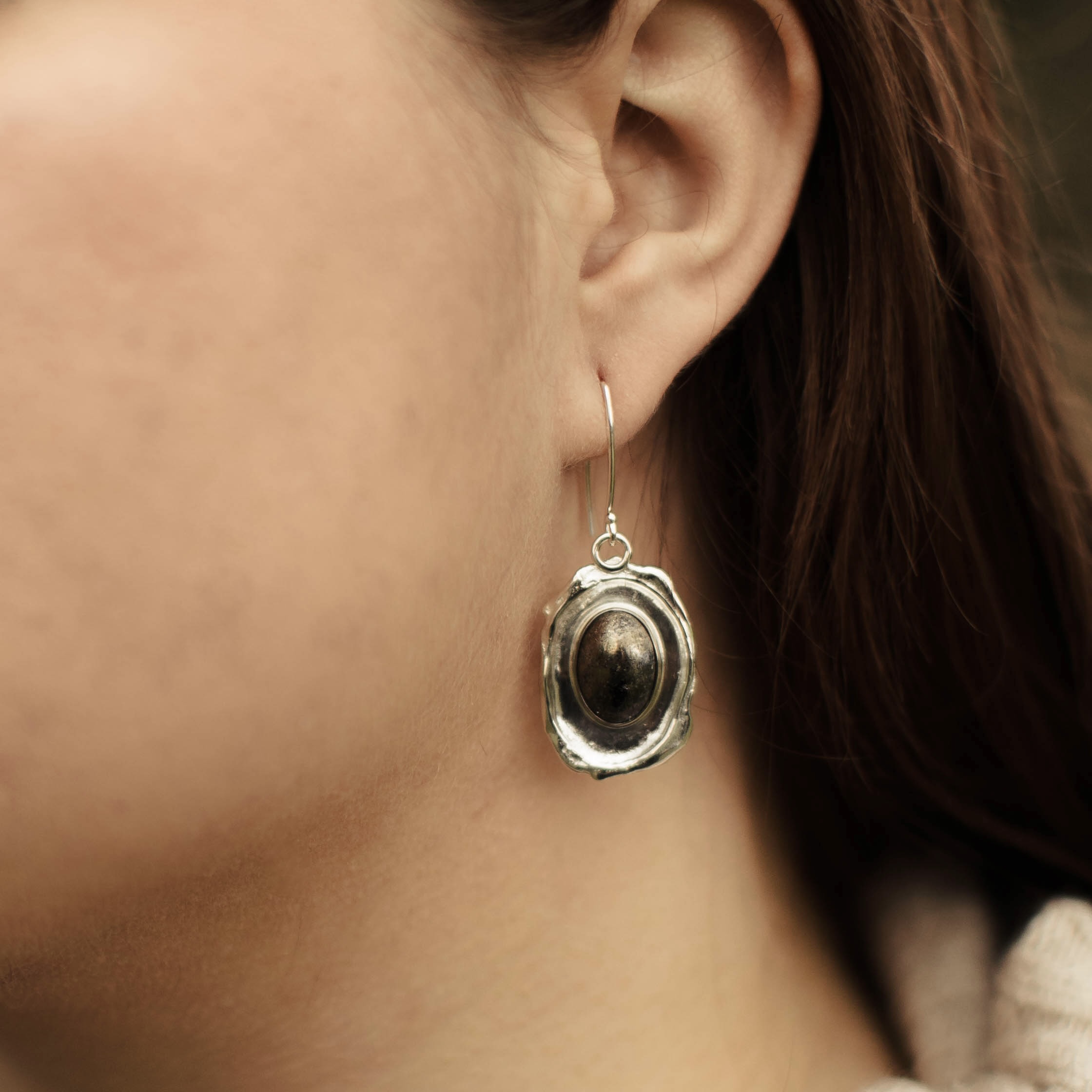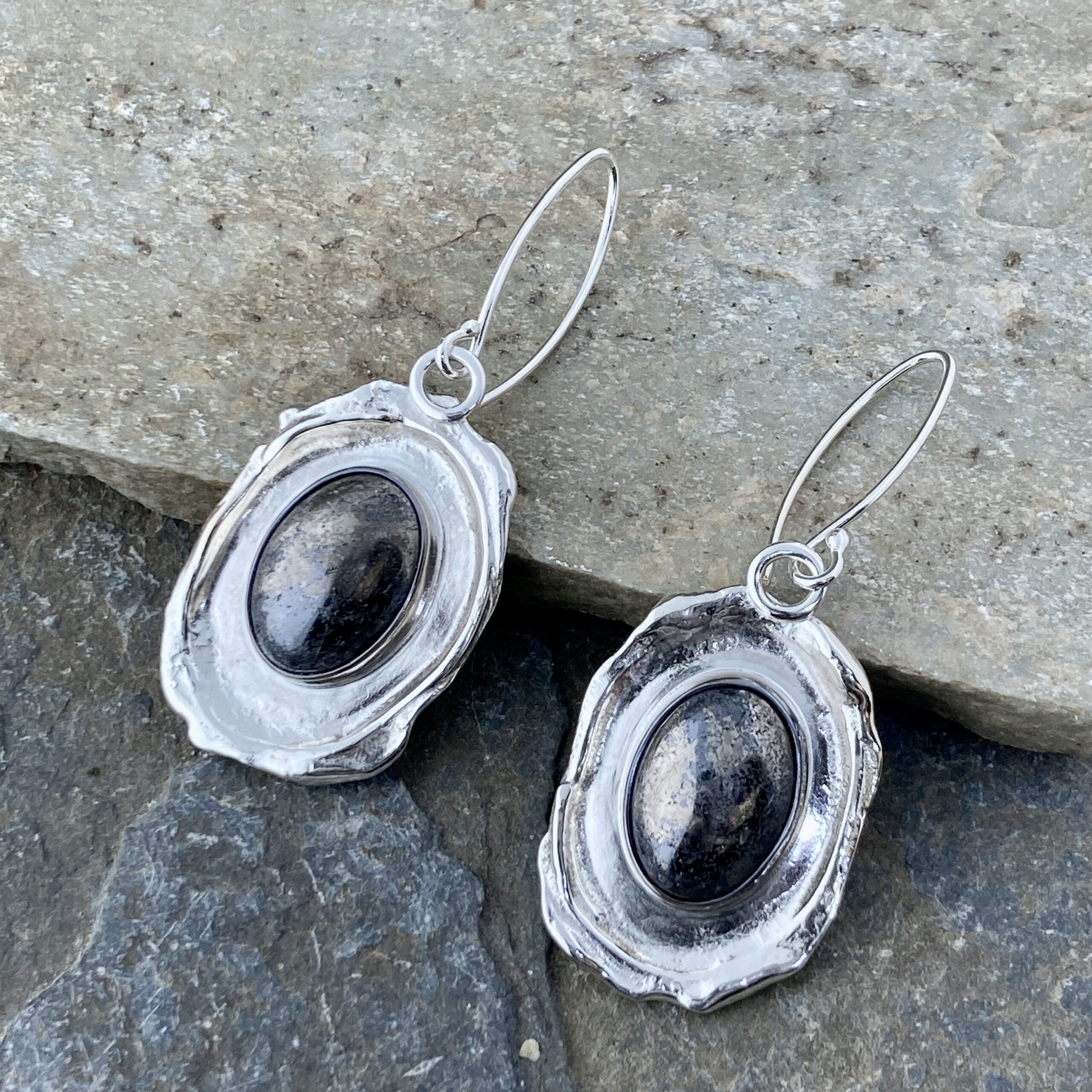 Pyrite gemstone ovals set on an Argentium silver boulder design earring.