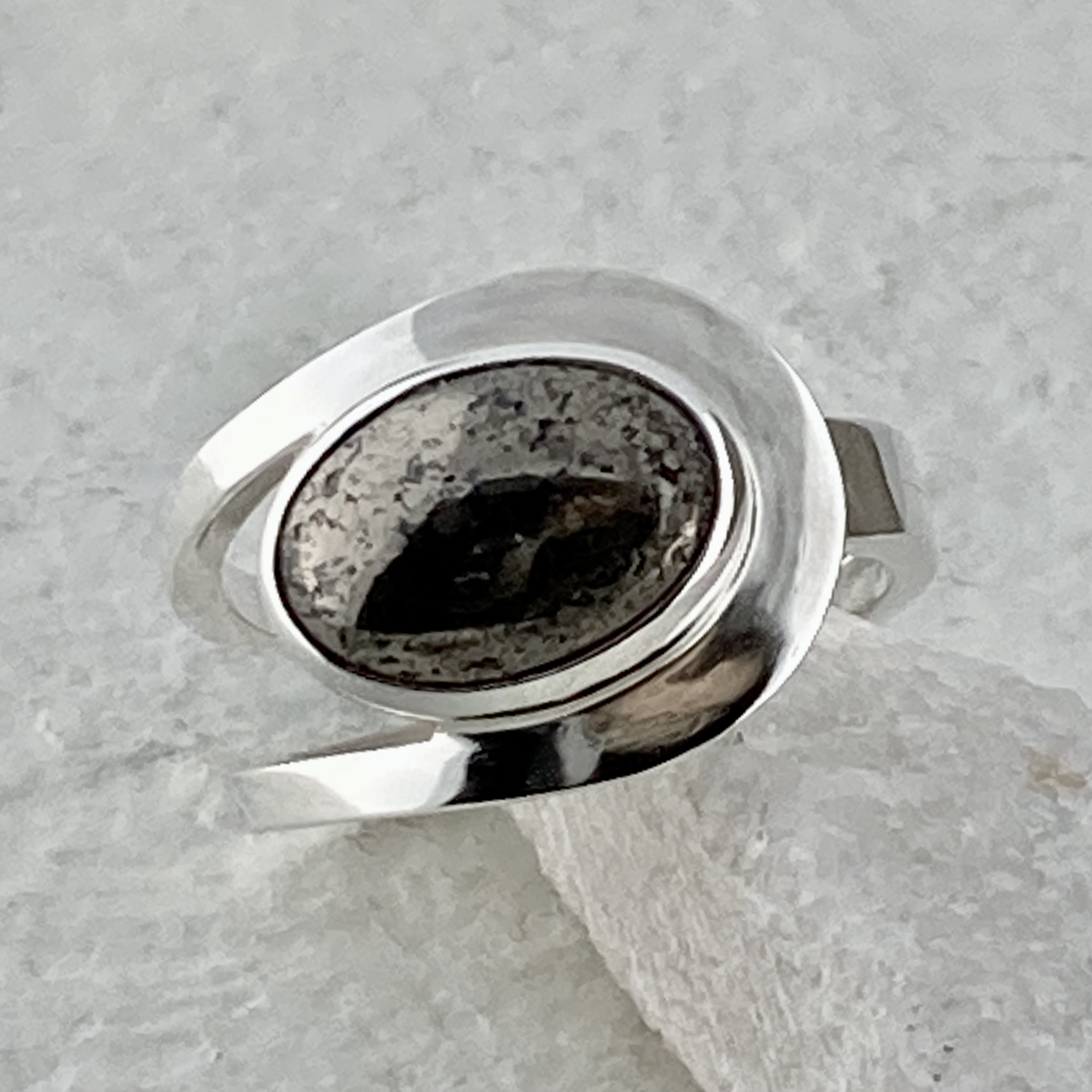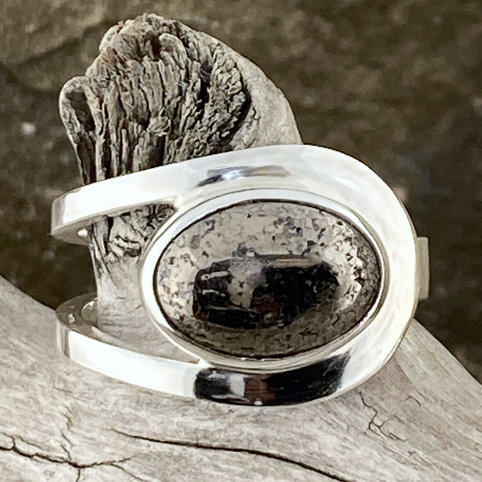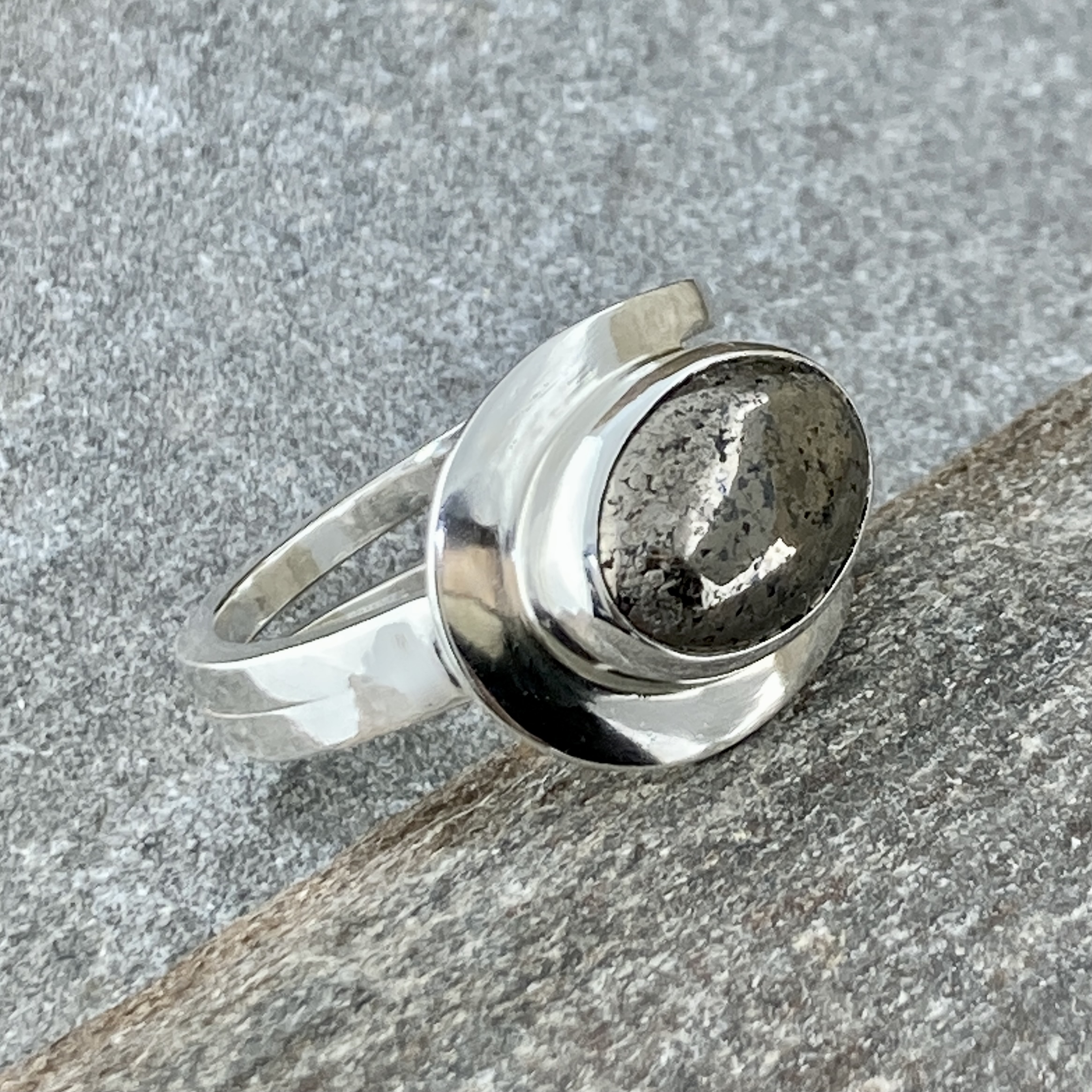 A sculptural Buttonhole design ring, built for balance and strength. The band forms a continuous silver loop that folds inward, creating a natural “buttonhole” cradle for the gemstone. Set within this fold is a 7.5 carat cabochon Pyrite — metallic and reflective, with the distinct character of stone and metal combined.
