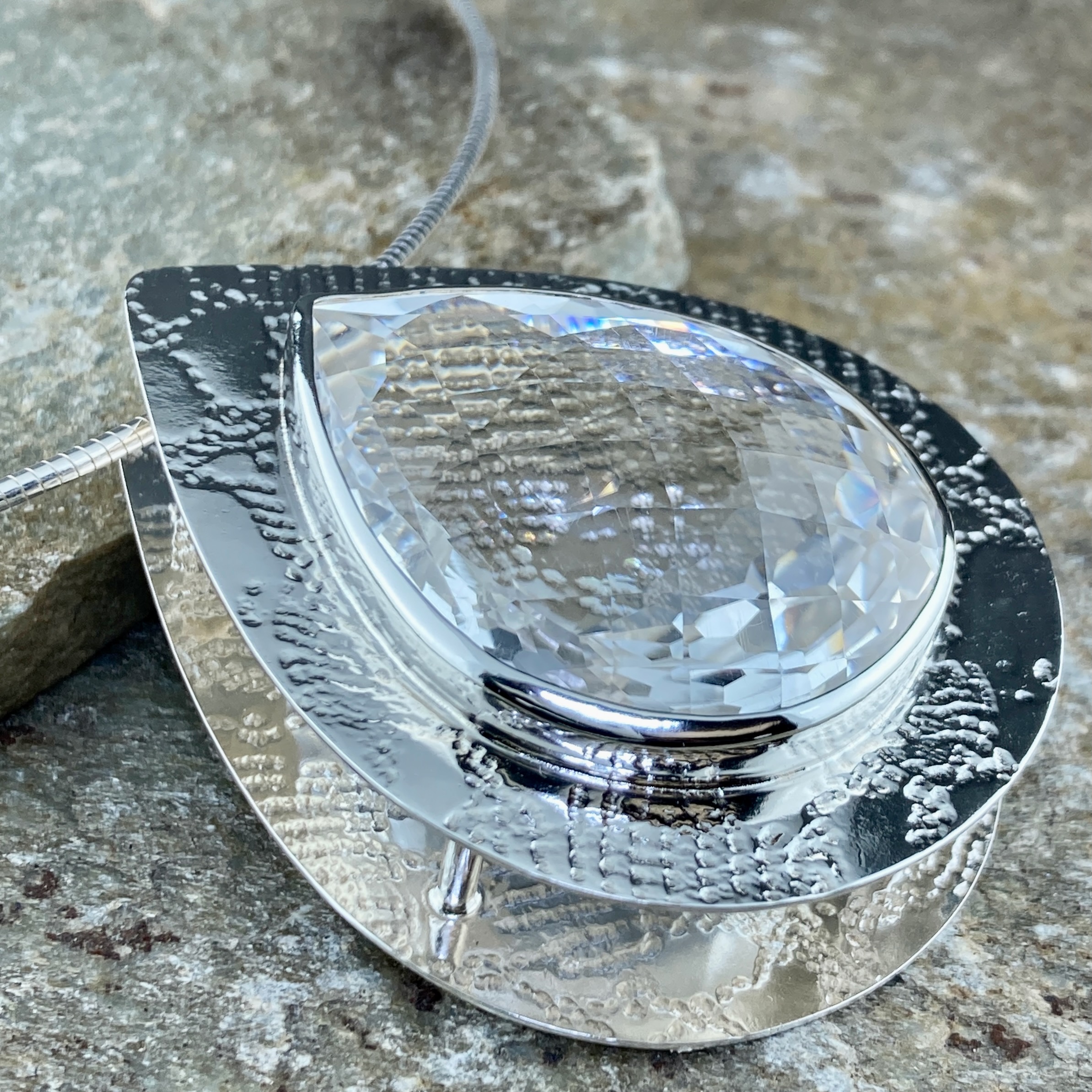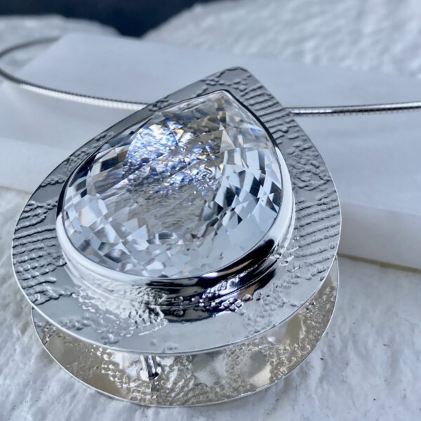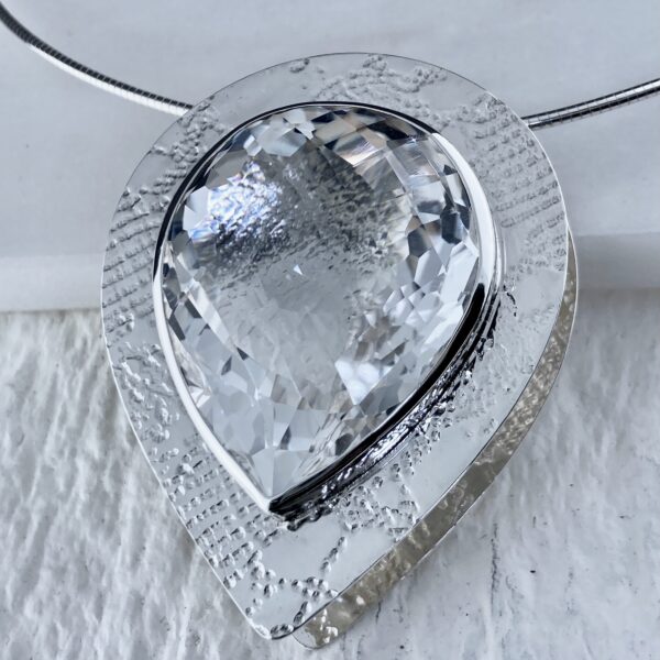 This pendant is a very beautiful, 109 carat Quartz. Â This Quartz was mined in Africa and is rated IF (internally flawless). Â It has been cut in a teardrop shape with a checkerboard finish. Â I started with two sheets of Argentium silver which I textured with lace. Â I then added silver bars to create a ‘cage’ to hold this deep, large gemstone. Â A really nice benefit of the ‘cage’ setting is than the chain or collar goes between the bars, rather than the a bail. Â The pendant hangs very securely and with less movement because of this unusual design.