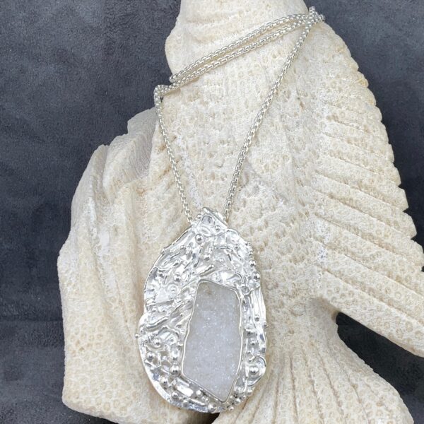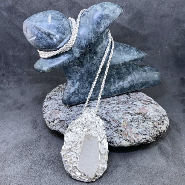 This is natural, raw Quartz.  In a freeform rectangle shape.  Bezel set in a very solid, large Argentium silver pendant.