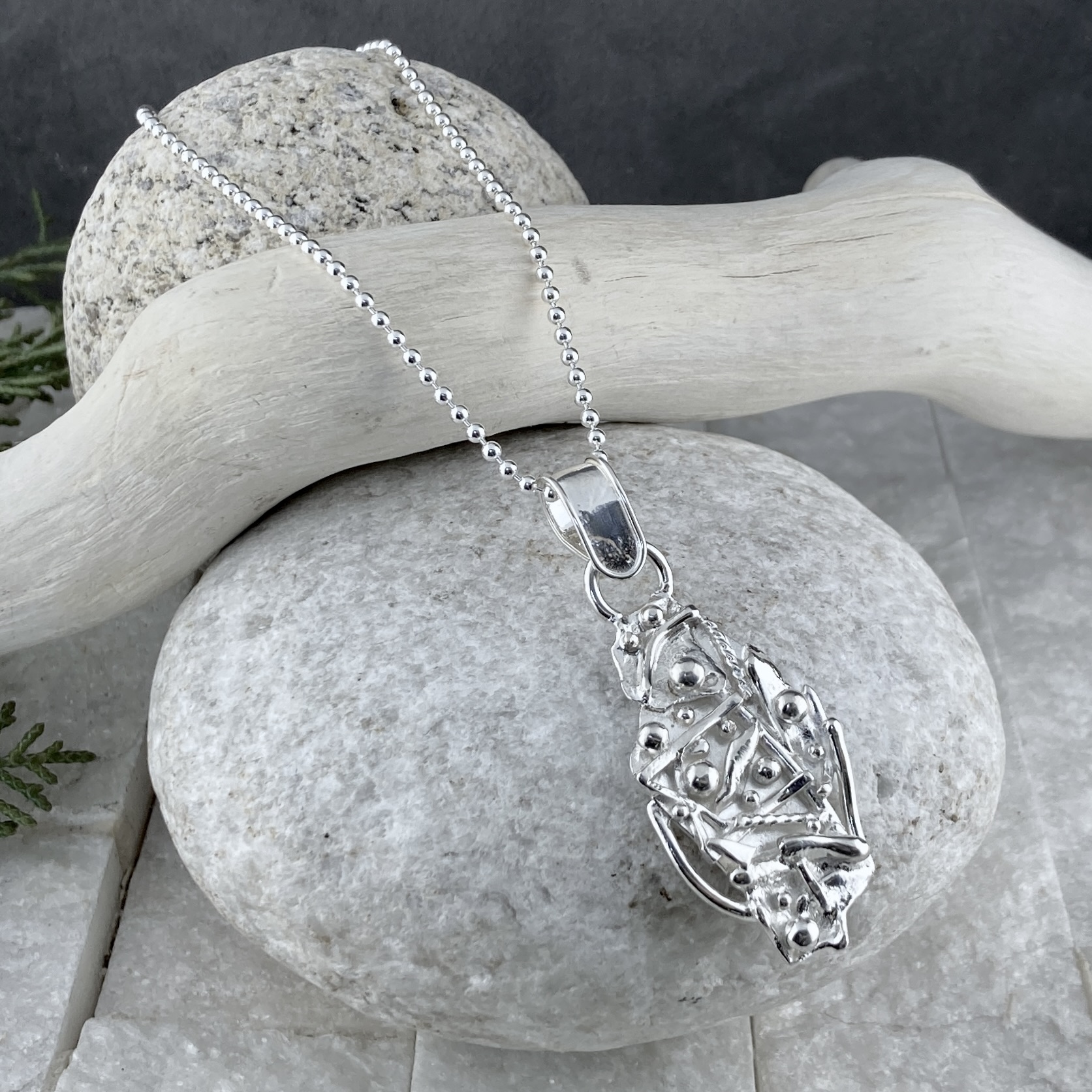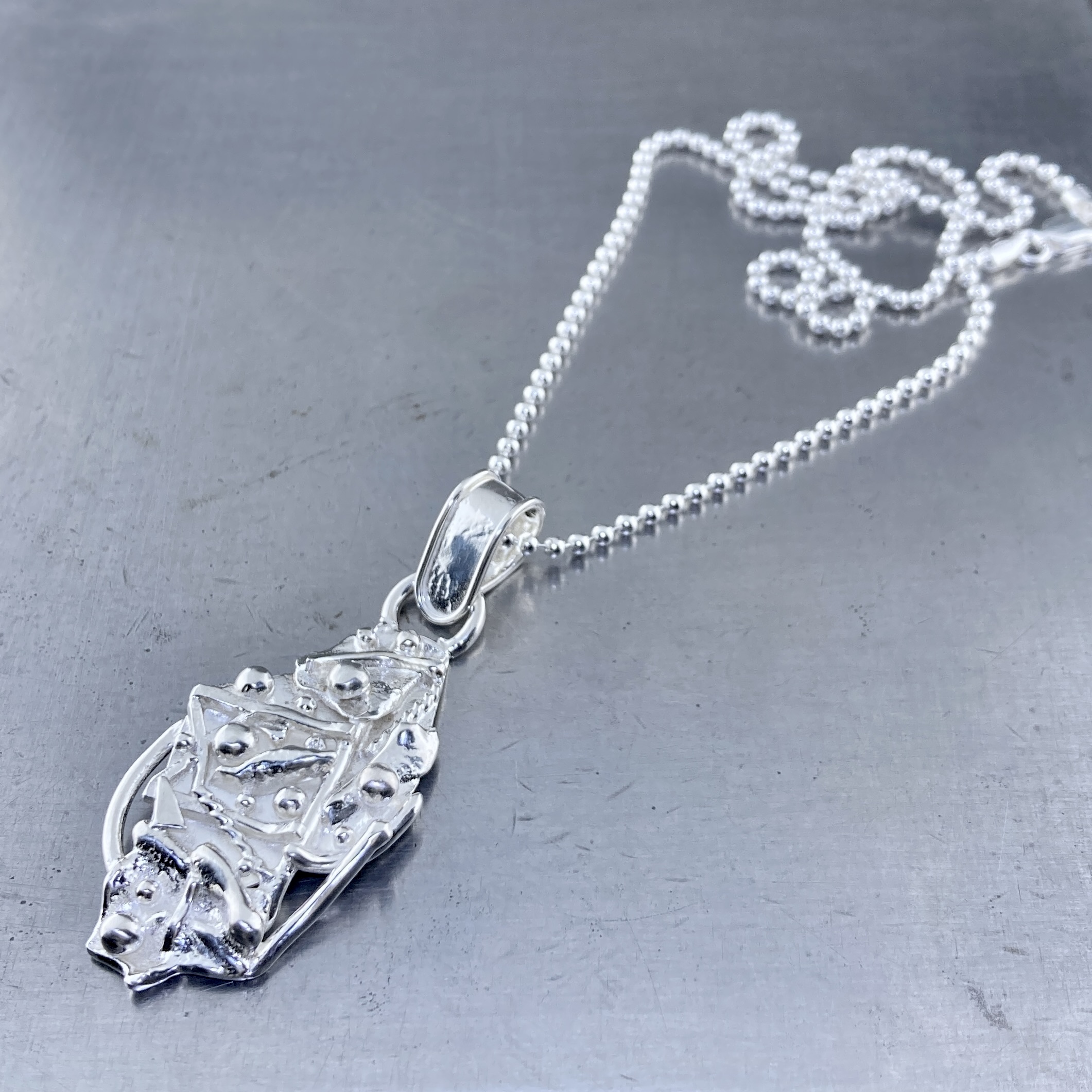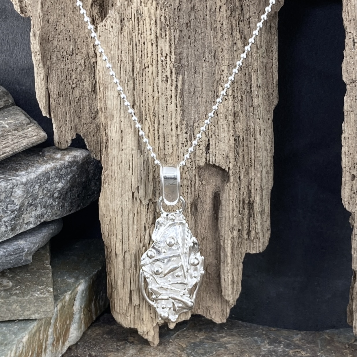 Rapids design pendant – abstract shape. The rapids design is the most turbulent of the molten silver Water designs.