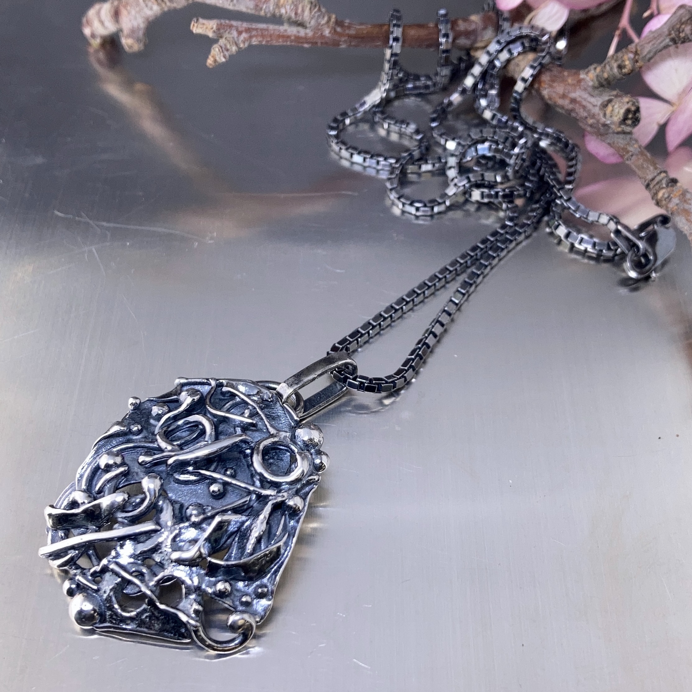 This is a Rapids design – the most turbulent of the Water designs.  So much action and motion in a silver pendant.  This one has a permanent antique finish.
