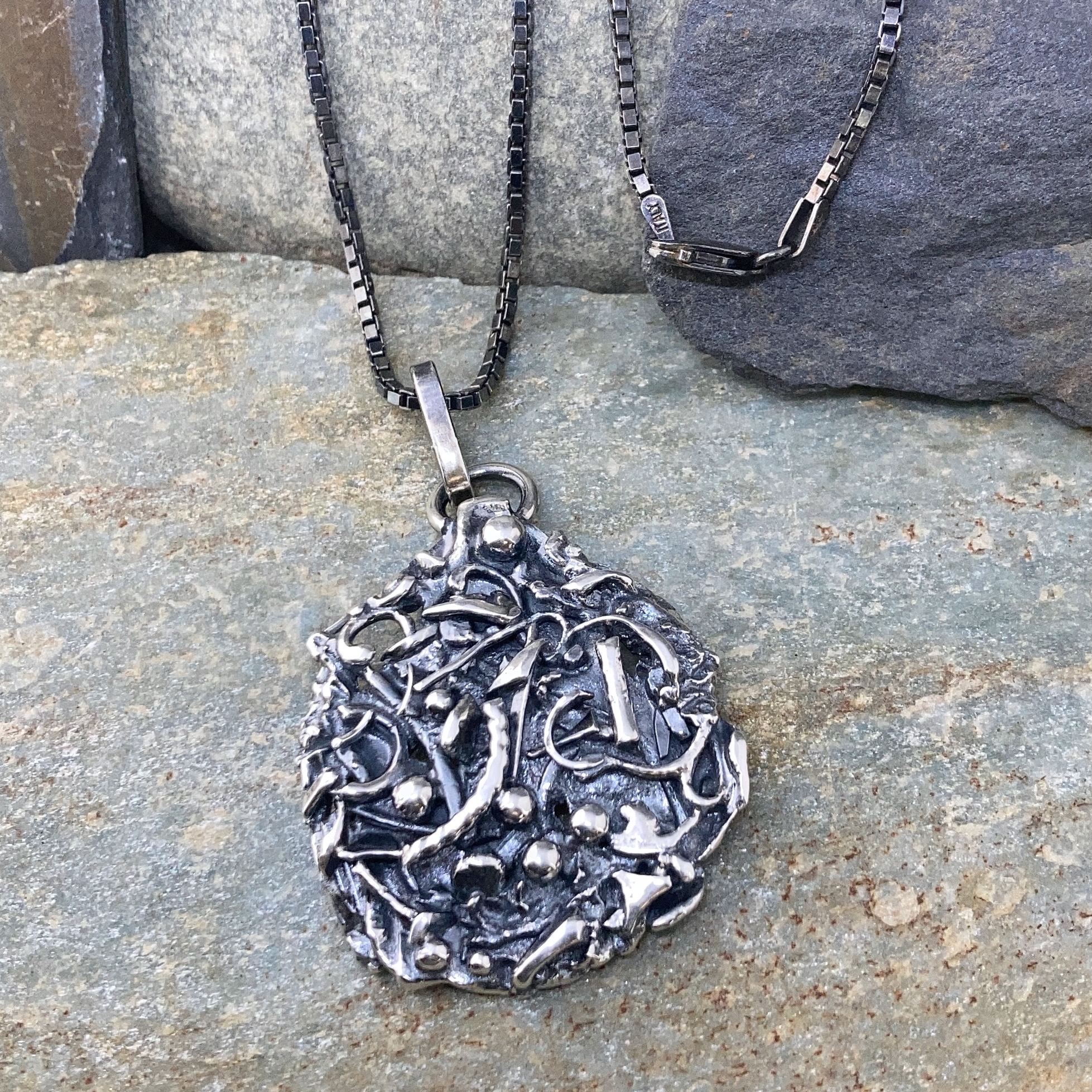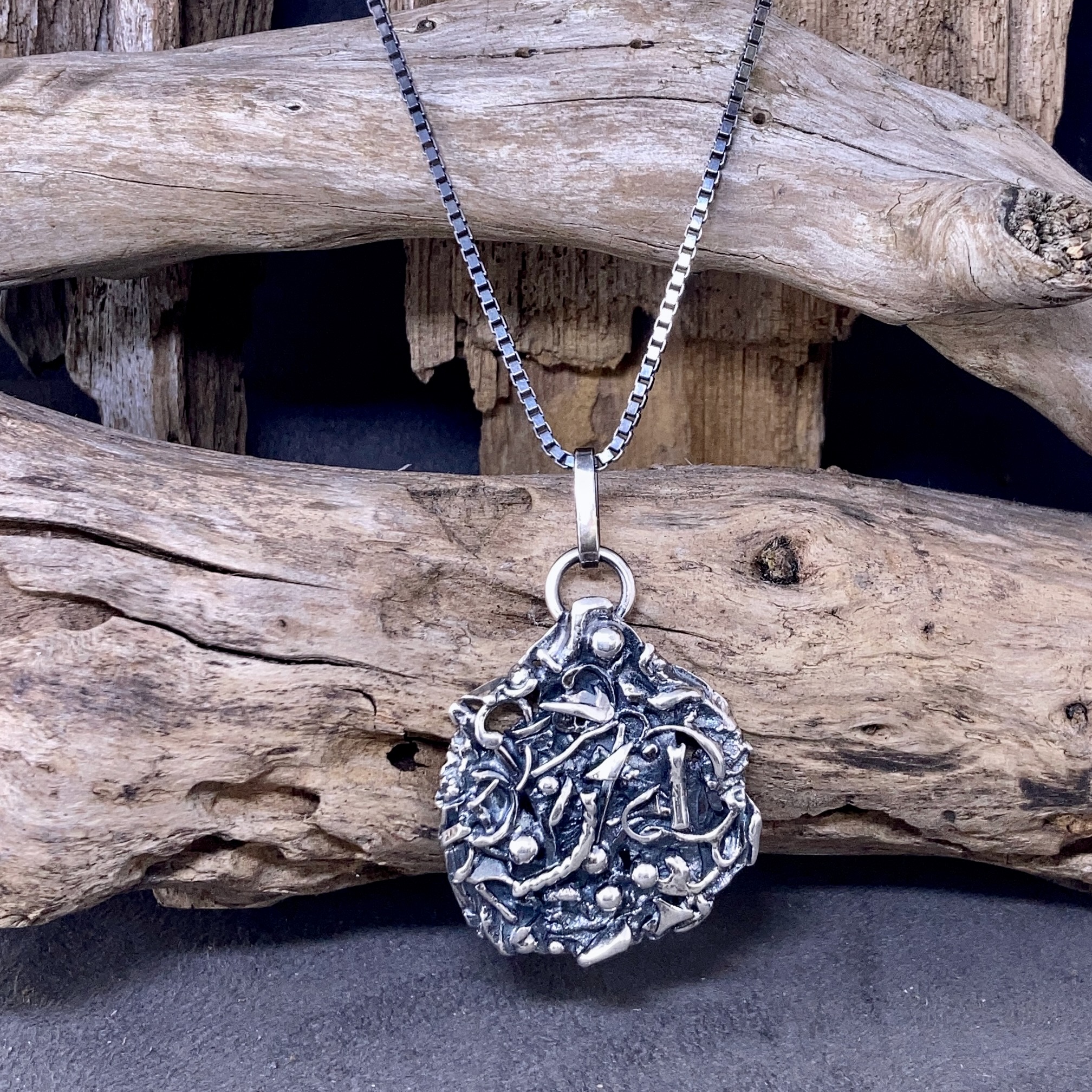 This is a Rapids design – the most turbulent of the Water designs.  So much action and motion in a silver pendant.  The antique finish is permanent and it never needs polishing.