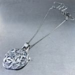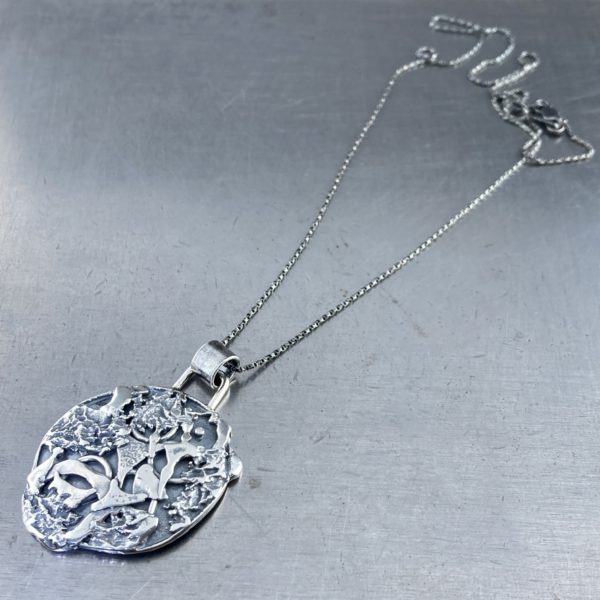 Included with the pendant is an 18″ Sterling Silver Twisted box chain – antiqued to match the pendant.