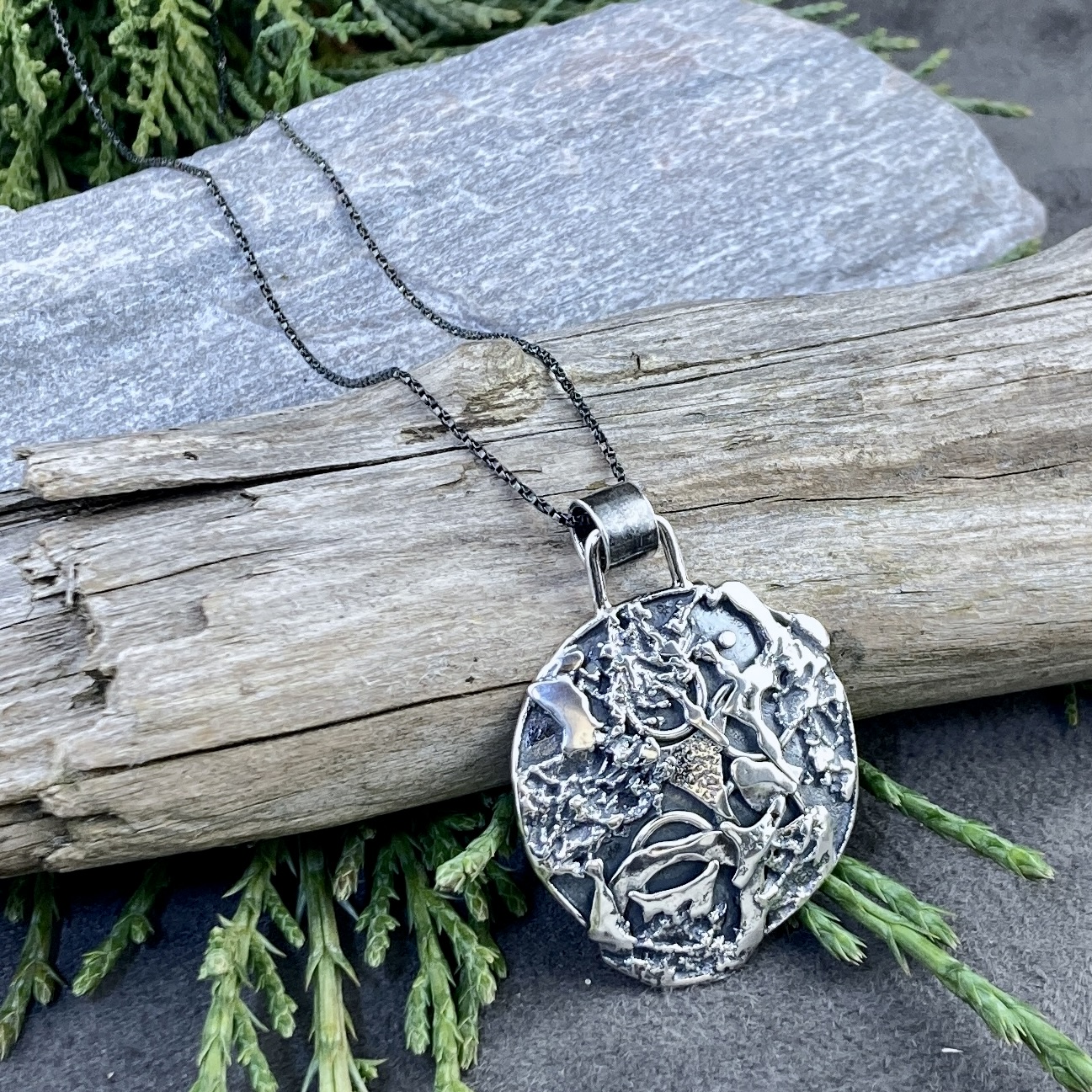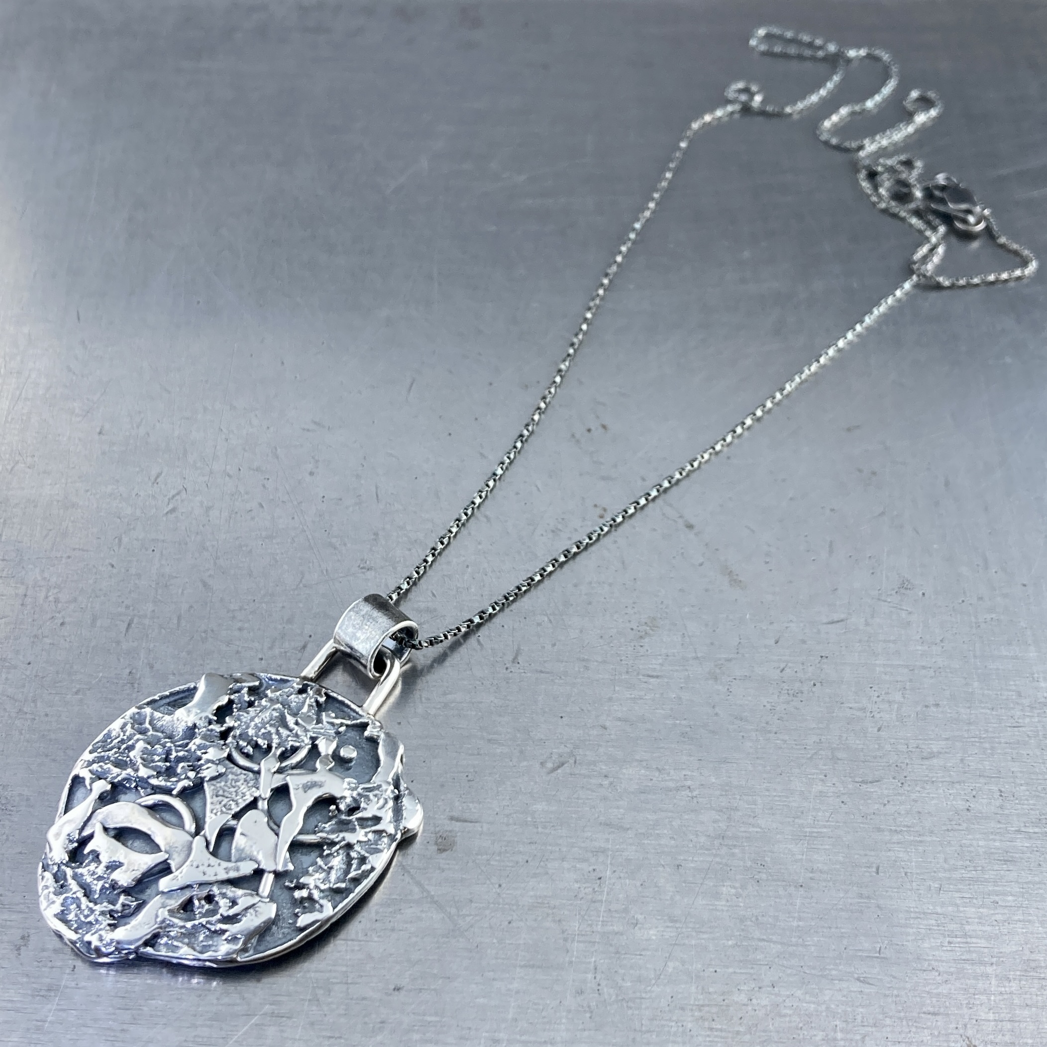 Rapids design antique pendant.  A handmade pendant in solid Argentium silver, in a round shape.