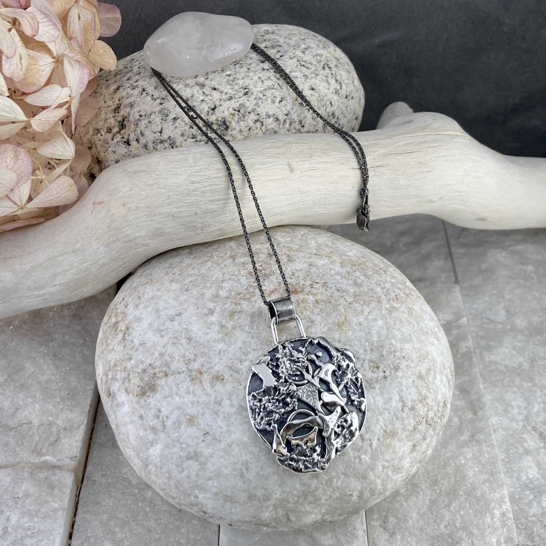 Rapids design antique pendant – in a rough round shape and with an antique finish.  The antique finish is permanent and it never needs polishing.