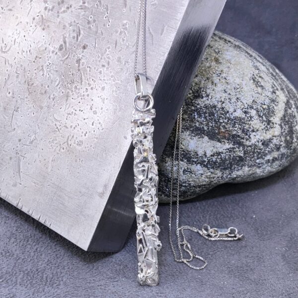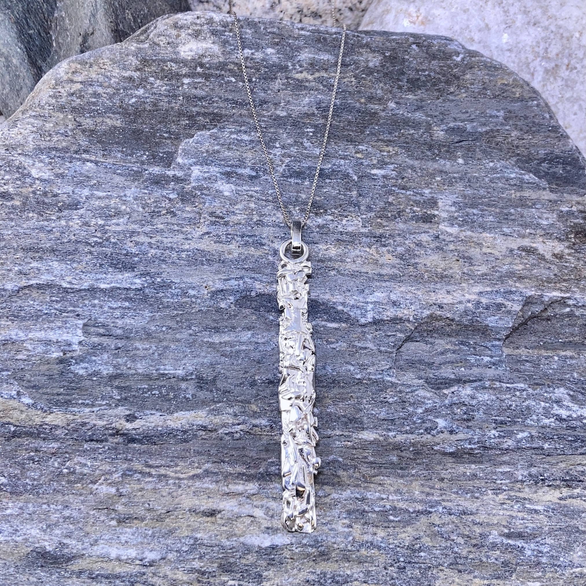 Handmade with Argentium silver. I melt the silver and then manipulate it with a pic until I have a nice Rapids design. This pendant I have shaped as a long, elegant rectangle shape.