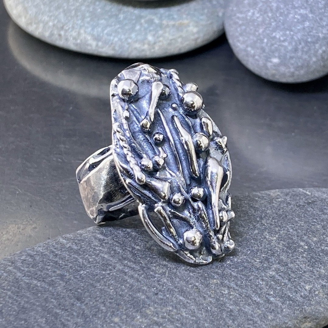 Argentium silver that I have melted and manipulated.  Then fused granules and bits of silver for a turbulent Rapids design.  With and antique finish that is permanent and never needs cleaning.