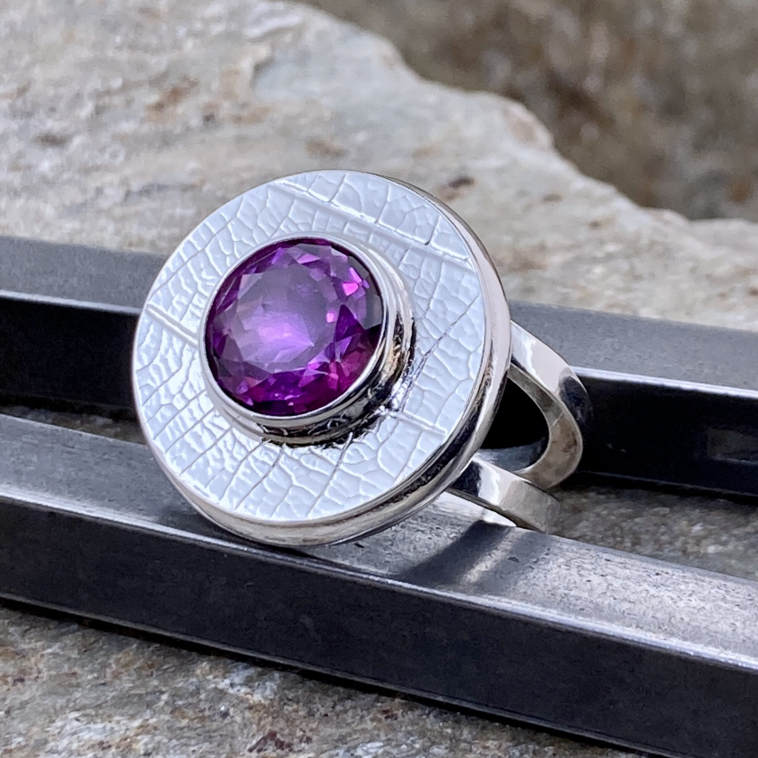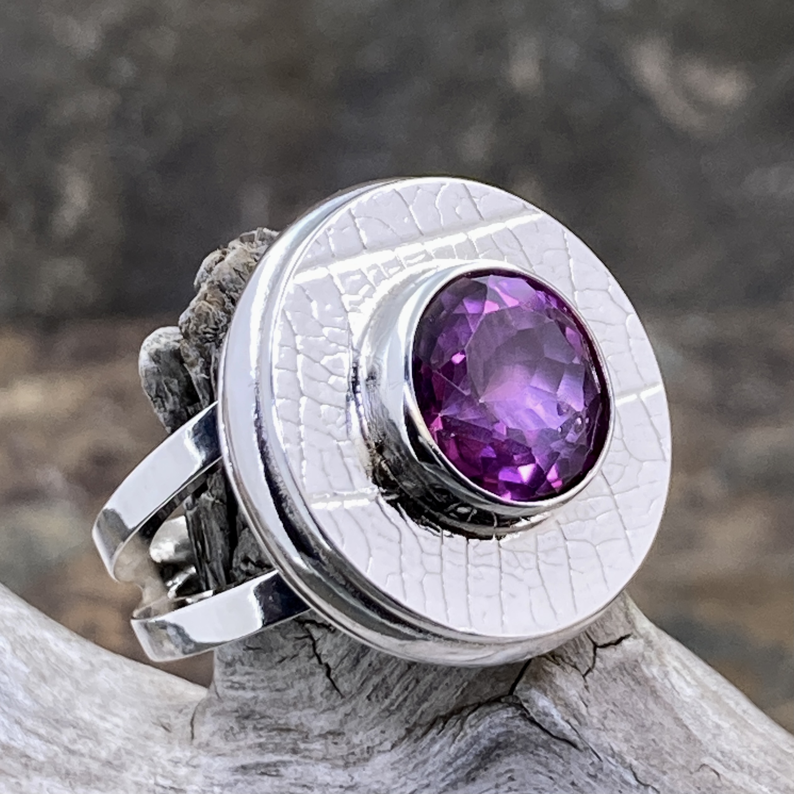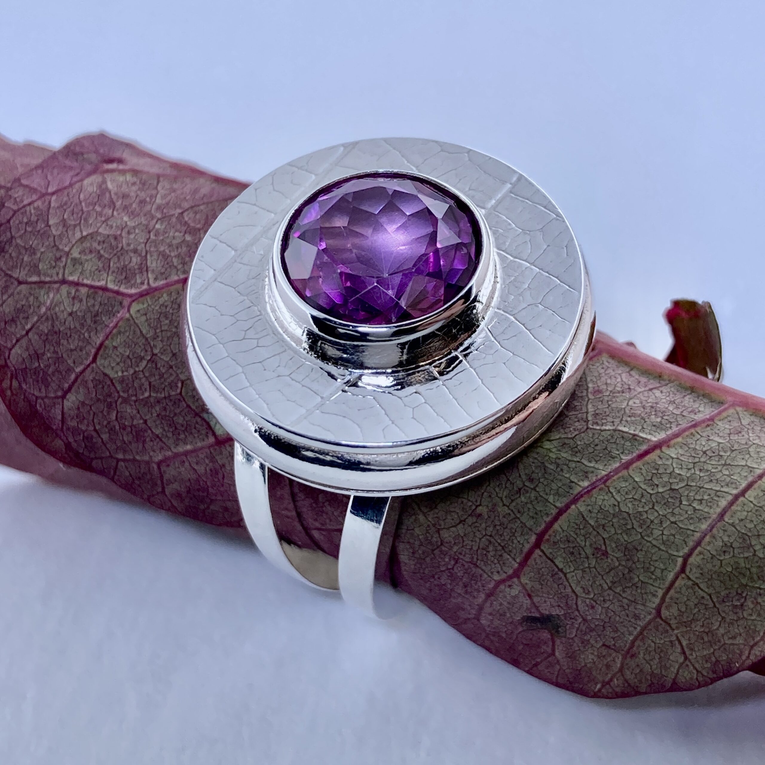 I create the Double-Band design using two curved bands that join at the back for strength and comfort. A domed “Full Moon” disc crowns the top, textured with a real magnolia leaf to imprint its delicate pattern into the silver. The 7.5-carat Raspberry Topaz is bezel-set at the centre — a glowing focal point against the moon’s surface.