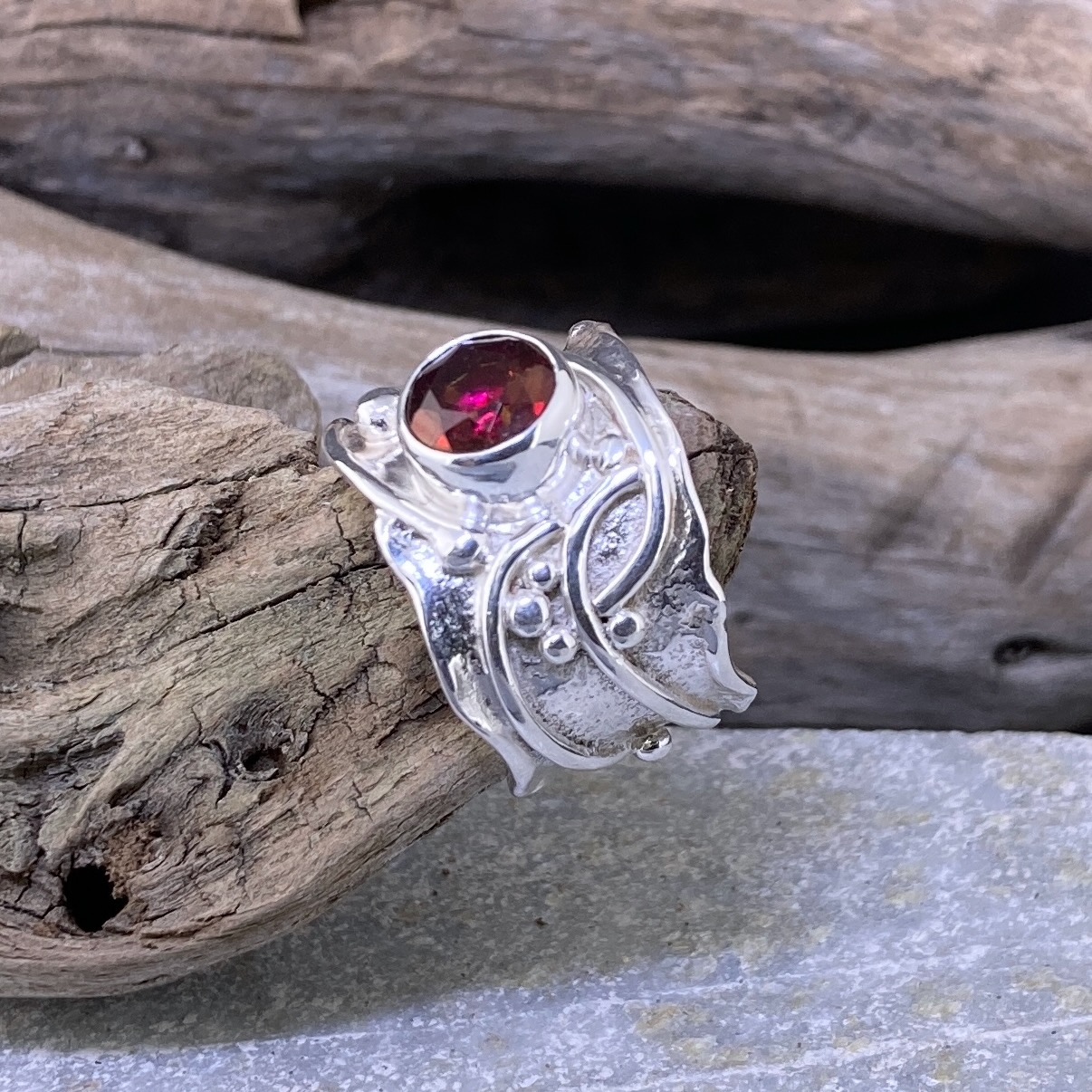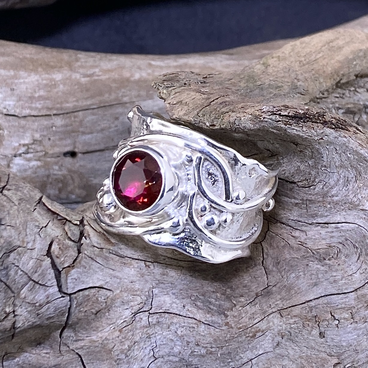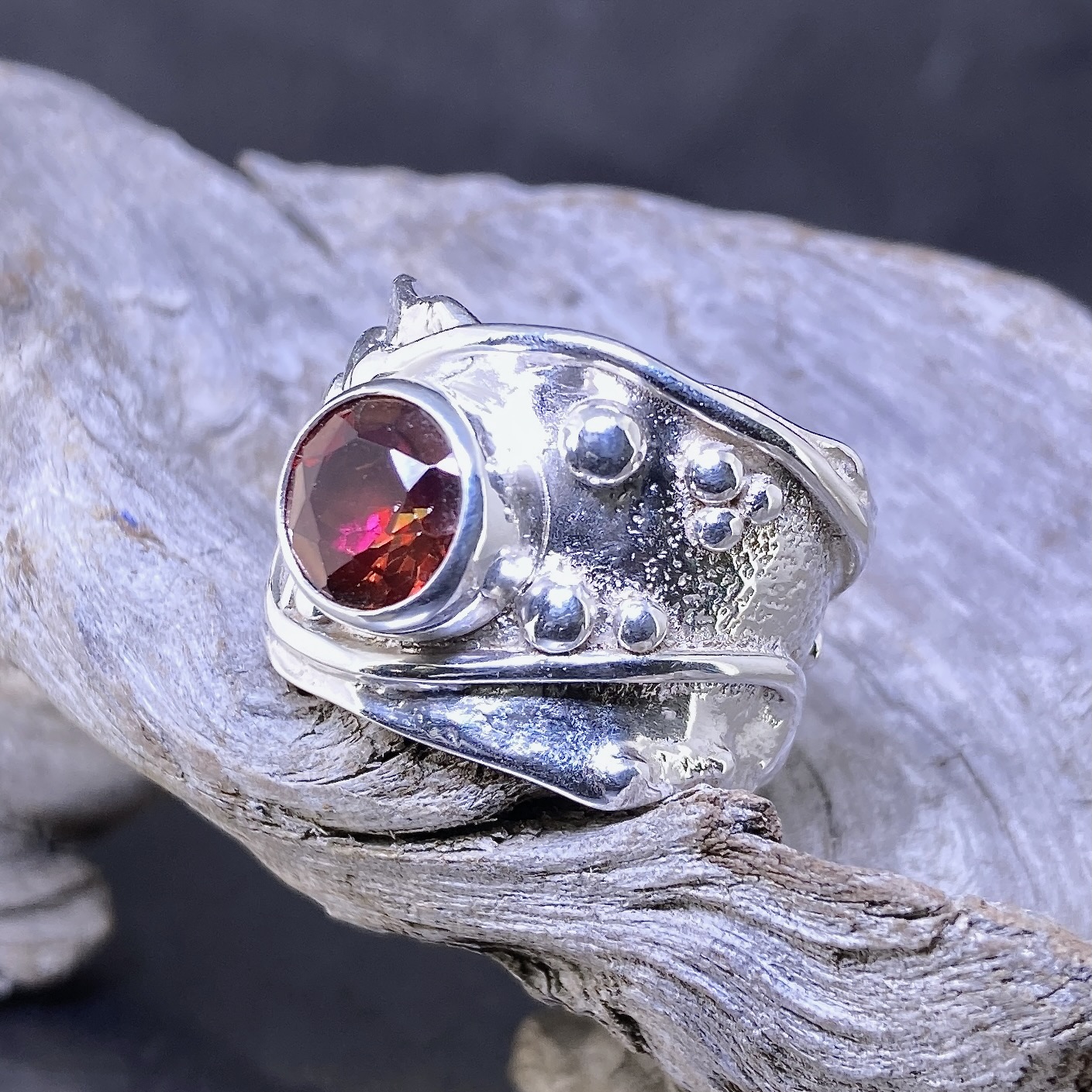 This brilliant-cut Red Topaz sits securely in a hand-formed Argentium silver Waves band. I shape and solder the silver to create flowing movement across the surface. Then I set the 2.5 carat gemstone so it captures light from every angle. The result is bold, luminous, and balanced.