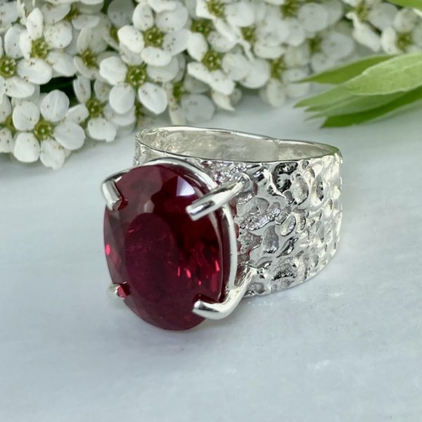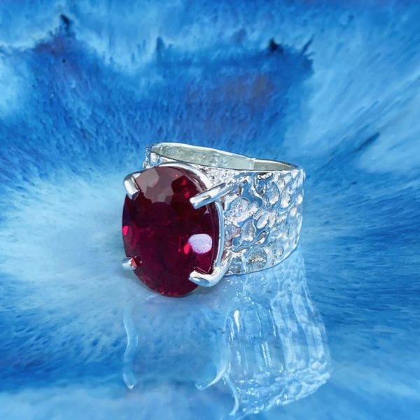 I shape and fuse the silver to form a flowing lunar surface, polishing the raised edges to create contrast. After refining the form, I set the Red Topaz into a prong mount, letting the light pass through to reveal depth and warmth. The finished ring feels celestial and full of quiet power.