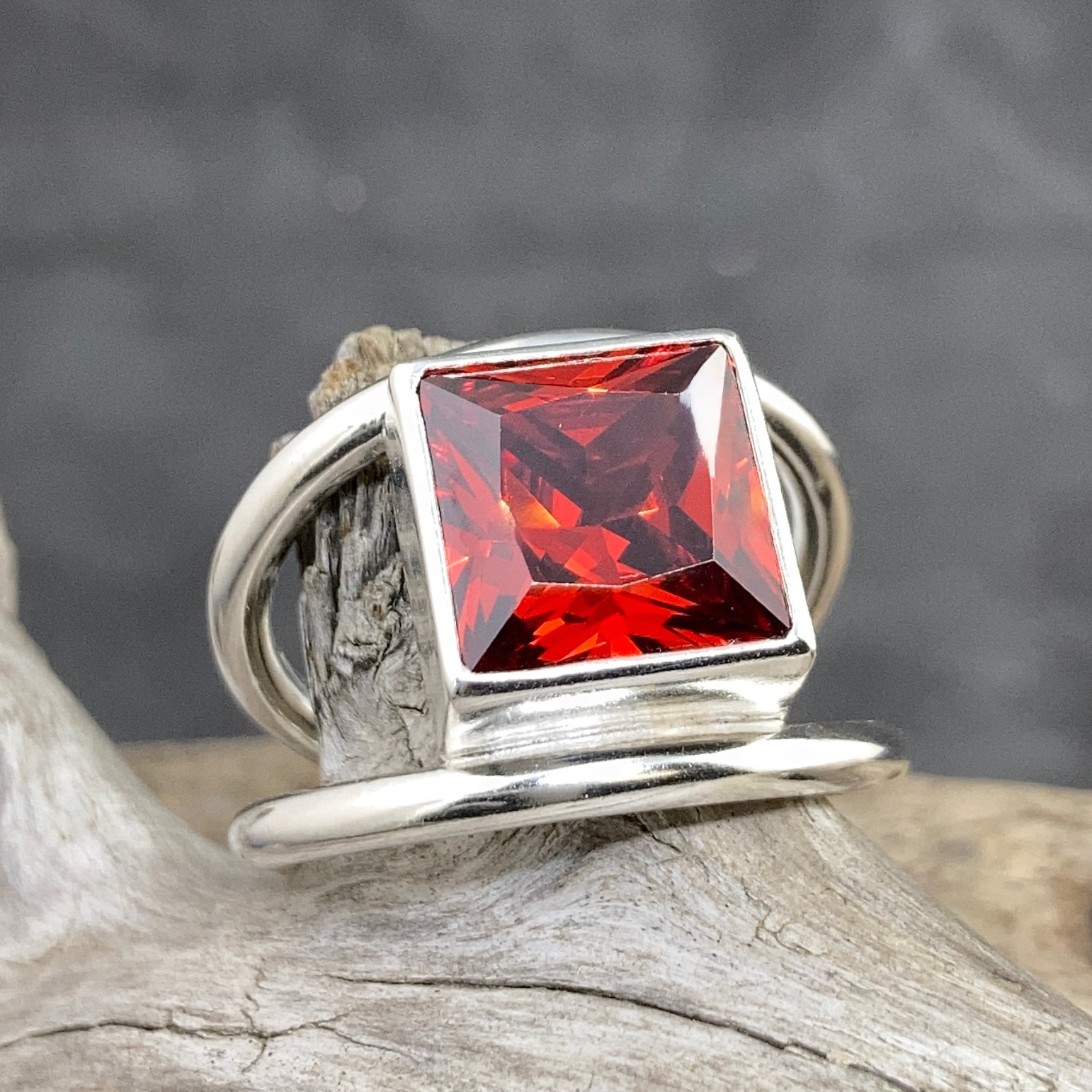 A striking Round Double-Band ring handcrafted in solid Argentium silver. The 9.5 carat square Red Topaz glows with vibrant fire, set securely between two heavy round bands. This design highlights clean form and strength, bringing color and precision into perfect balance.