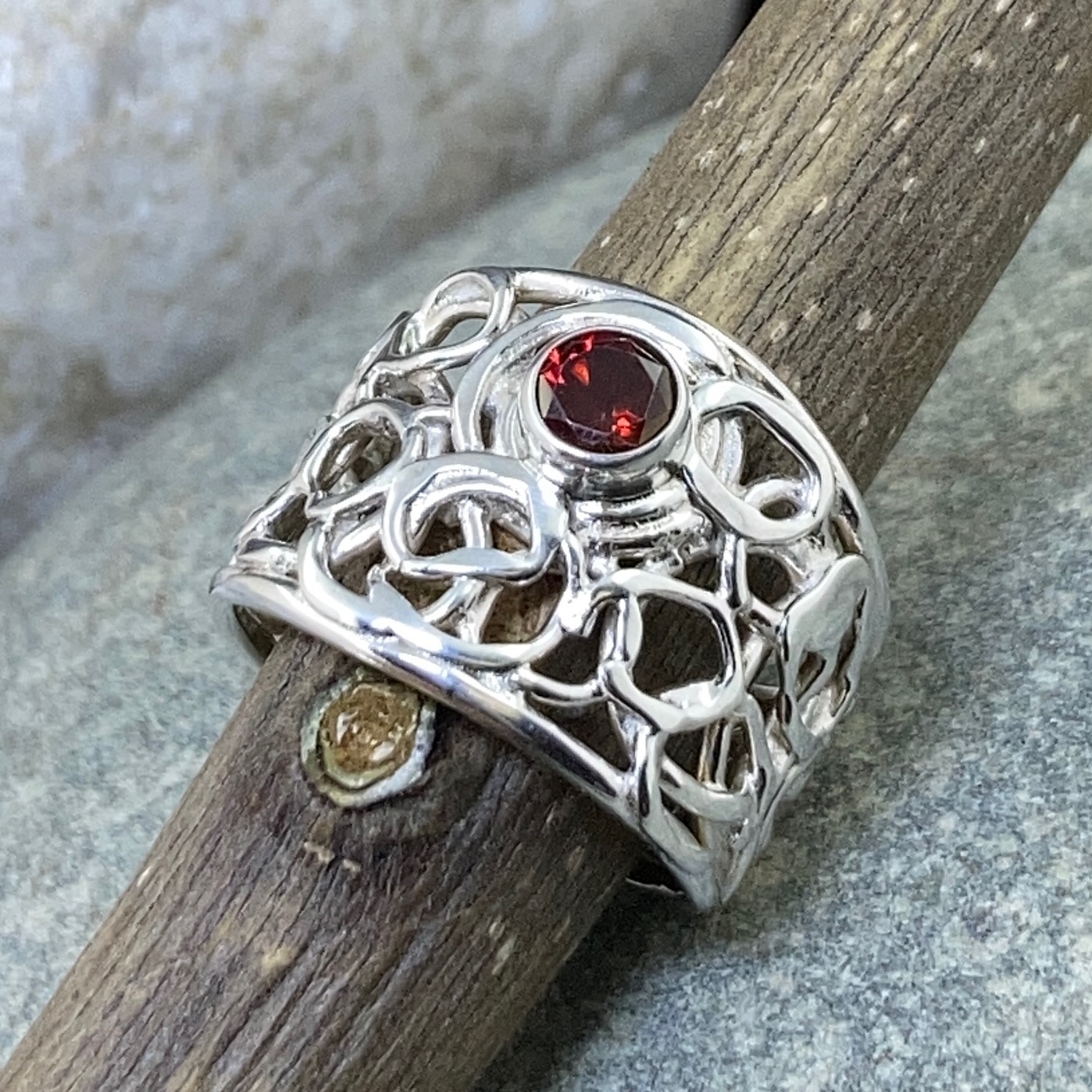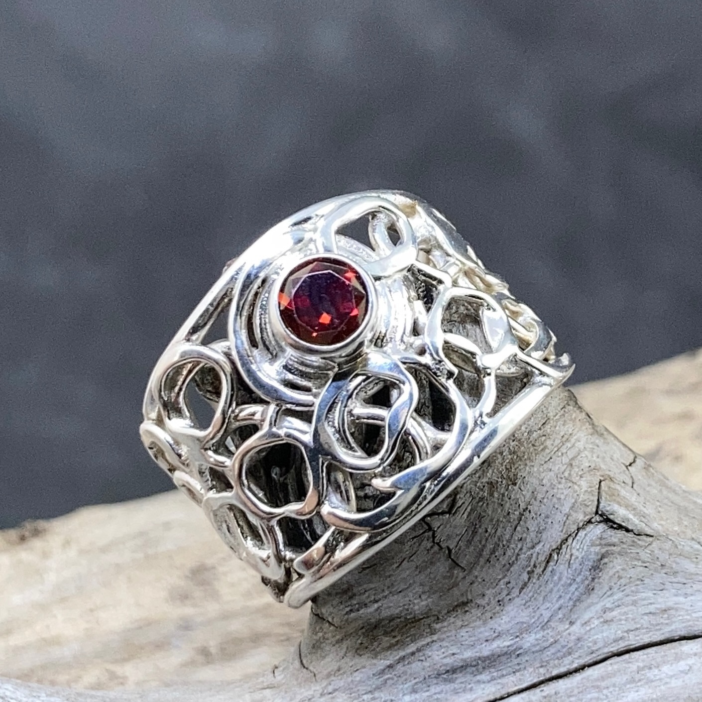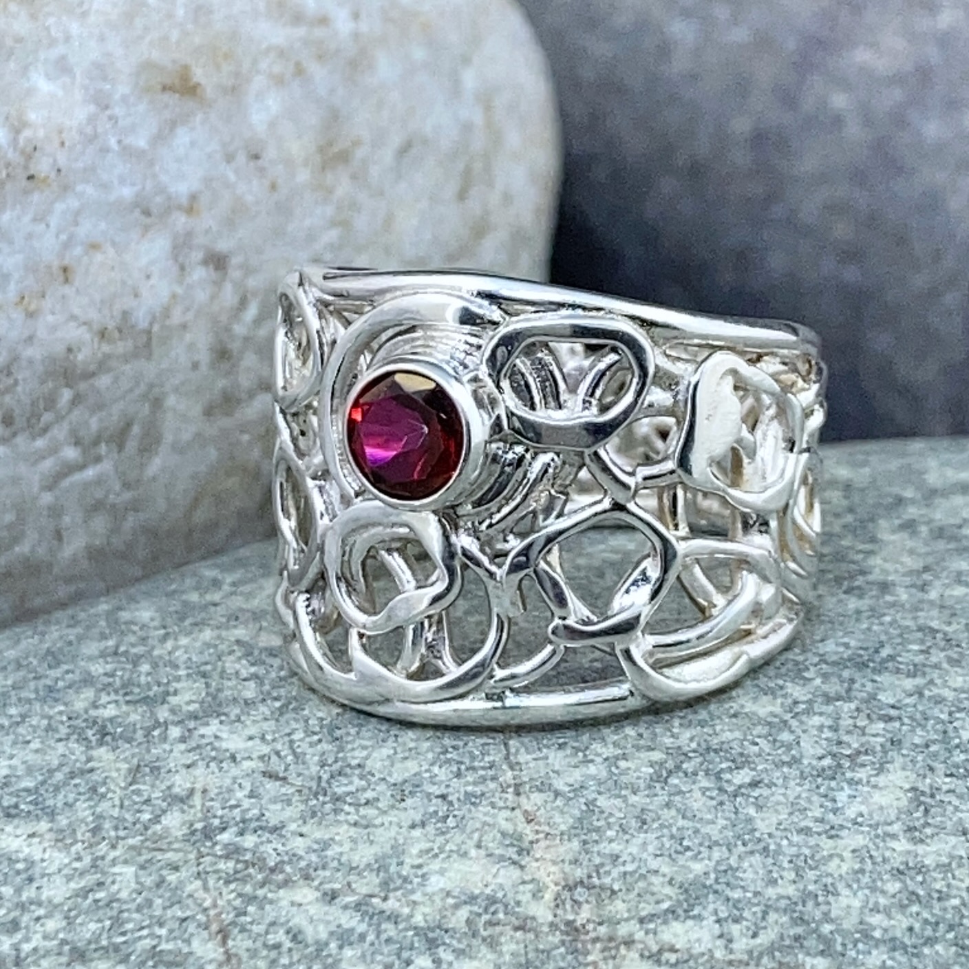The Red Topaz Ring Size 6.75 Argentium Silver Pebbles holds the quiet strength of stone and earth. Layers of hollow silver pebbles are fused together in a natural, uneven pattern, and a 0.5-carat Red Topaz adds a spark of warmth and light.