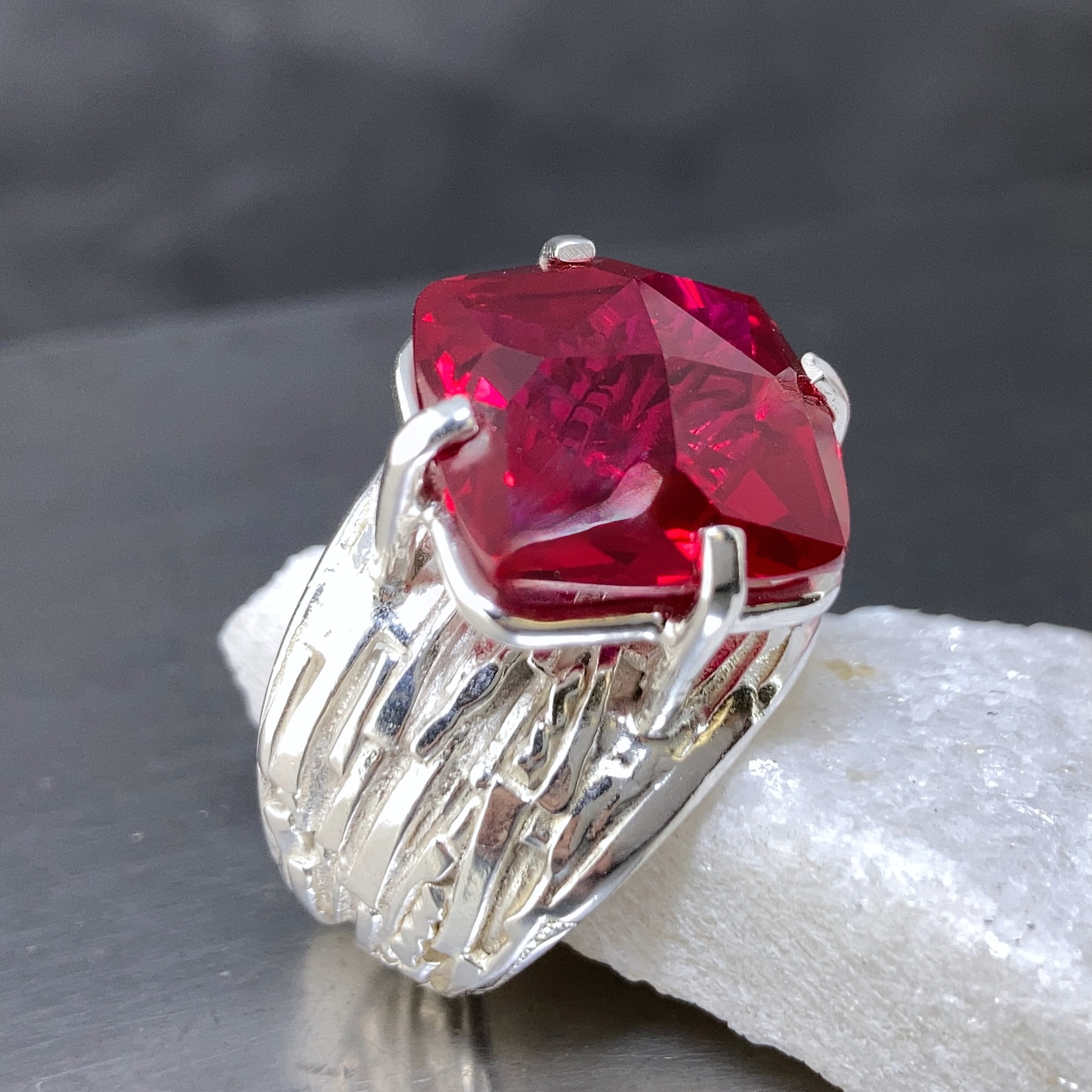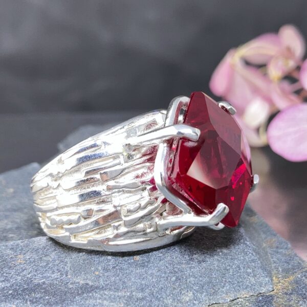 The Red Topaz Argentium Silver Ring Size 8.25 reflects the raw strength and texture of nature in the Bark design. Its deep red gemstone shines against the rugged silver, bringing fire and earth together in one form.
