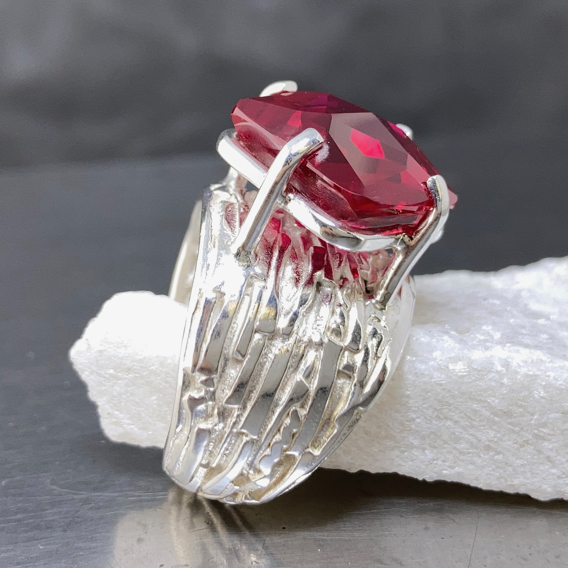 I melt and add silver layer by layer to build the texture of bark. Once the pattern feels balanced and alive, I refine and polish the high points to catch the light. The Red Topaz is then prong set to lift its brilliance above the textured surface. The result is a bold, elemental ring — grounded, radiant, and full of energy.