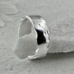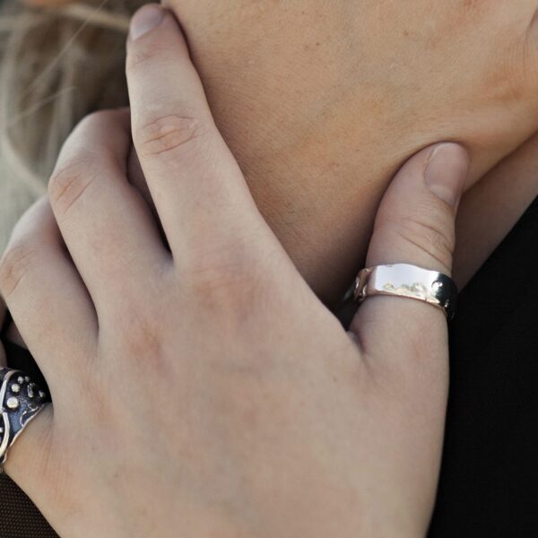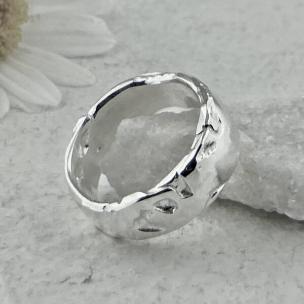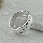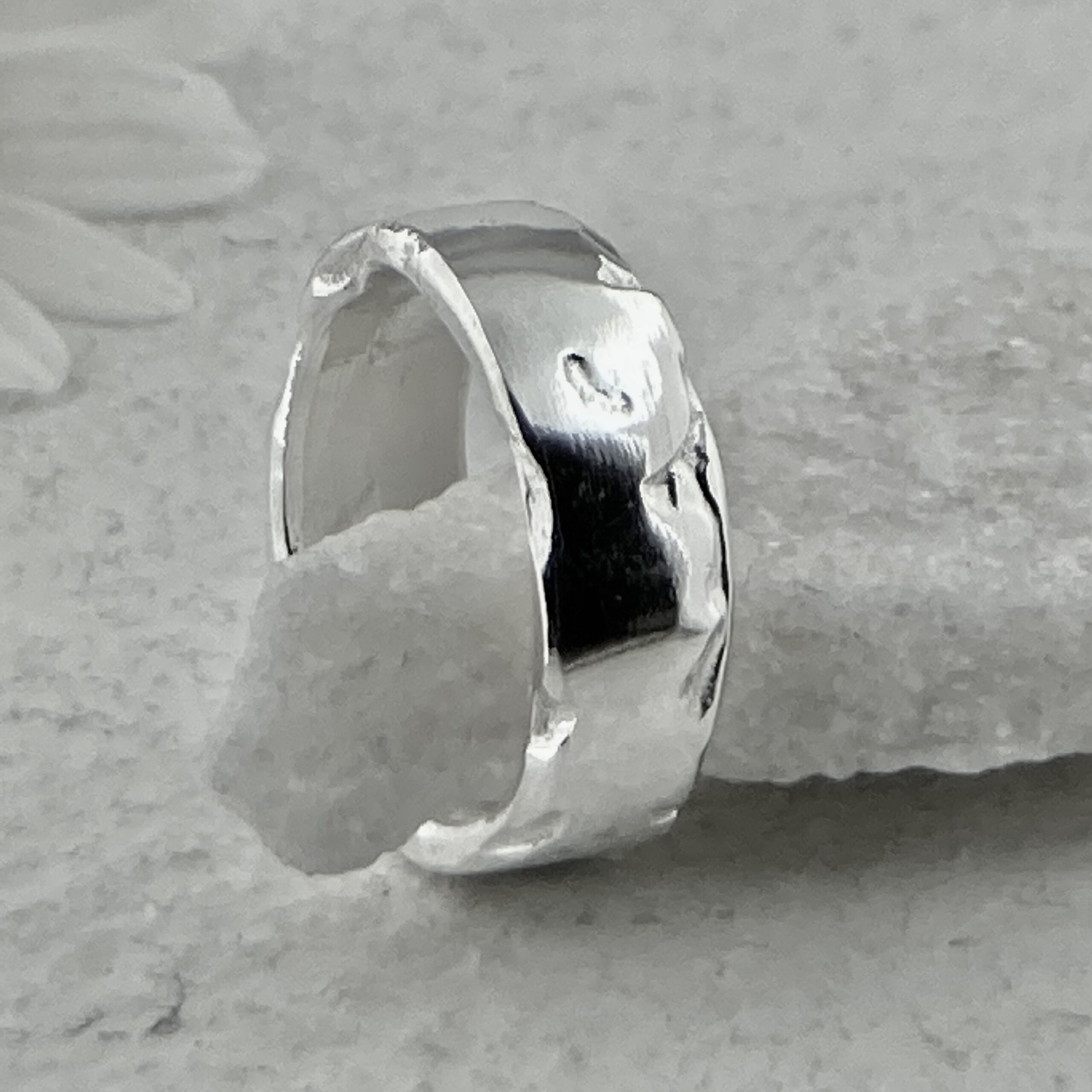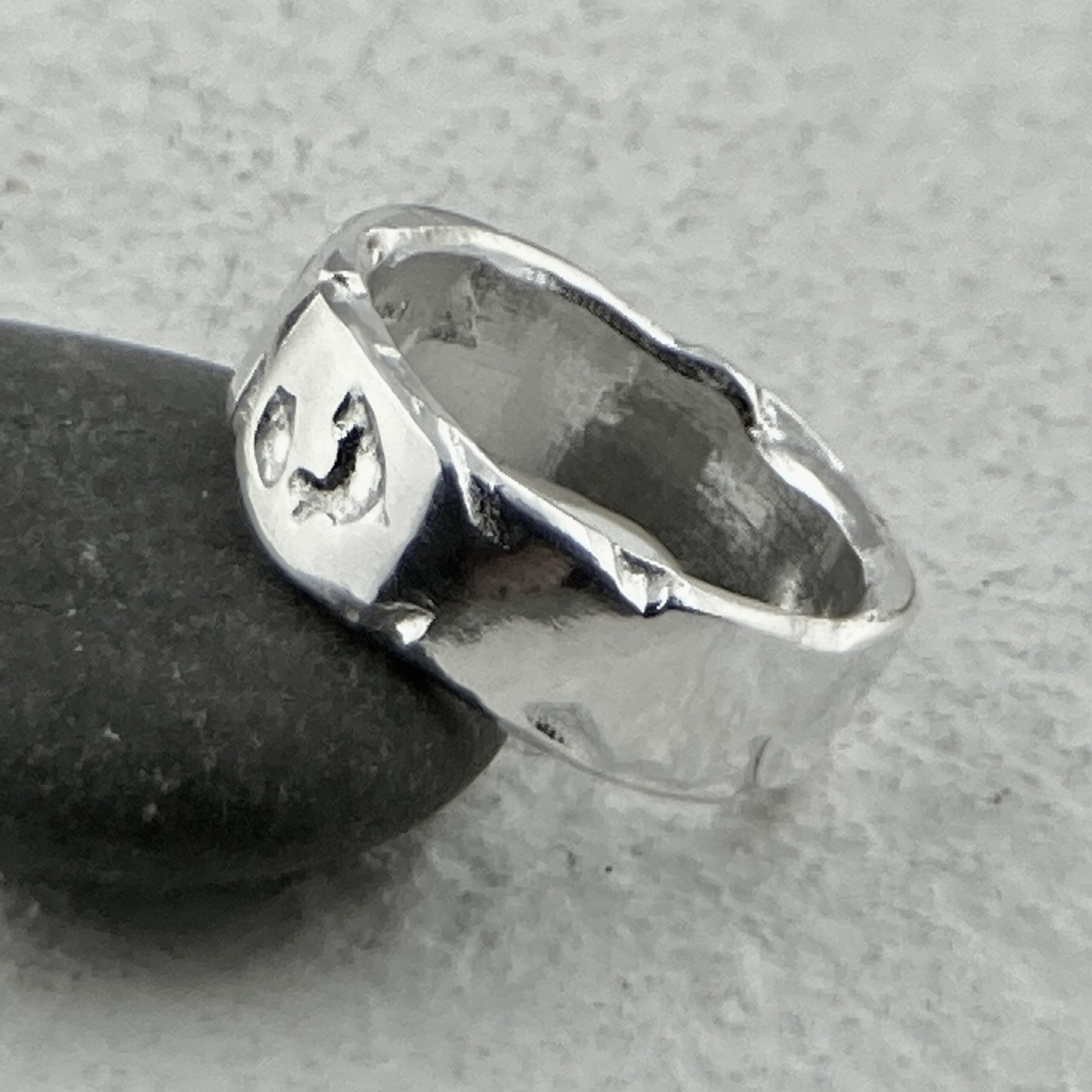 This is our River design band – the smooth flowing centre of the river with the more turbulent, disturbed water along the shores. This ring is a size 9.75 – as you can see, great as a thumb ring – also great for men! Very solid – lots of silver.