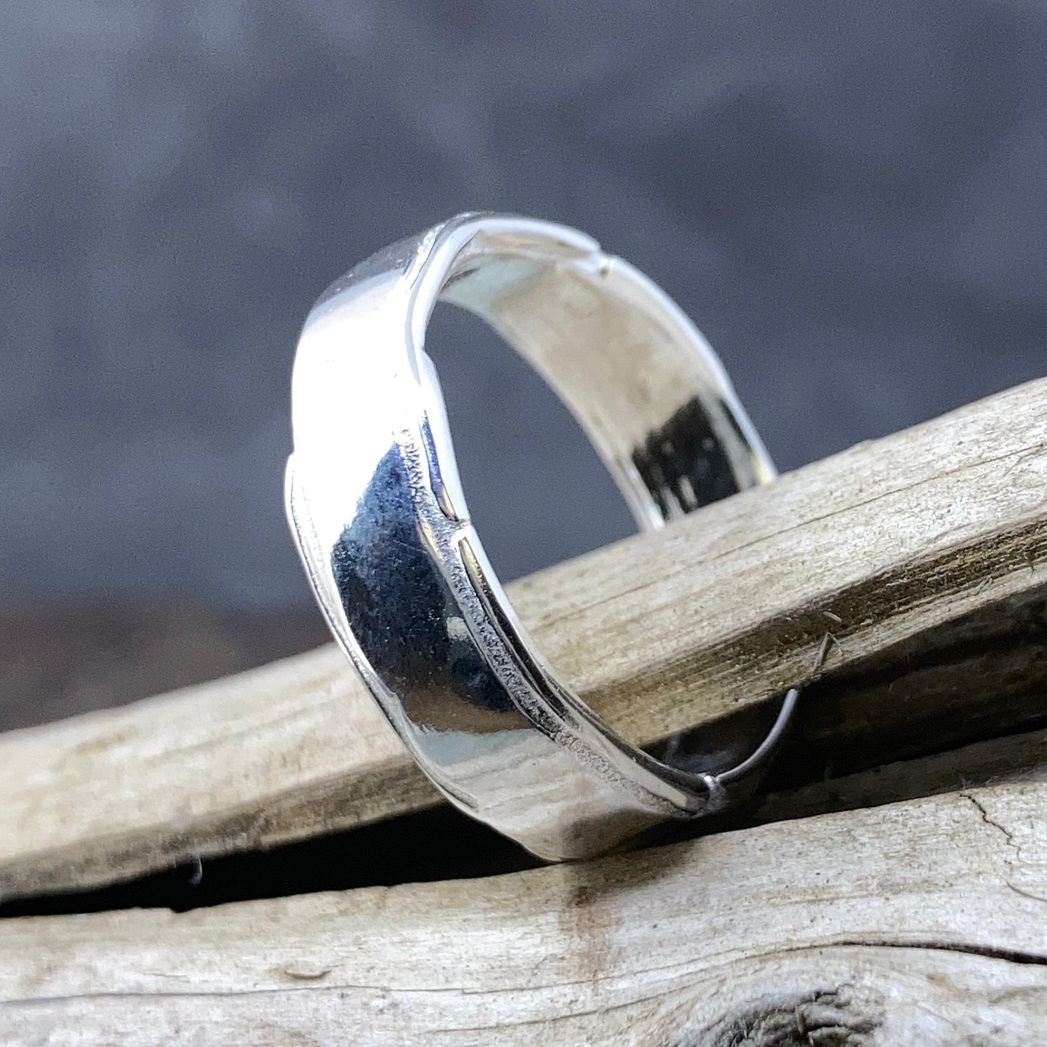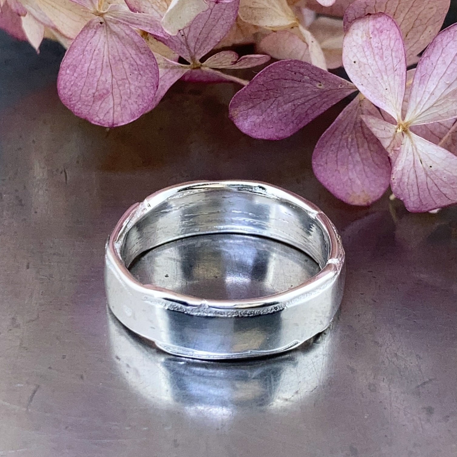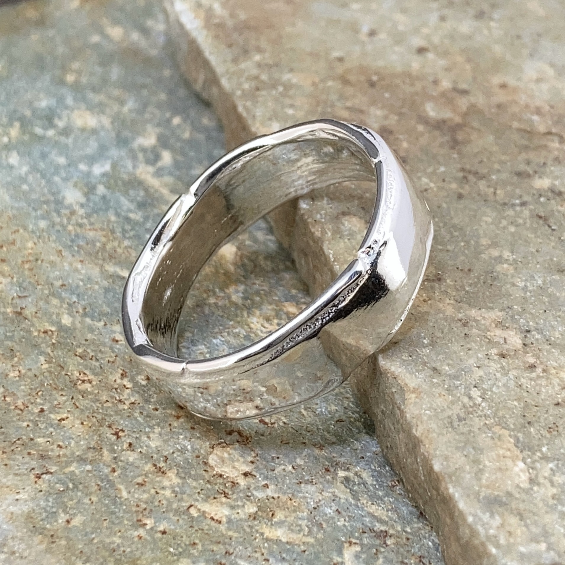 The River Ring is one of my newest endeavours.  I melt Argentium silver pieces until they are liquid, and pour this molten silver into a long rectangle shape.  Then, with lots of annealing and rolling, I slowly form a long ring form.  More annealing to bend this heavy piece of silver into a ring shape.  Then fuse the ends together, and the hammering and grinding can start.  Pretty soon I have a rough ring – which I love.  I only polish out the middle – the rough, untamed edges are what I am looking for.  I call it River because it seems all calm and serene in the middle, but on the edges, where the water meets the land, is where you can see the turbulent waters.