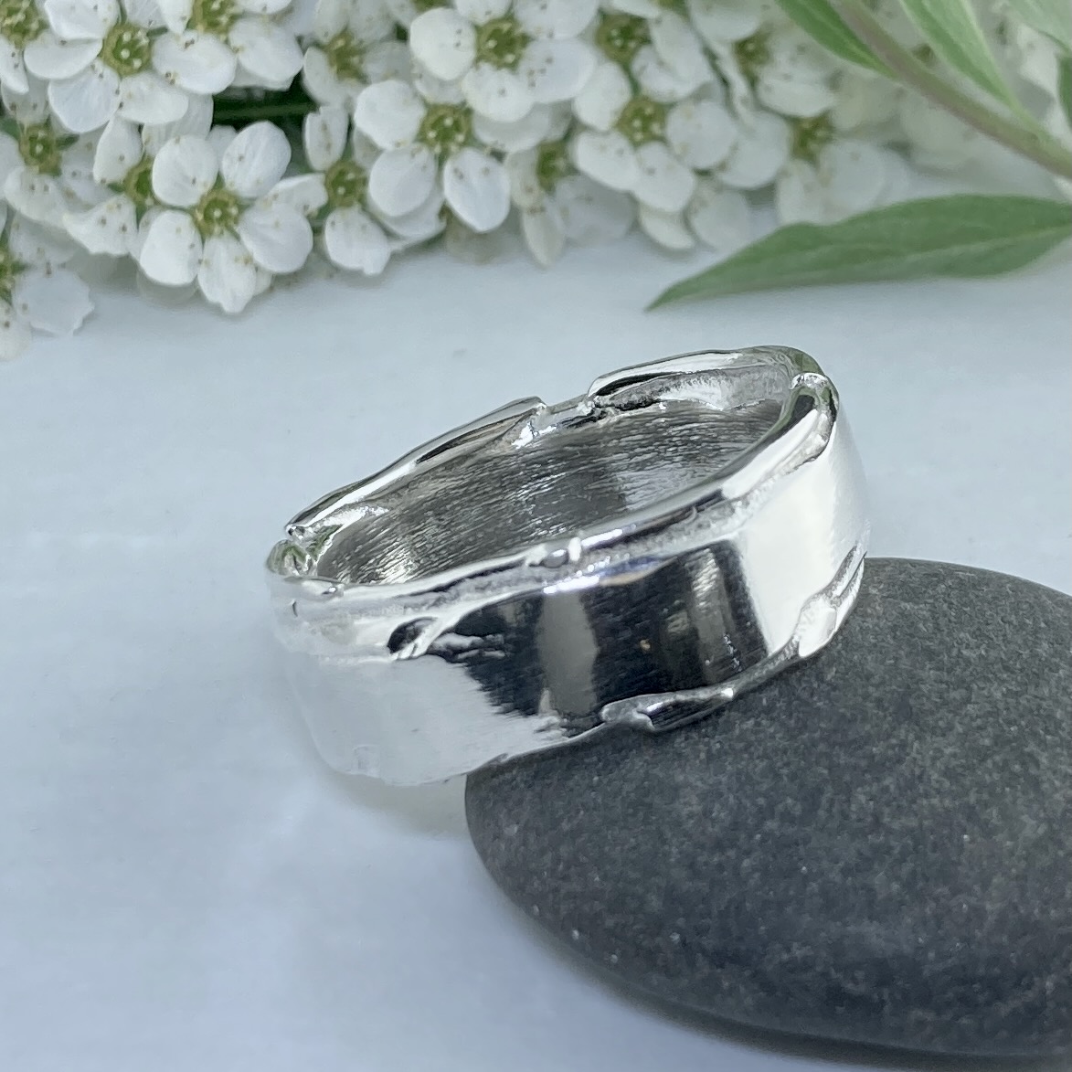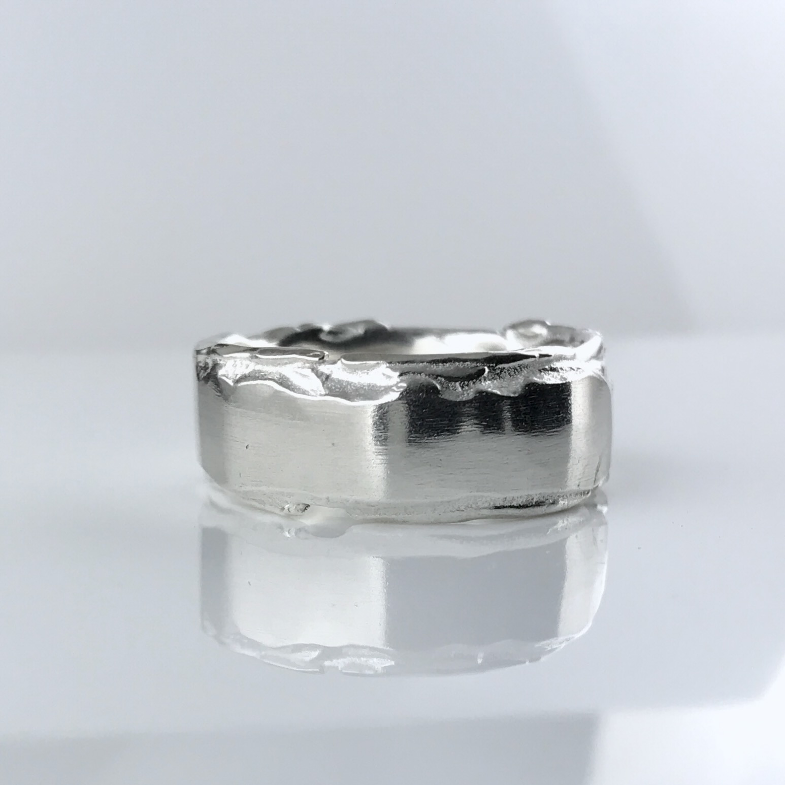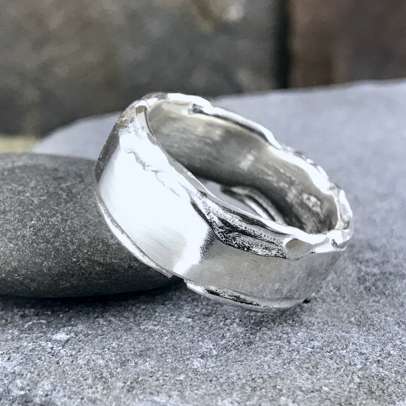 The River Ring is one of my newest endeavours.  I melt Argentium silver pieces until they are liquid, and pour this molten silver into a long rectangle shape.  Then, with lots of annealing and rolling, I slowly form a long ring form.  More annealing to bend this heavy piece of silver into a ring shape.  Then fuse the ends together, and the hammering and grinding can start.  Pretty soon I have a rough ring – which I love.  I only polish out the middle – the rough, untamed edges are what I am looking for.  I call it River because it seems all calm and serene in the middle, but on the edges, where the water meets the land, is where you can see the turbulent waters.