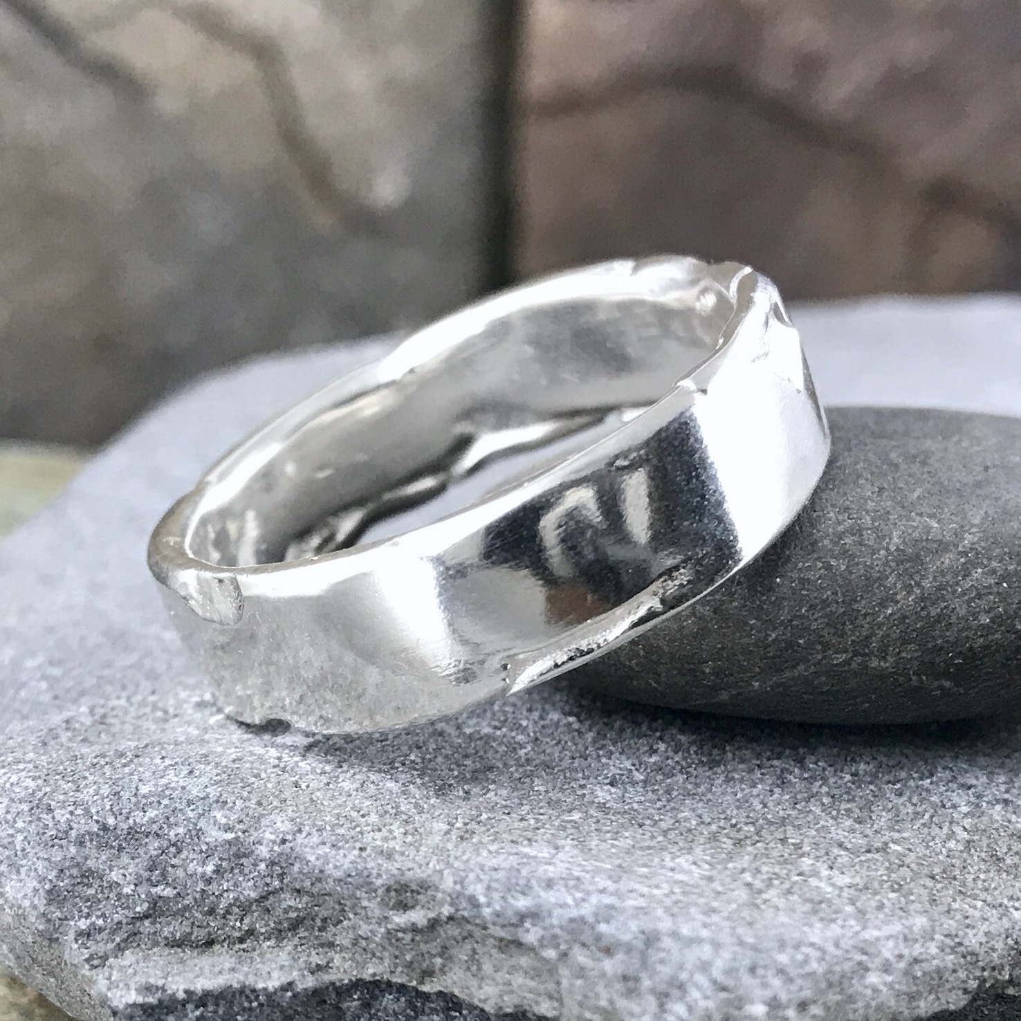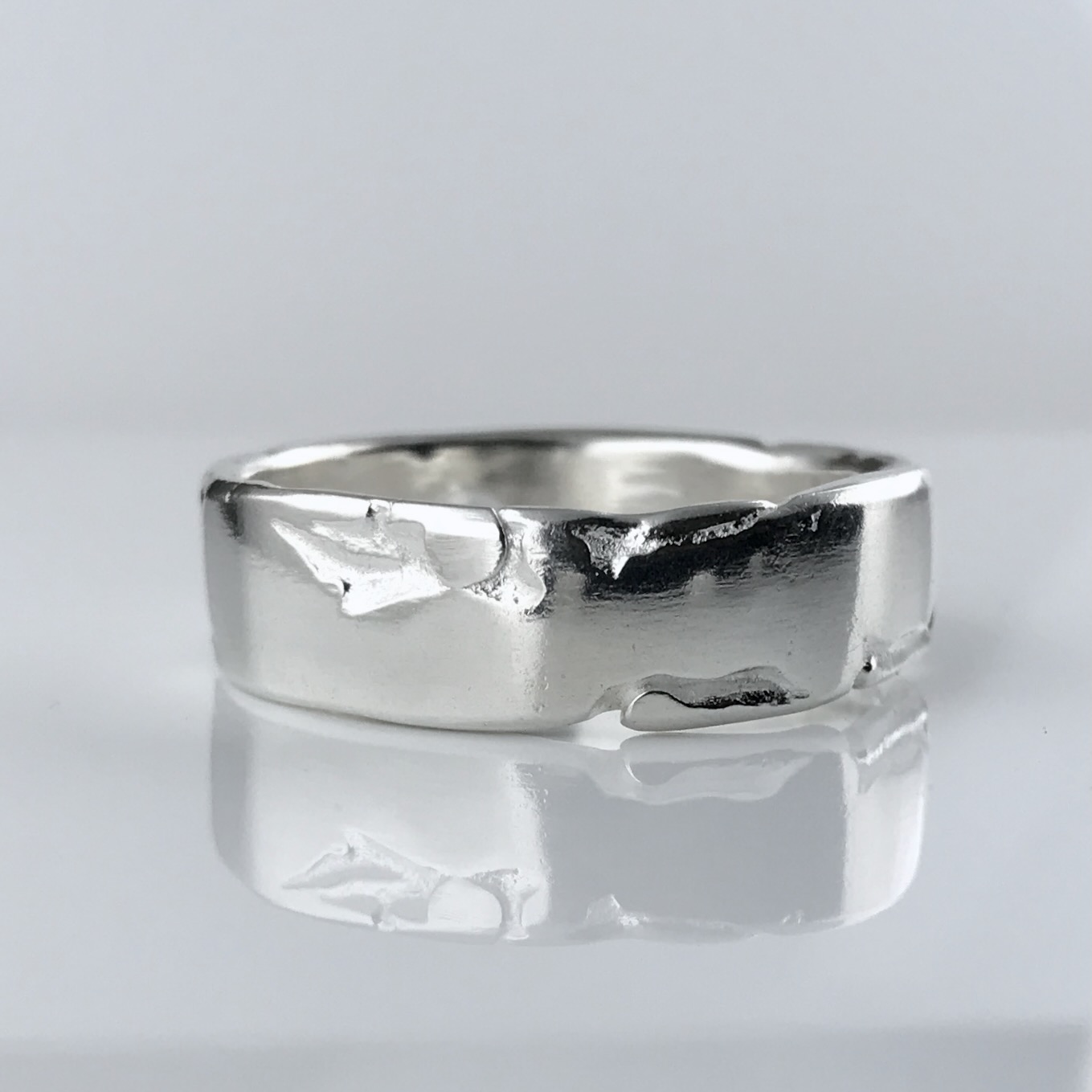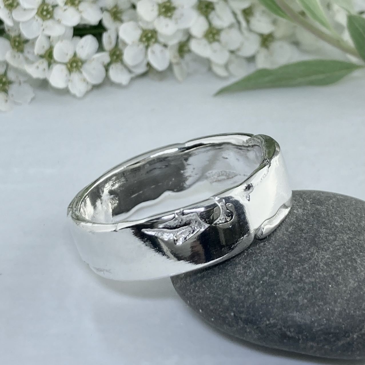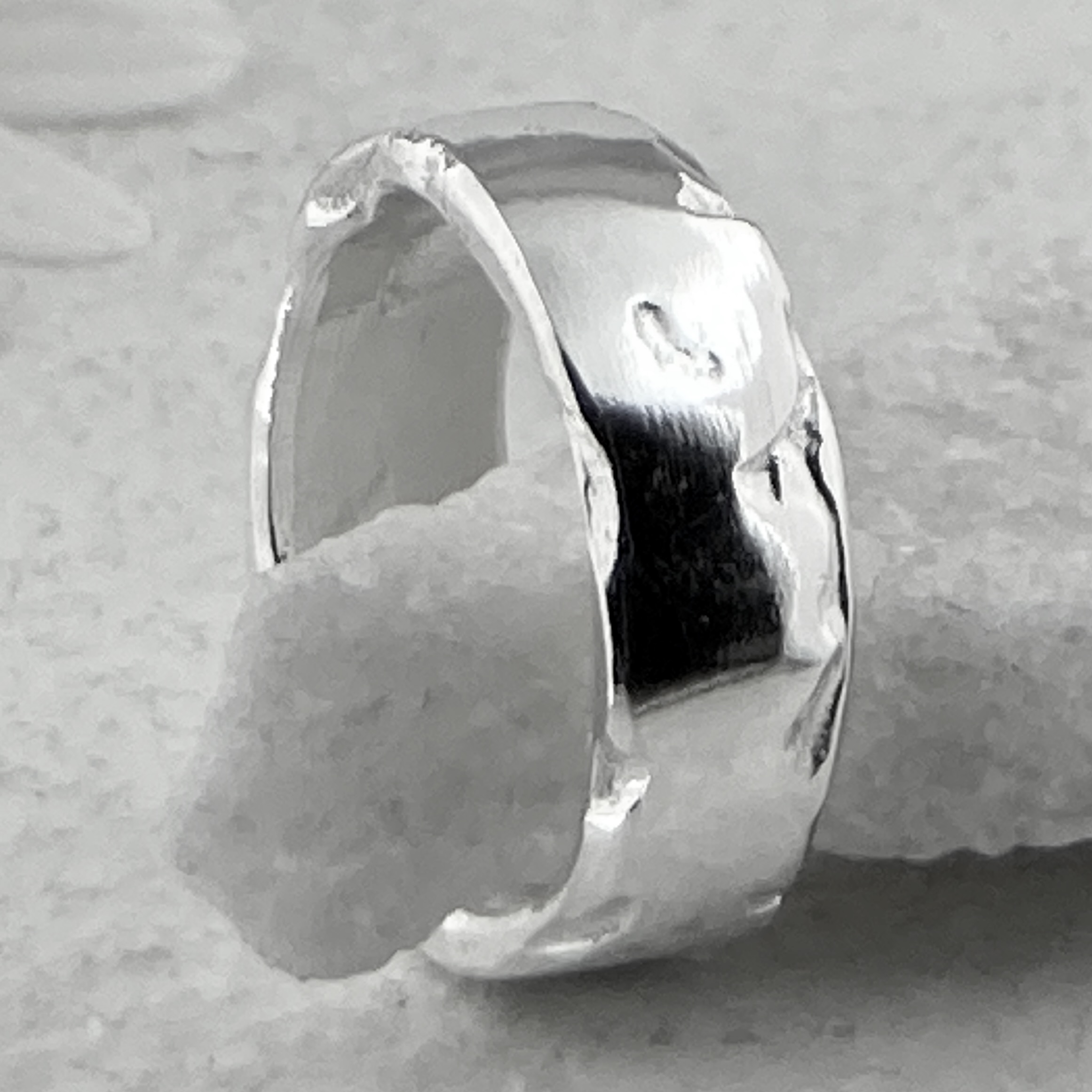 The River Ring is one of my newest endeavours.  I melt Argentium silver pieces until they are liquid, and pour this molten silver into a long rectangle shape.  Then, with lots of annealing and rolling, I slowly form a long ring form.  More annealing to bend this heavy piece of silver into a ring shape.  Then fuse the ends together, and the hammering and grinding can start.  Pretty soon I have a rough ring – which I love.  I only polish out the middle – the rough, untamed edges are what I am looking for.  I call it River because it seems all calm and serene in the middle, but on the edges, where the water meets the land, is where you can see the turbulent waters.