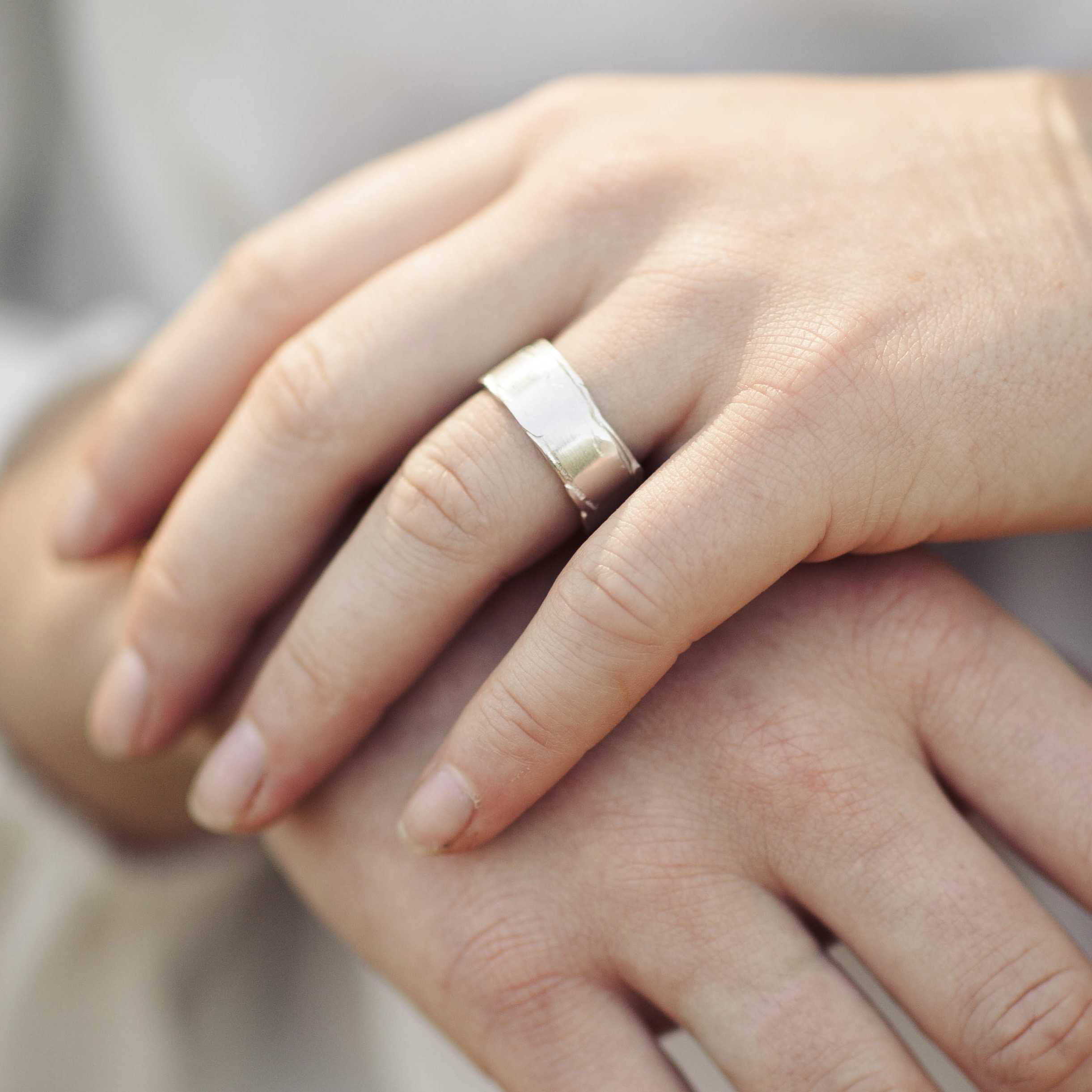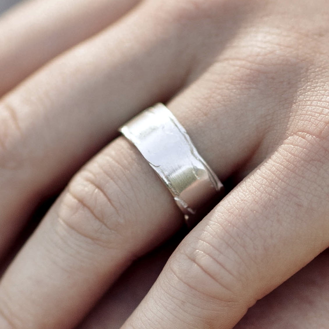 The River Ring is one of my newest endeavours. I melt argentium silver pieces until they are liquid, and pour this molten silver into a long rectangle shape. Then, with lots of annealing and rolling, I slowly form a long ring form. More annealing to bend this heavy piece of silver into a ring shape. Then fuse the ends together, and the hammering and grinding can start. Pretty soon I have a rough ring – which I love. I only polish out the middle – the rough, untamed edges are what I am looking for. I call it River because it seems all calm and serene in the middle, but on the edges, where the water meets the land, is where you can see the turbulent waters. This ring is .9 cm wide all the way around, and is a size 9.5