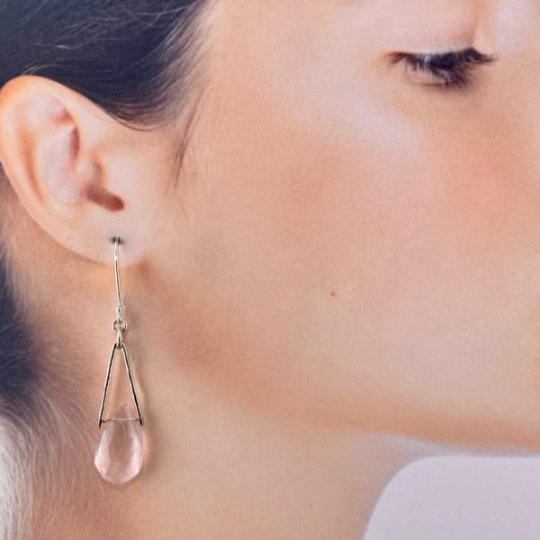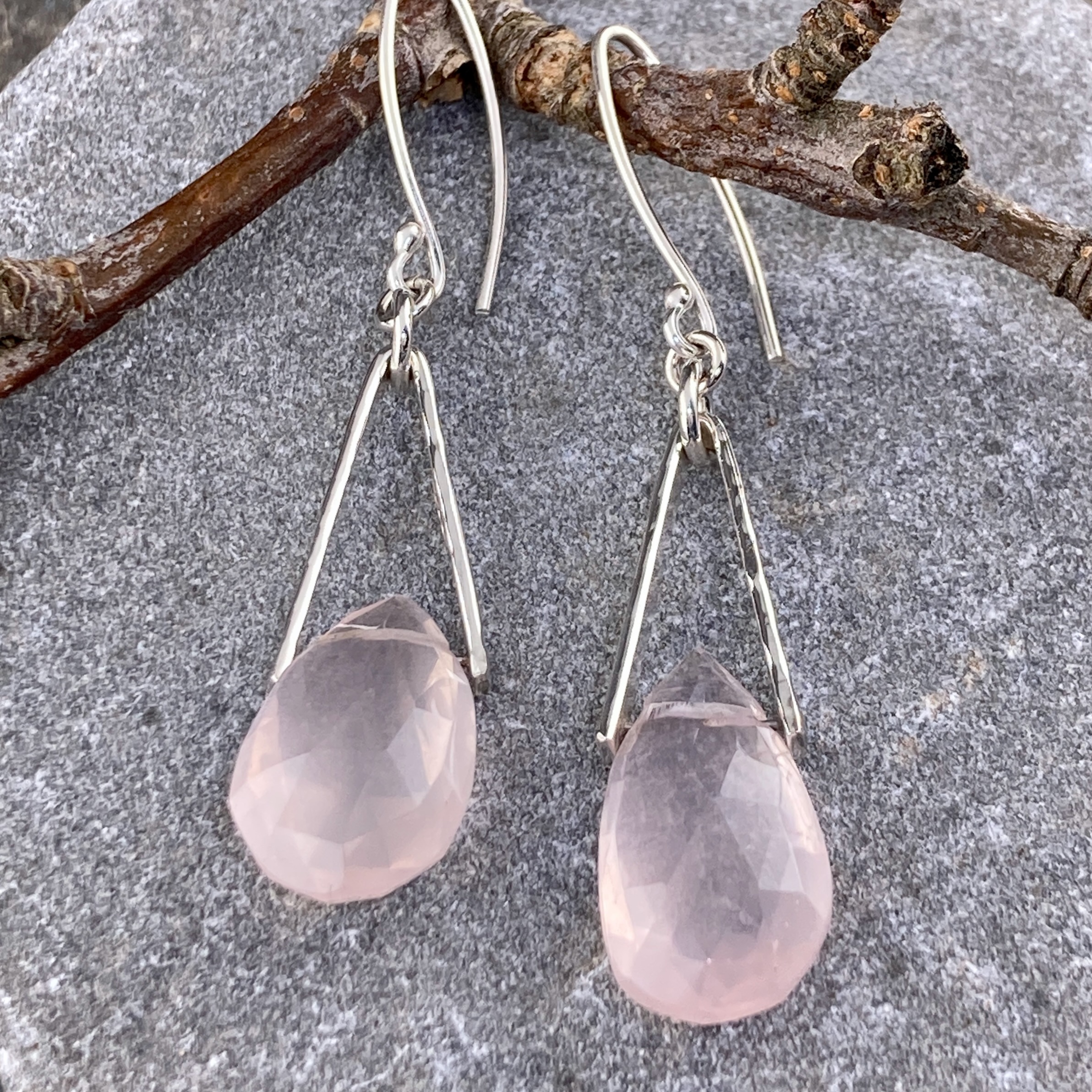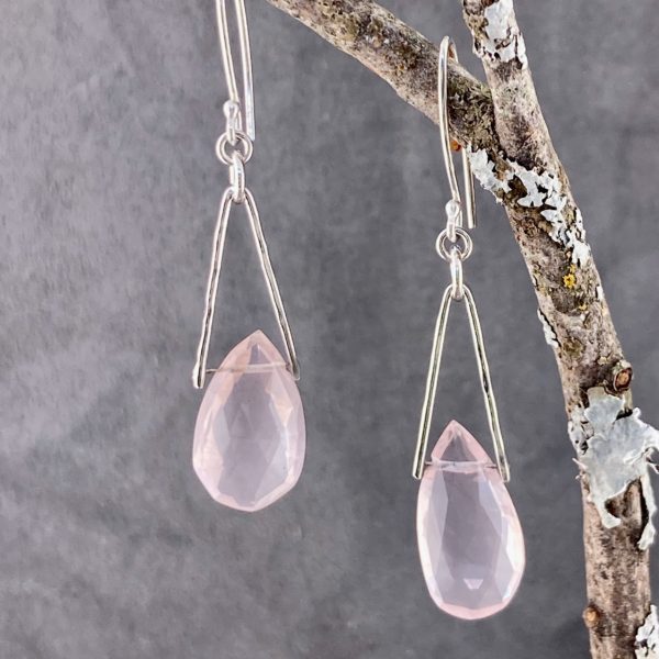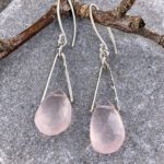 rose quartz on V bail – long ear wire. Facetted Rose Quartz teardrops on a hand hammered V bail. These earrings have the long Argentium silver earwires. All natural stones.