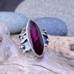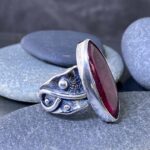 This ruby is unusually large, with natural inclusions that give it character and depth. The cabochon marquise cut shows off its translucent glow, while the silver bezel keeps the gem secure without interrupting the shape’s graceful flow.