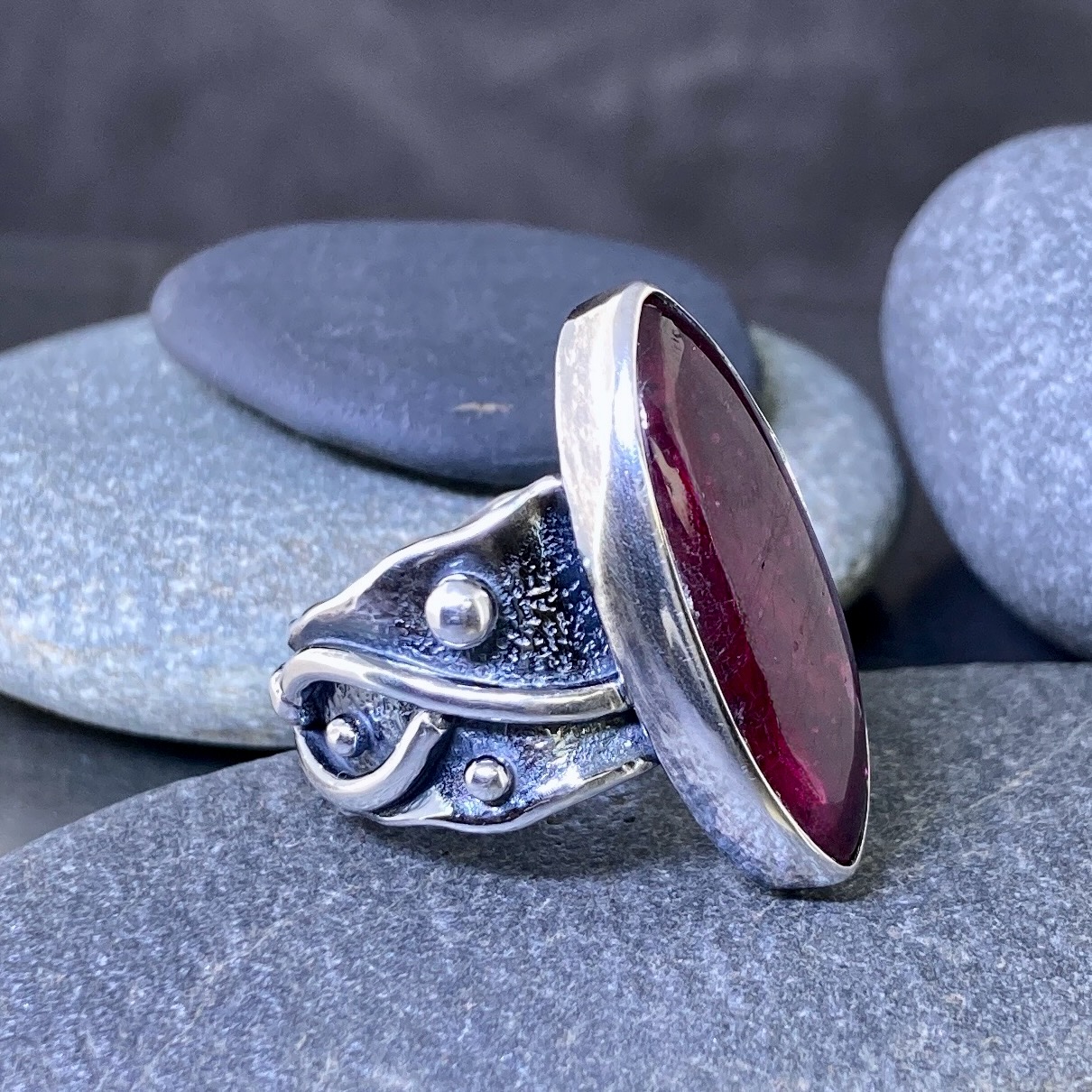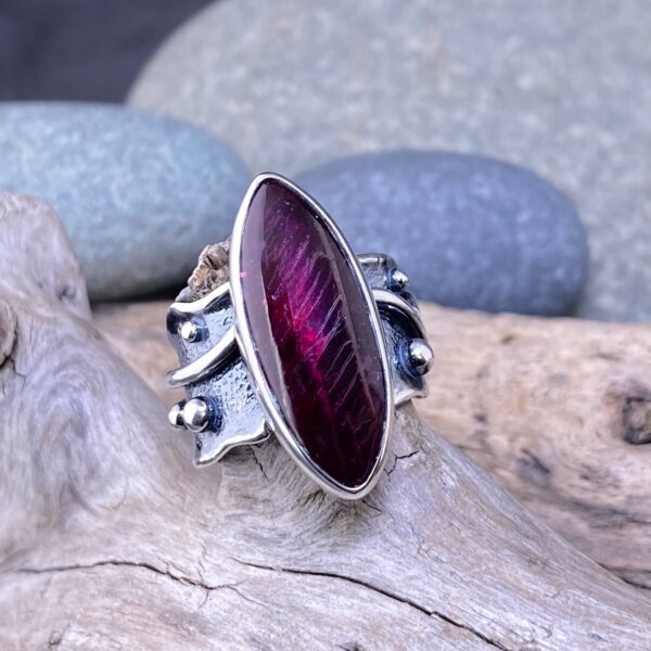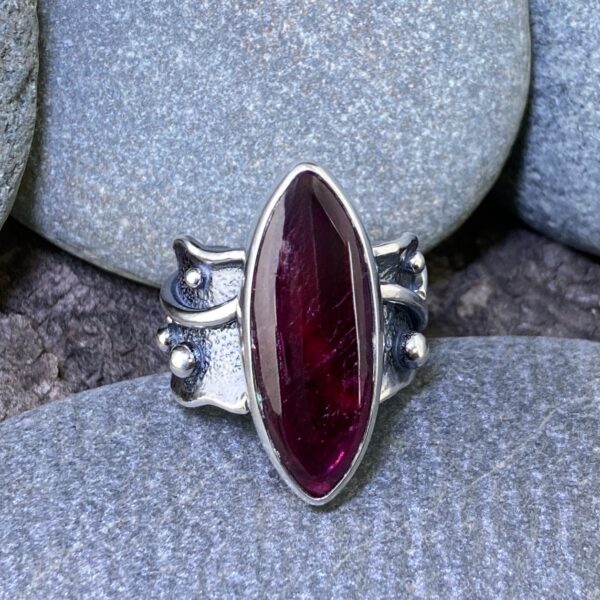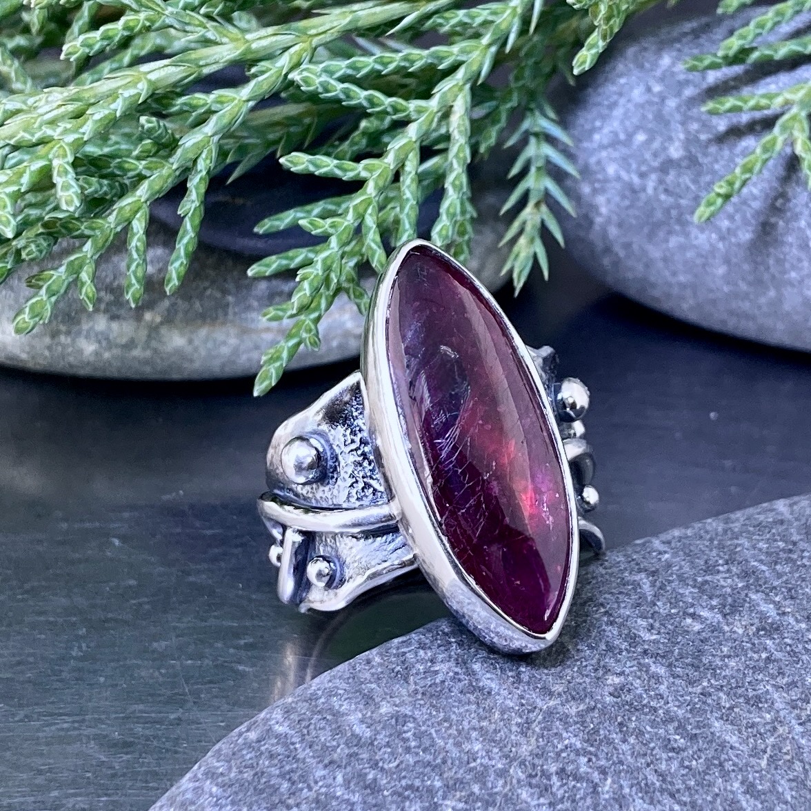 The Ruby Ring Size 6.75 Argentium Silver Waves combines movement and depth. I crafted this piece in flowing lines of solid Argentium silver, shaped to echo the rhythm of water. The large 10.23-carat ruby, marquise-cut and cabochon-polished, glows with a deep inner warmth against the bright silver.